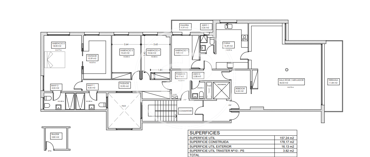 The sleeping area, fully independent, offers three exterior double bedrooms. The master suite stands out for its large walk-in wardrobe and full bathroom. The other two bedrooms share a full bathroom.