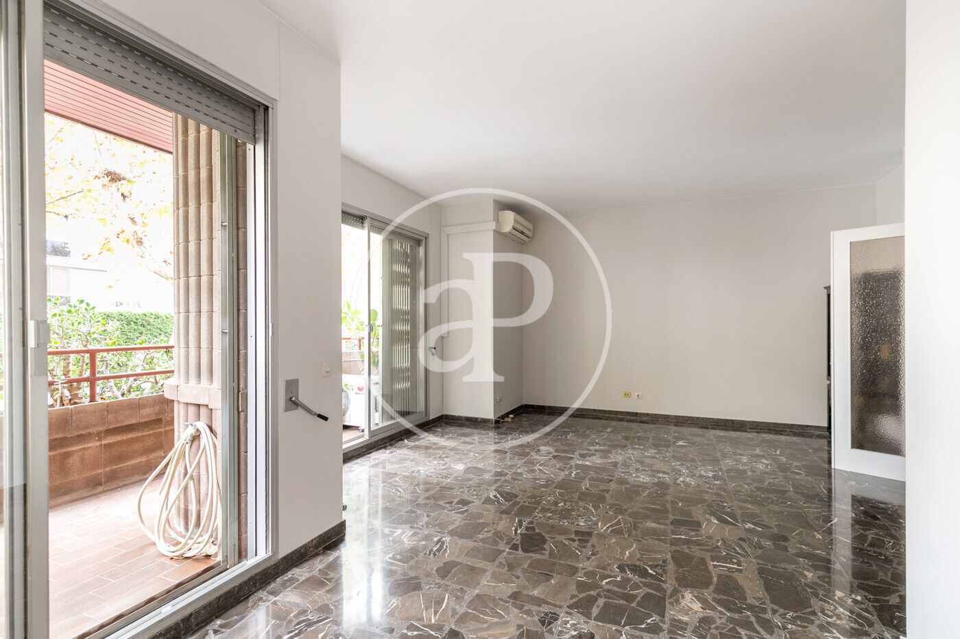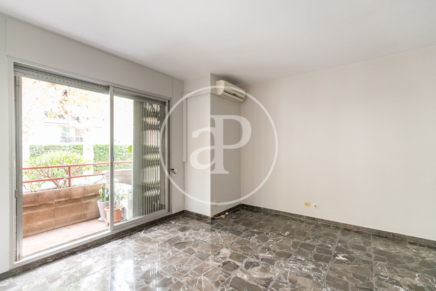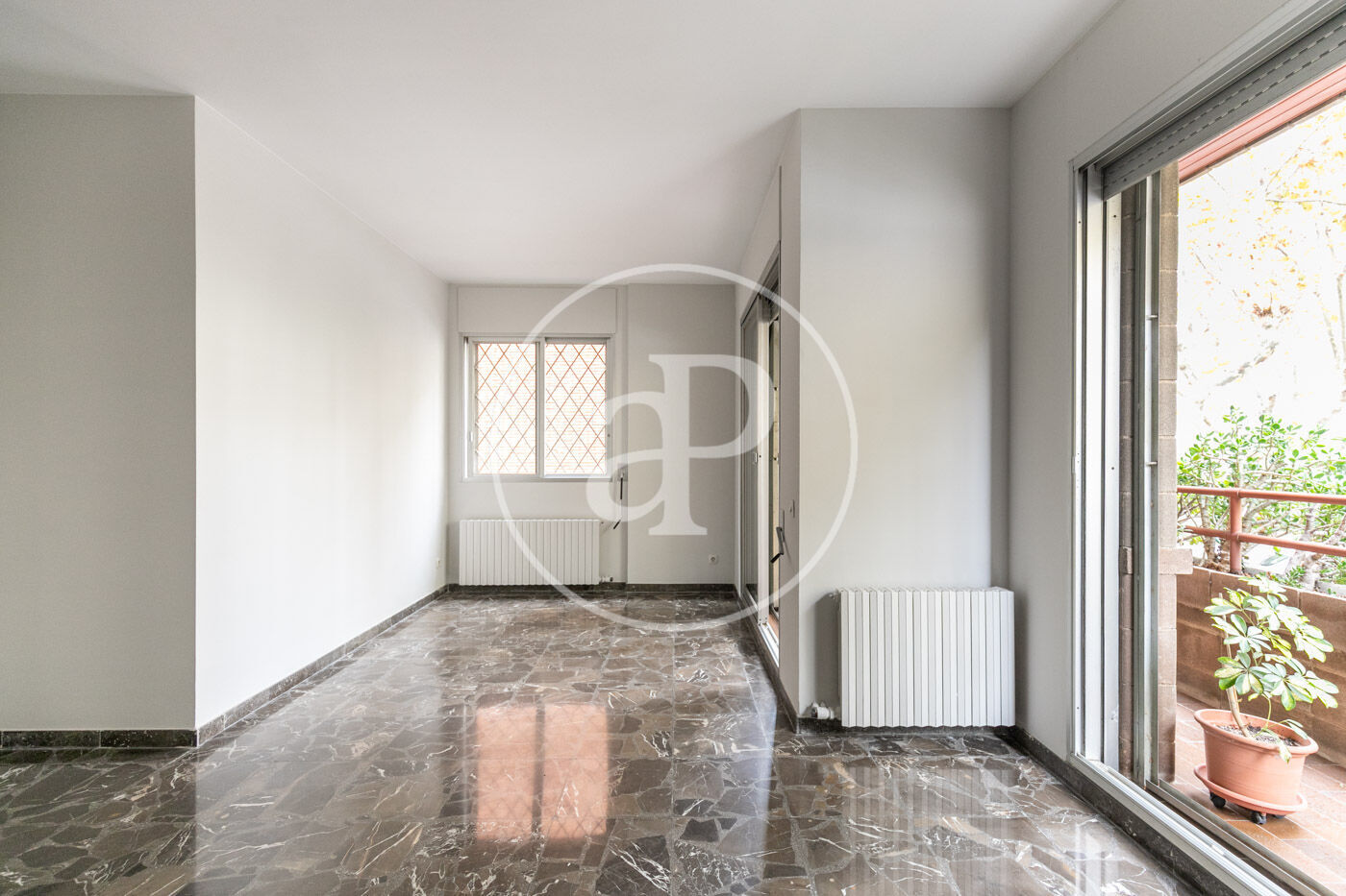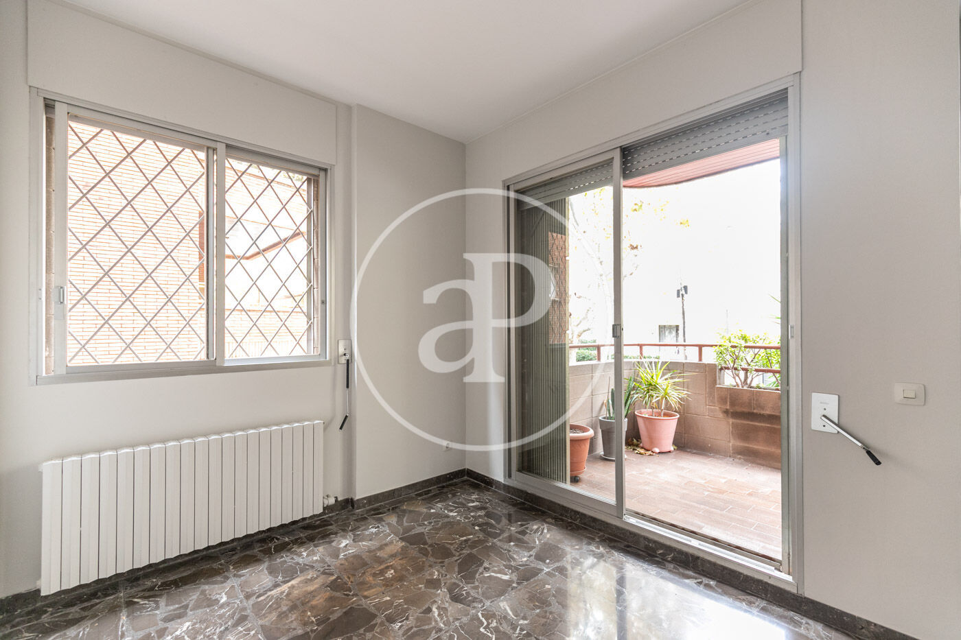 The flat has marble floors (with the option of installing parquet), air conditioning in the living room, and gas heating by radiators.