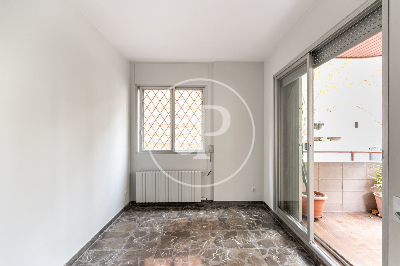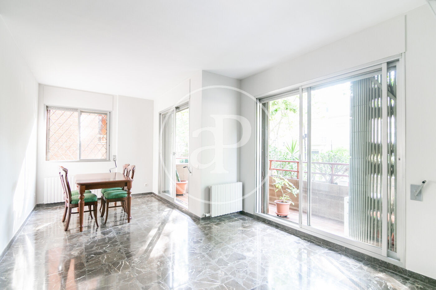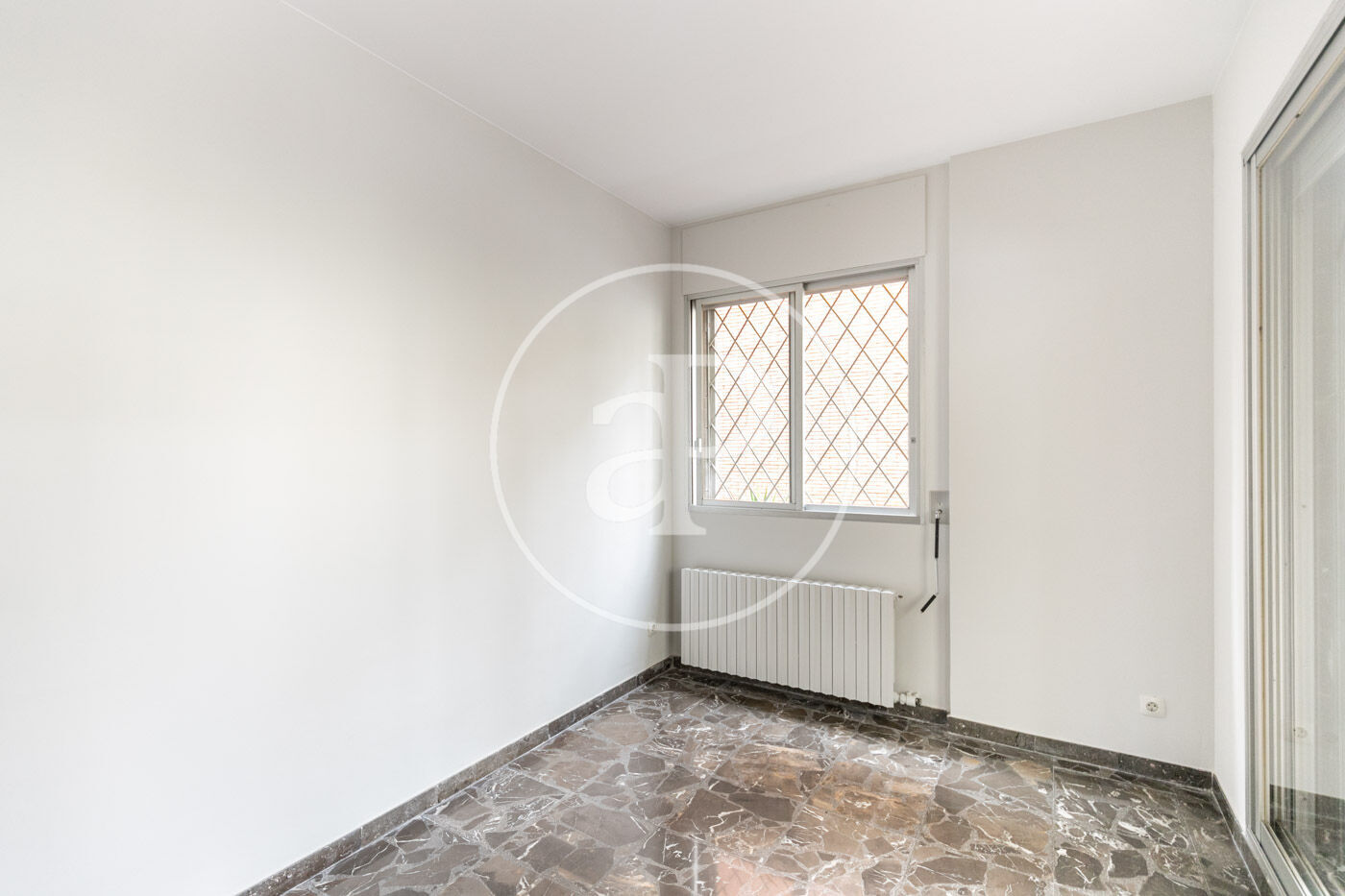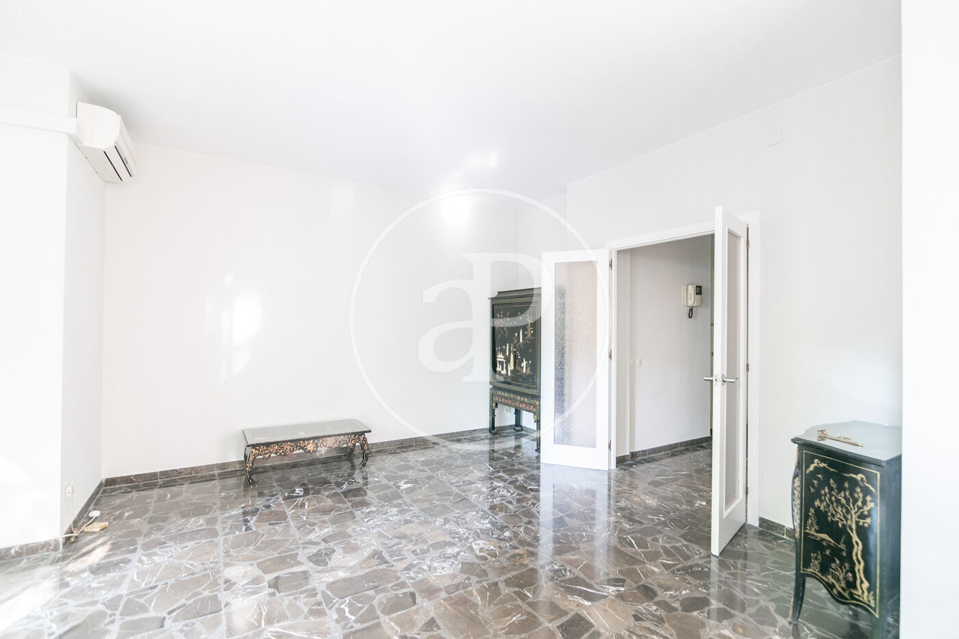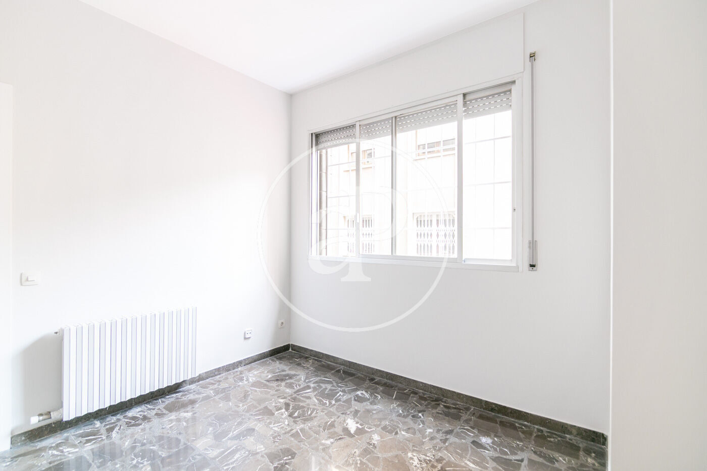The flat has marble floors (with the option of installing parquet), air conditioning in the living room, and gas heating by radiators.