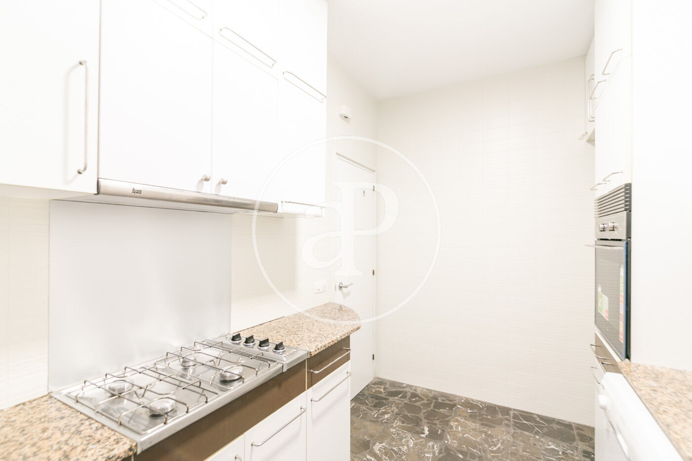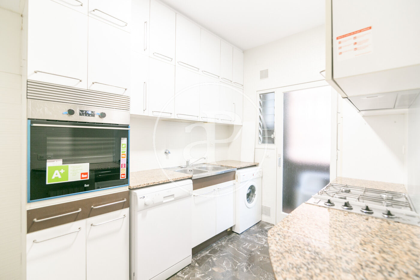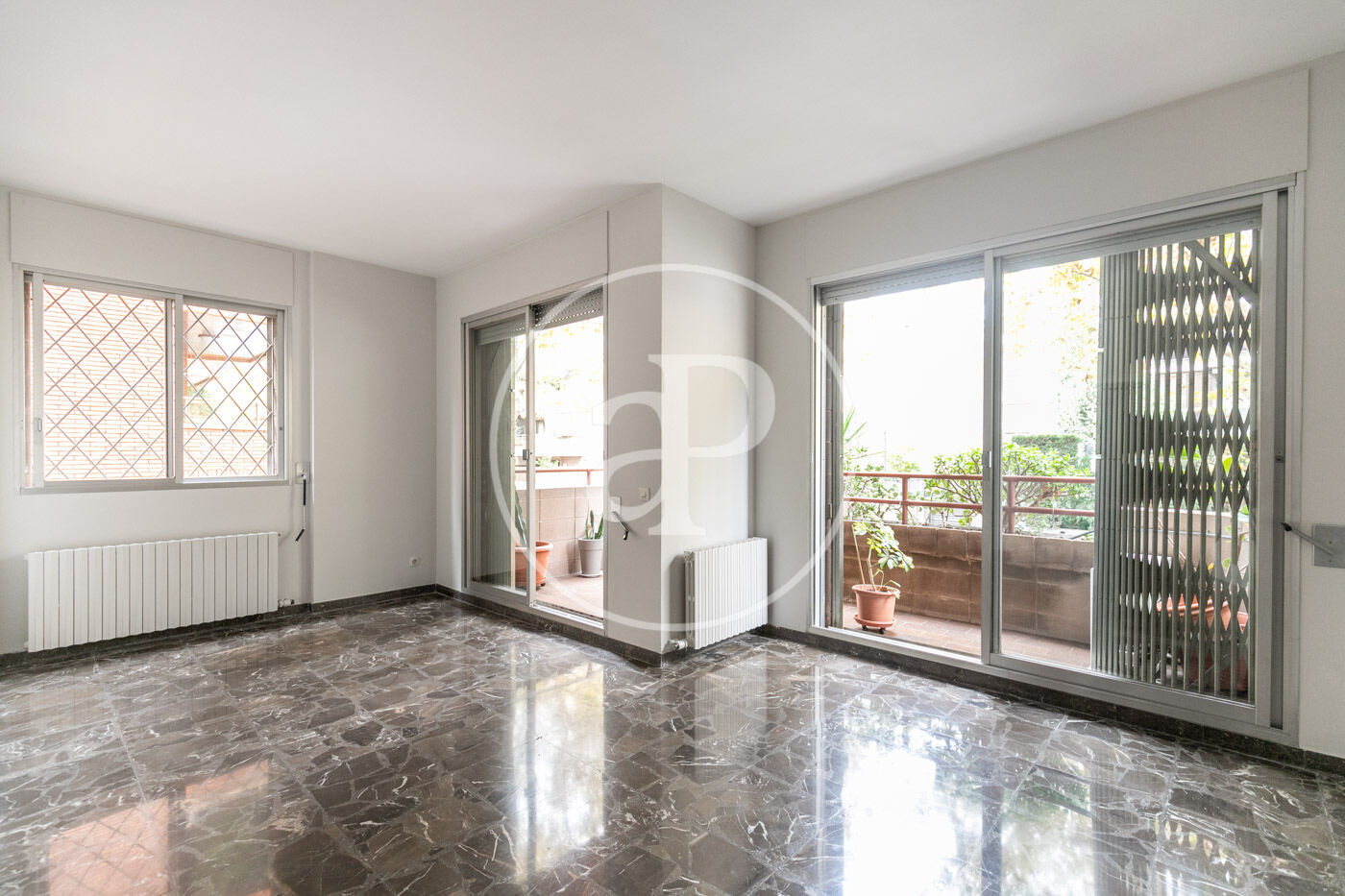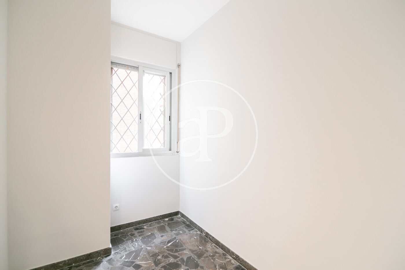 The flat has marble floors (with the option of installing parquet), air conditioning in the living room, and gas heating by radiators.