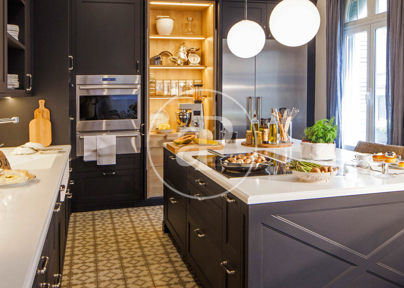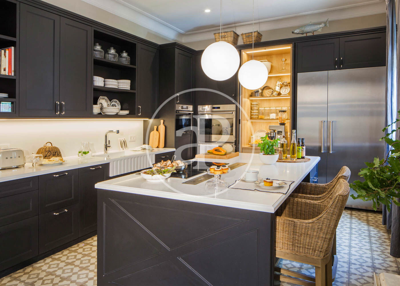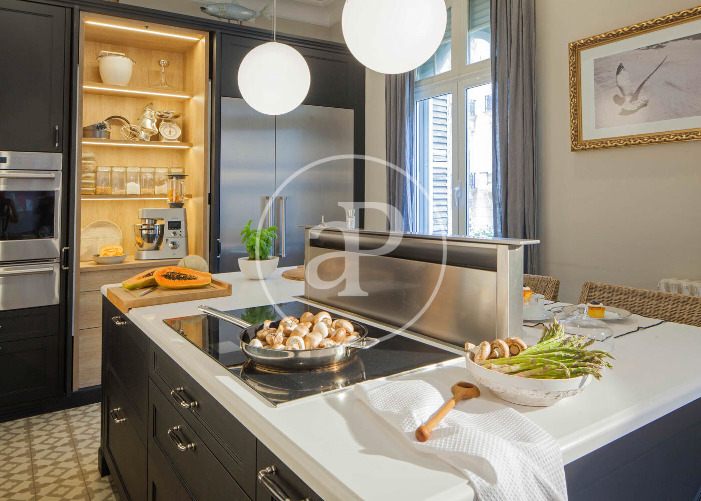 Upon entering, we find a large foyer that separates the daytime area from the nighttime area. To the right of the entrance is the bright living-dining room with access to a balcony and an open-plan kitchen. The kitchen furniture is from the renowned brand Deulonder, offering plenty of storage space and equipped with very distinctive features such as a warming drawer and a vacuum-sealing drawer. All appliances are high-end and include a double refrigerator. It also has a water purification system with temperature control ranging from cold to hot.