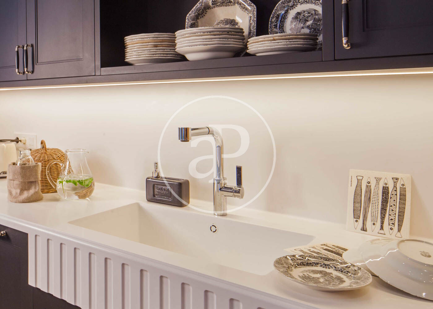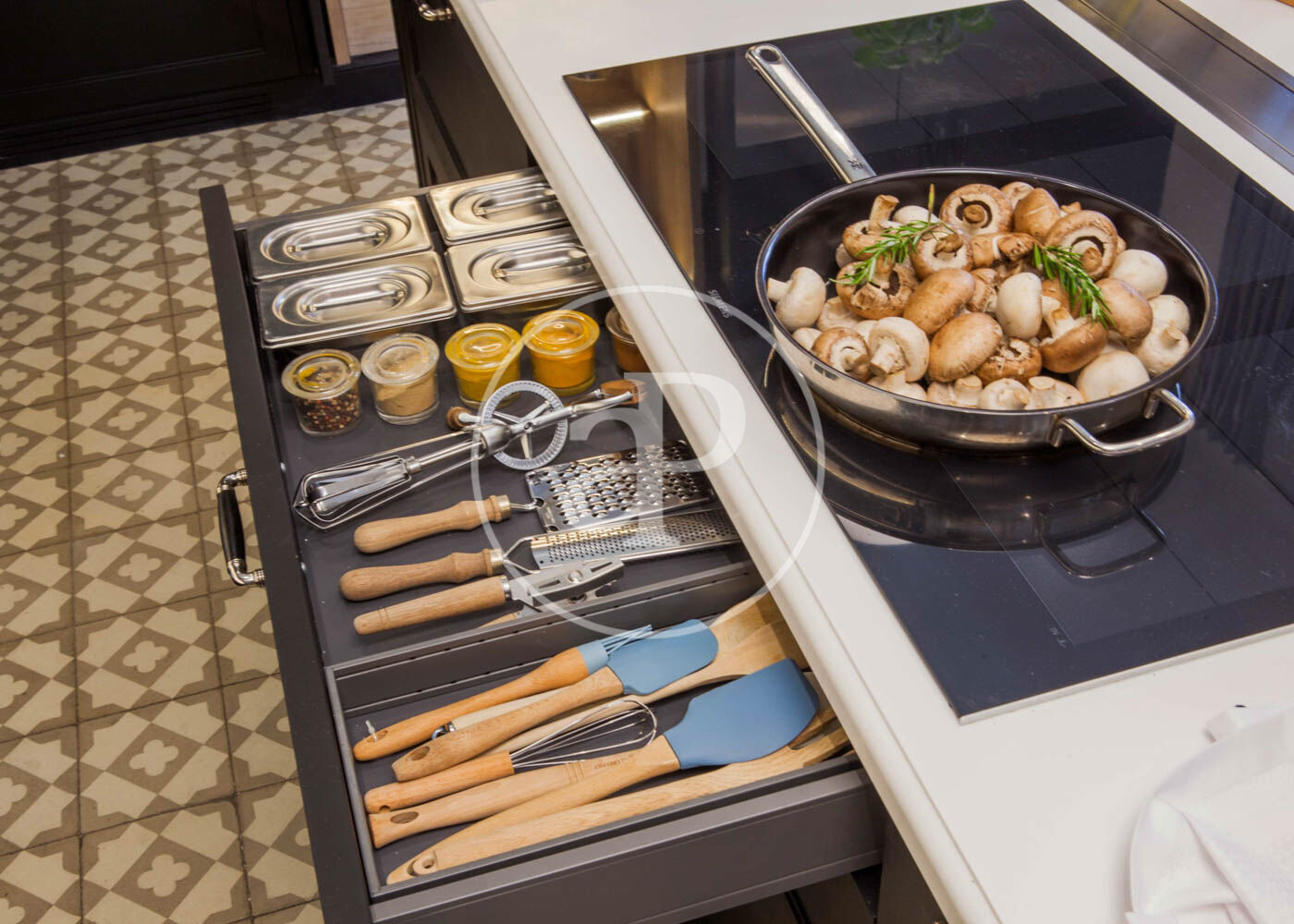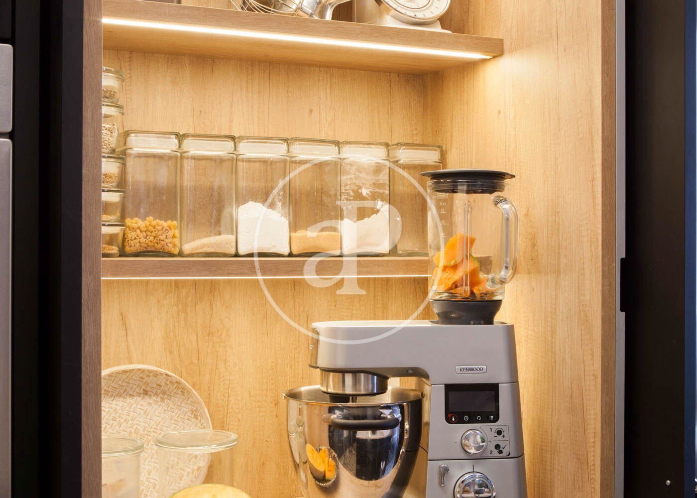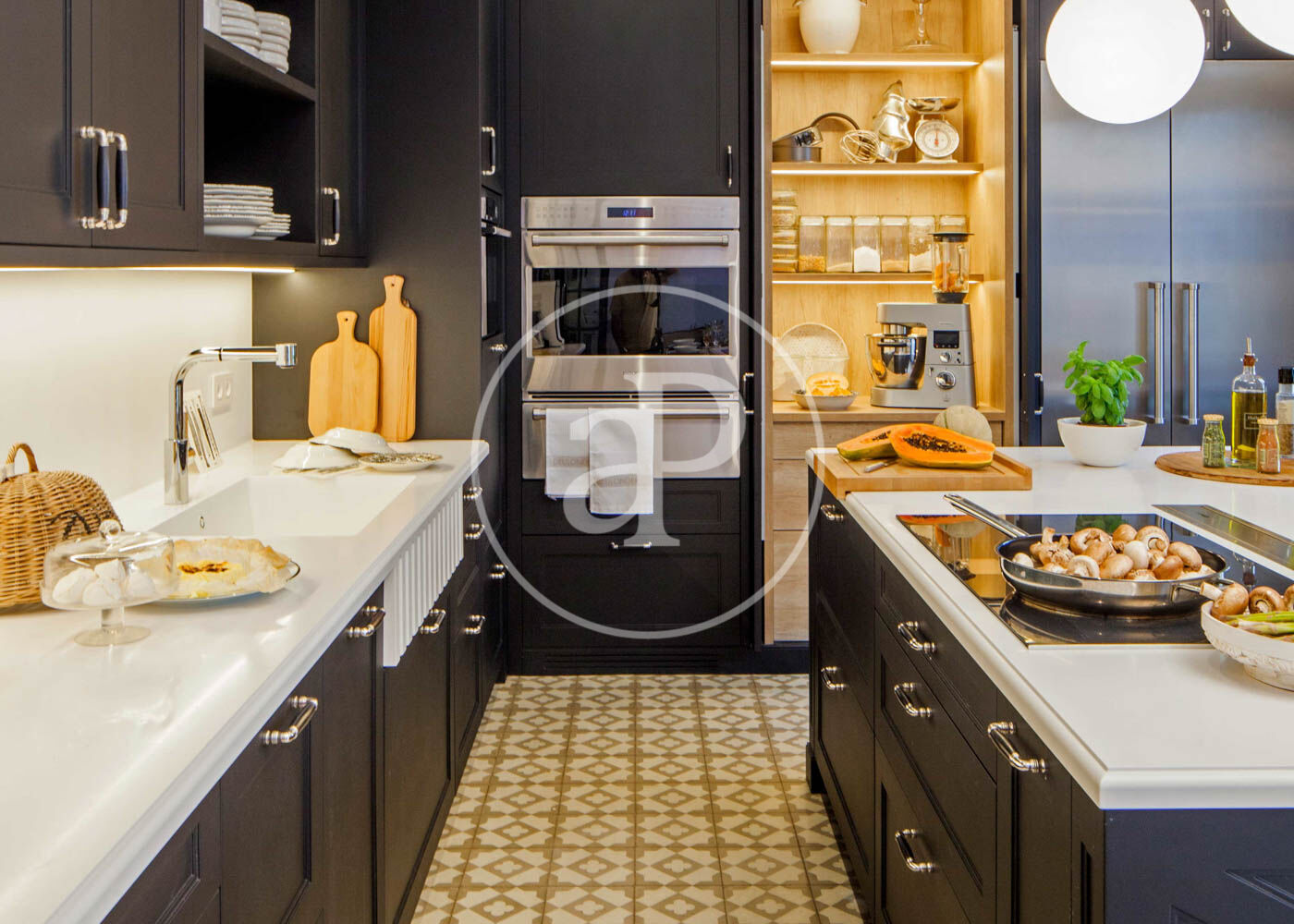 Upon entering, we find a large foyer that separates the daytime area from the nighttime area. To the right of the entrance is the bright living-dining room with access to a balcony and an open-plan kitchen. The kitchen furniture is from the renowned brand Deulonder, offering plenty of storage space and equipped with very distinctive features such as a warming drawer and a vacuum-sealing drawer. All appliances are high-end and include a double refrigerator. It also has a water purification system with temperature control ranging from cold to hot.
