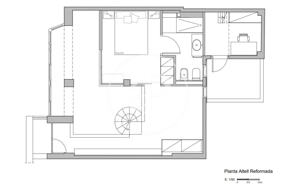 On the first floor you’ll find the daytime living area. The kitchen is practical and comfortable, with an island and chairs to make the most of the space, equipped with the latest generation ceramic hob. Moving on to the living-dining room, where the light streaming through its tall, elongated windows is a highlight. It features a designer lounge area and a complete bathroom with a shower tray on the first floor. Next is a study area with a desk, chair and wardrobes, ideal for working or studying in complete privacy. There's even the possibility of creating a third bedroom. From there, you access the second floor through this study, which includes high-quality built-in wardrobes.