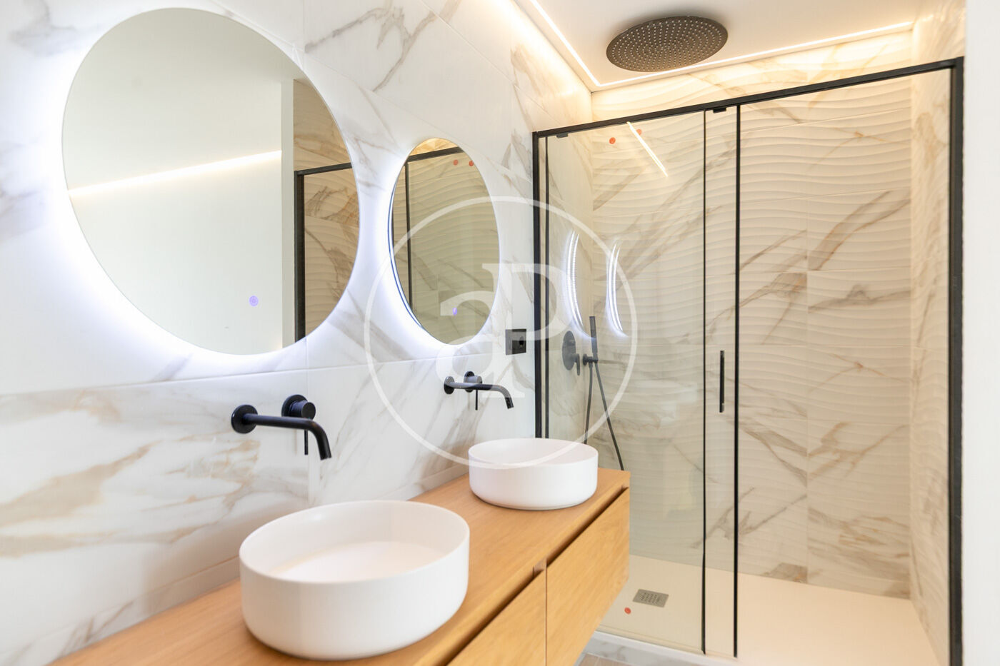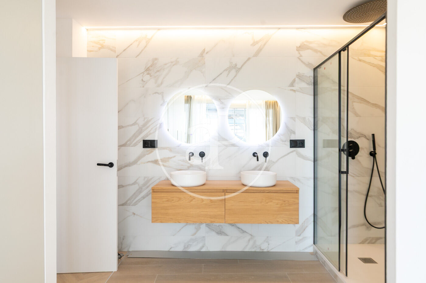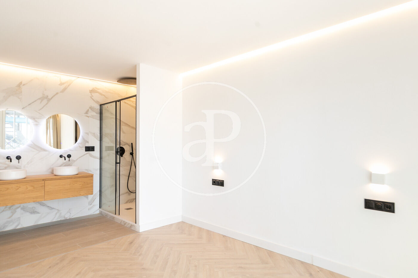 The night area features two en-suite bedrooms with private bathrooms and built-in wardrobes, as well as a stylish guest toilet. Each room has been thoughtfully designed to convey order, calm, and functionality, ensuring maximum comfort.