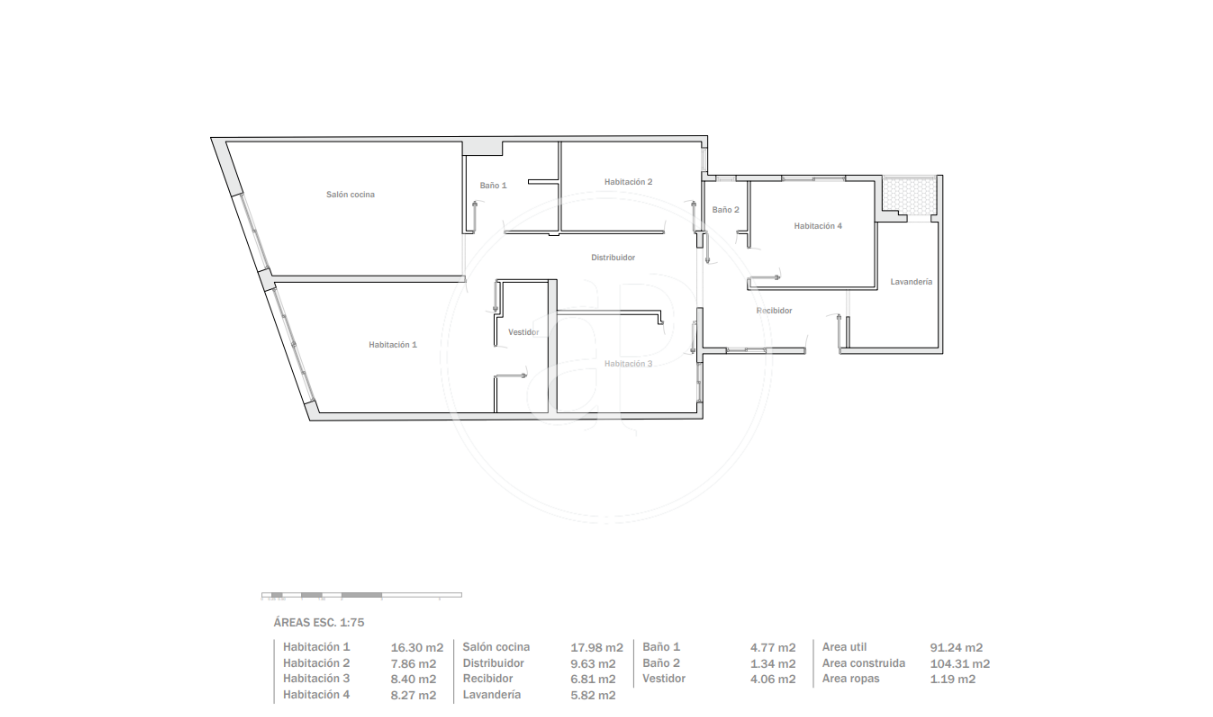 The flat, measuring 106m² constructed, is distributed into a living room, kitchen, four bedrooms (3 doubles and 1 single), one bathroom and one guest toilet.