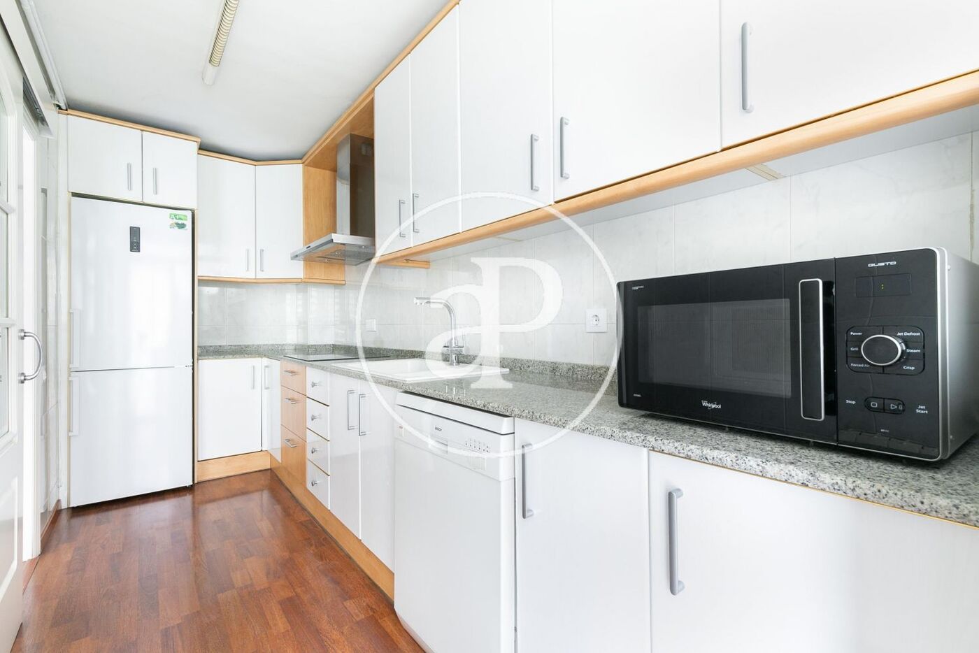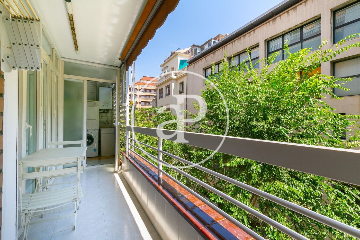 The 68 m² built area is distributed into a bright living-dining room with access to a pleasant 17 m² balcony/terrace, an office-style kitchen fully equipped with refrigerator and microwave, with access to a laundry area equipped with washing machine and dryer, a full bathroom, 2 bedrooms (one double with direct access to the balcony), and a room intended for use as a walk-in wardrobe or office.