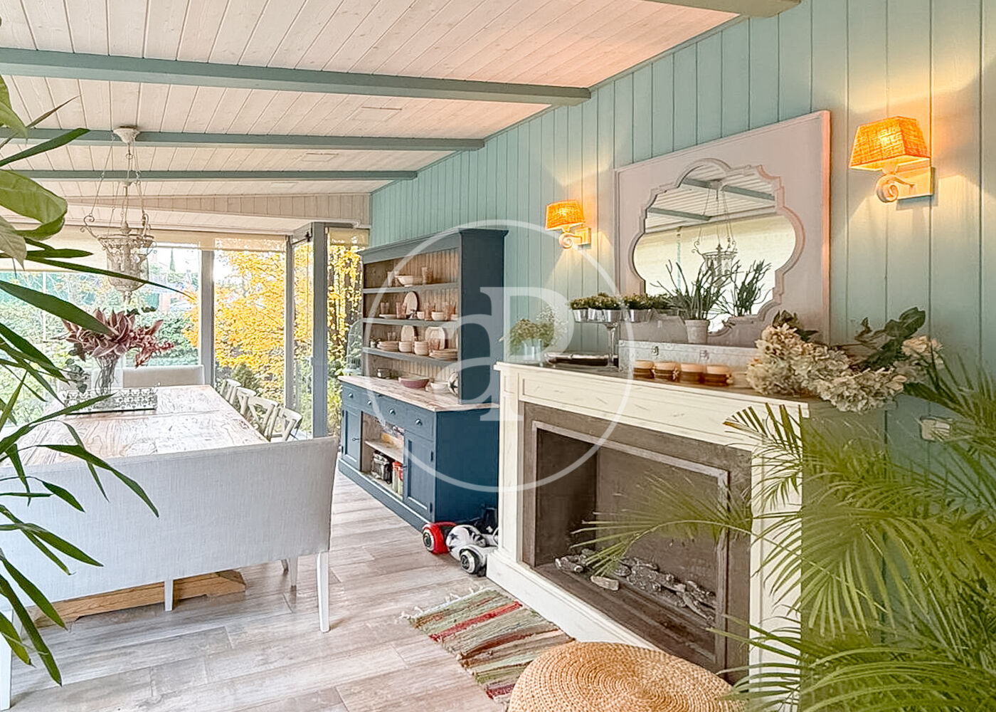 The main floor is conceived as a large open space where the living room, dining area, and kitchen integrate naturally. The fireplace adds warmth to the living area, while the open kitchen, equipped with high-end appliances, becomes a perfect gathering point. From here, you can access an elegant 25 m² glazed porch, a key extension of the home that connects directly to the garden and allows enjoyment throughout the year.