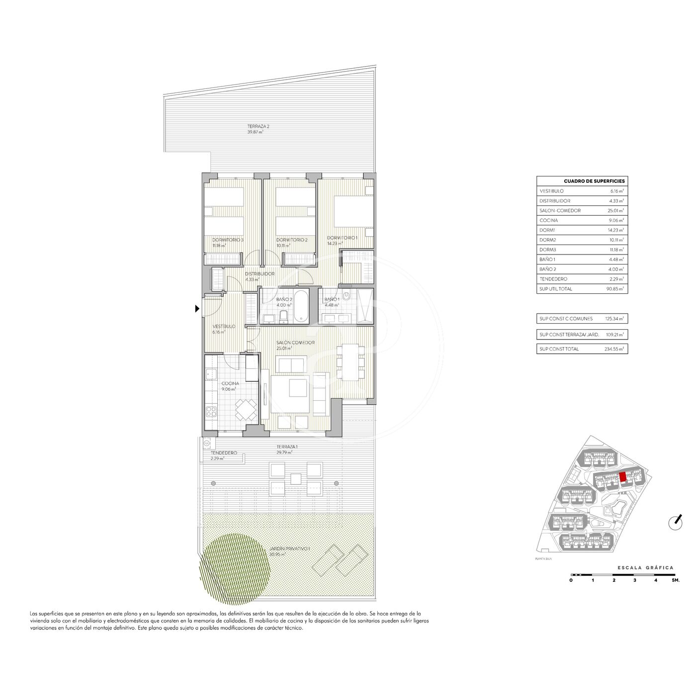 The exterior boasts a garden and covered porch at the front, as well as a landscaped back patio. The complex offers fantastic communal areas with a swimming pool for adults and children, various garden areas, a gym, a paddle tennis court, a gastrobar with a large, fully equipped kitchen, and 24/7 concierge service. The landscaping of the complex is particularly noteworthy, making it one of the most outstanding in the area.