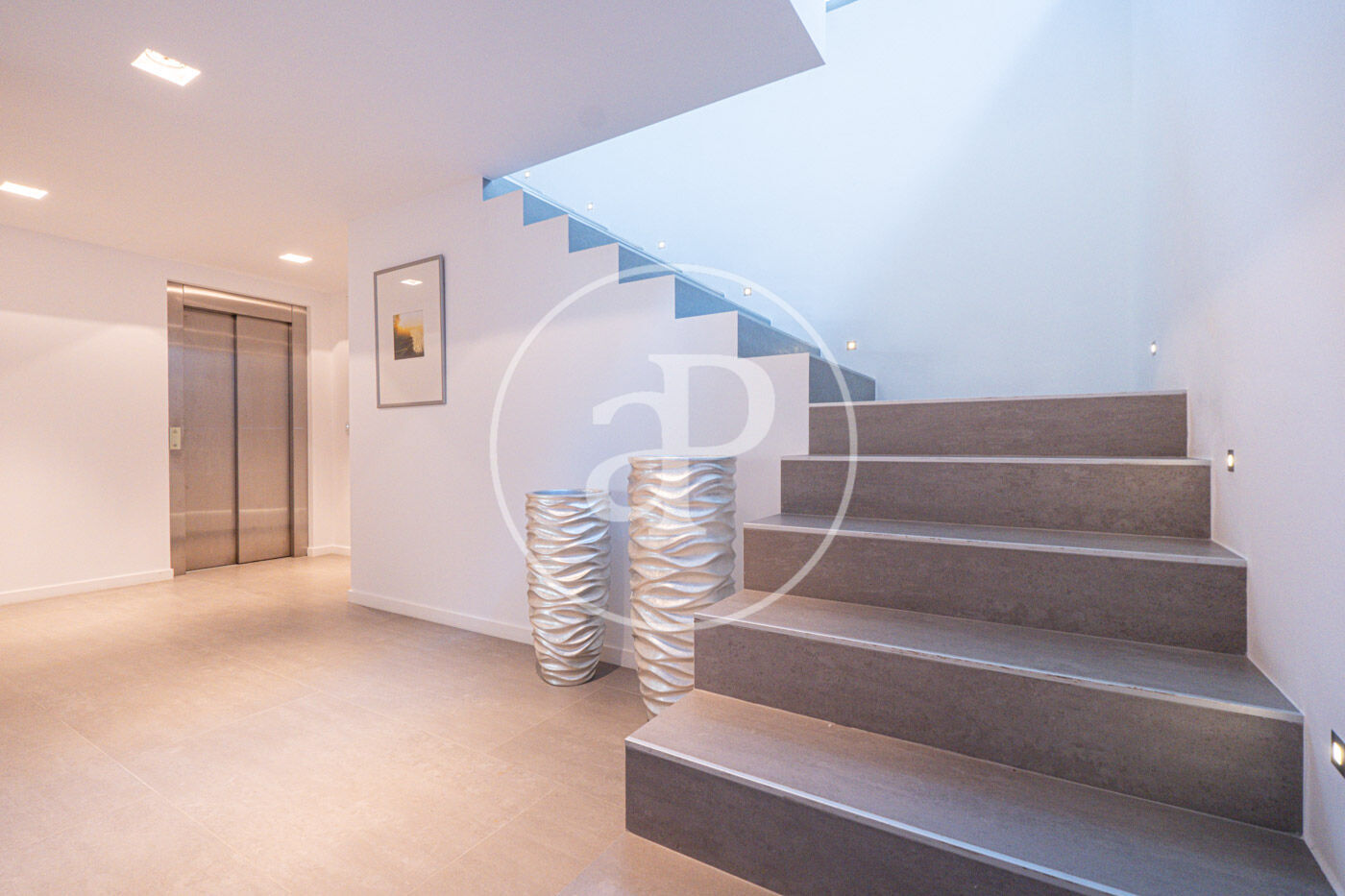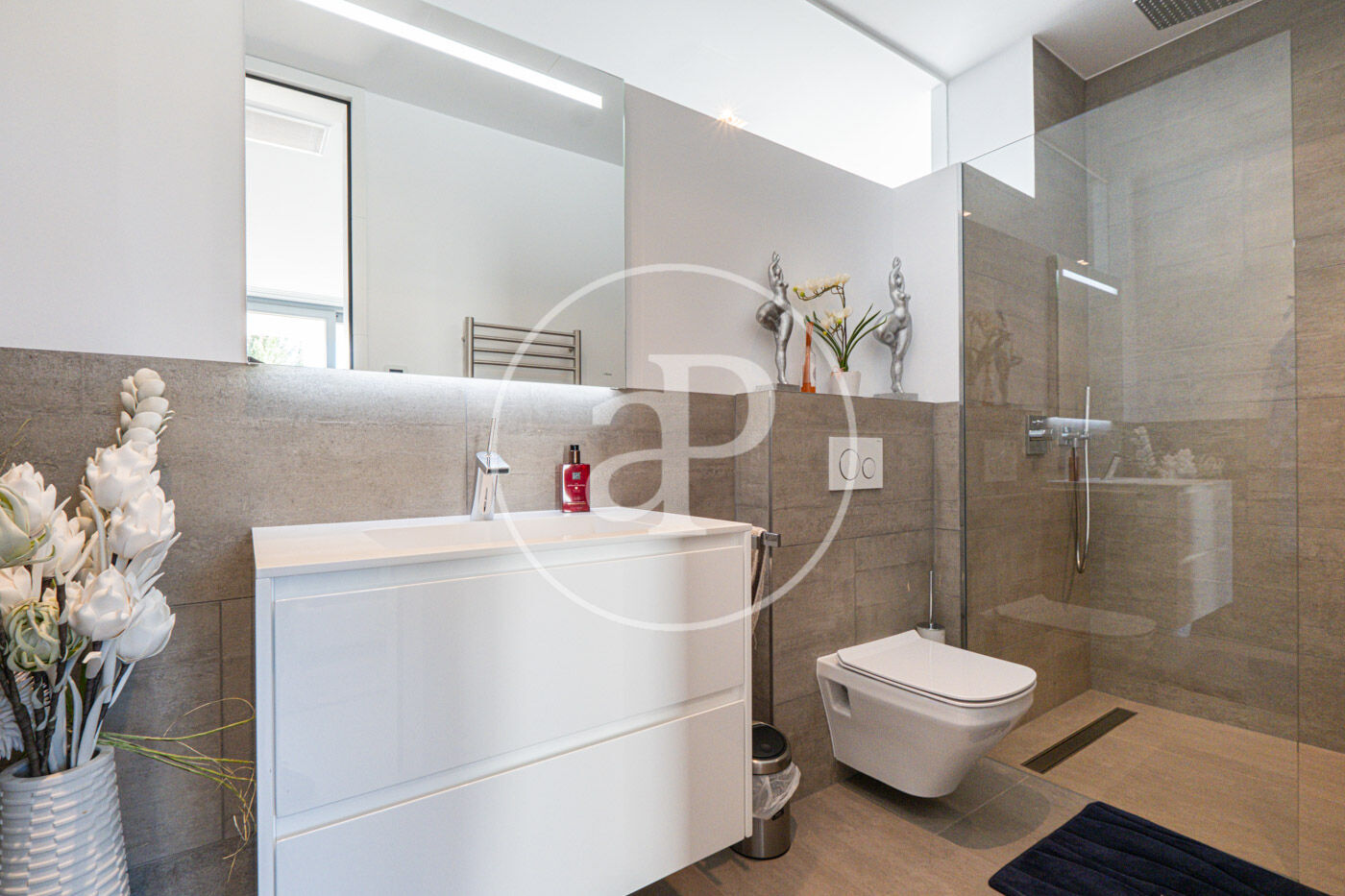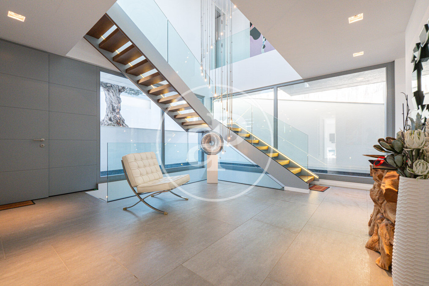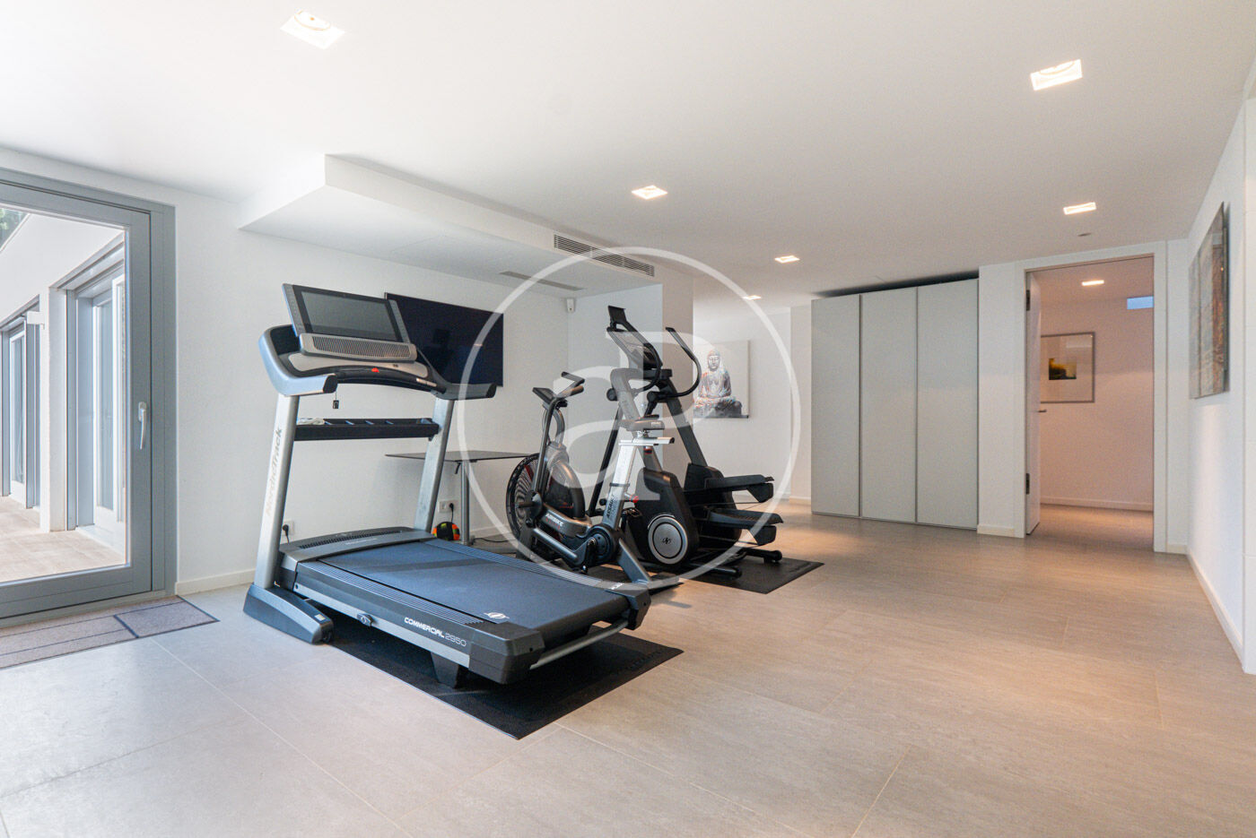 On a plot of 1294m2 with a net living area of 777 m² composed of a semi-basement floor, ground floor and first floor, connected to each other by means of an internal staircase and elevator. The semi-basement floor has a closed constructed area of approximately 290m2, and is intended for a garage with capacity for 5 vehicles, space reserved for the machine room of the housing facilities, the treatment plant room and distributor with the staircase and elevator. Gym with sauna.