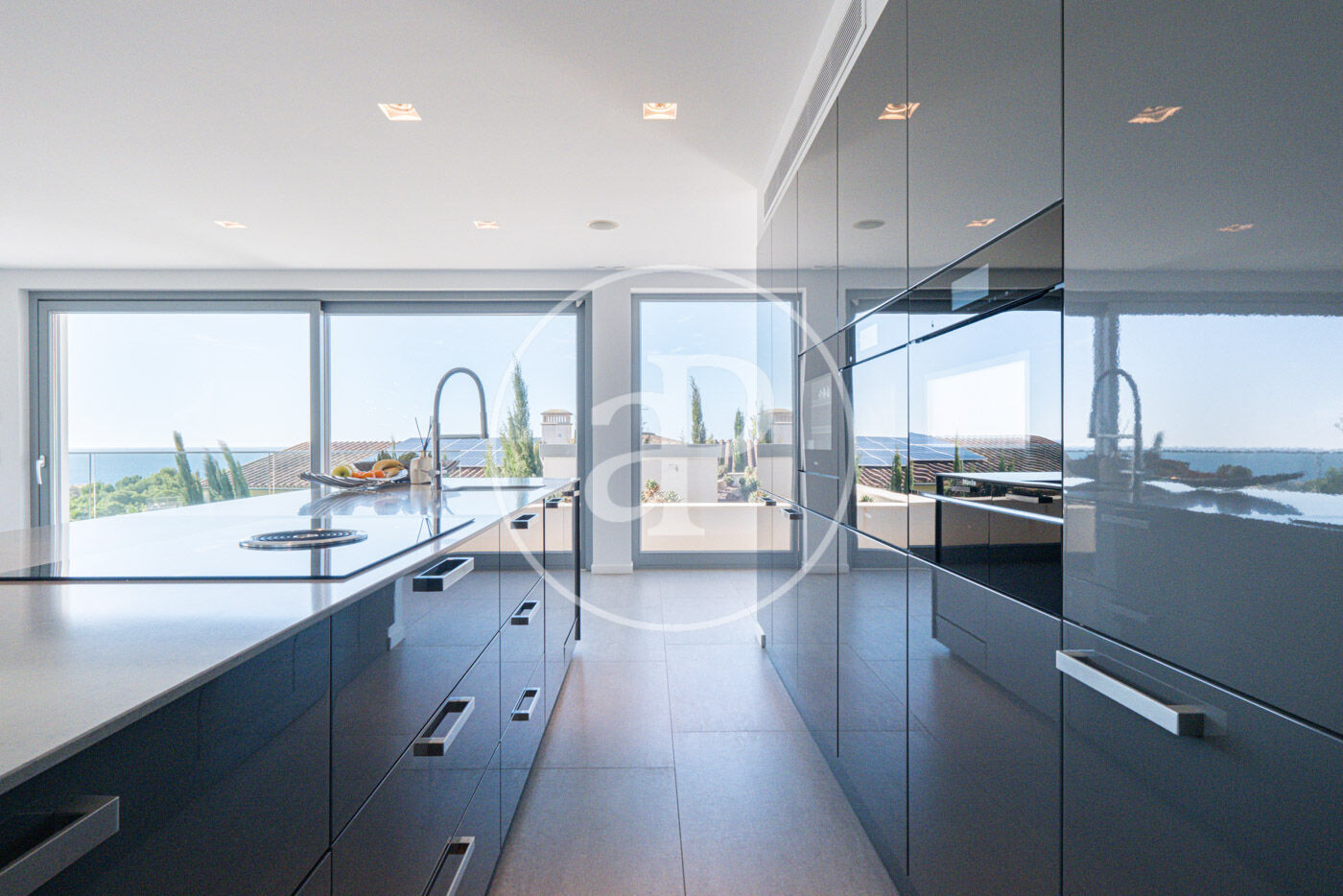 Roof terrace with outdoor kitchen and barbecue, offering panoramic mountain and sea views. Photovoltaic installation and air circulation pump.