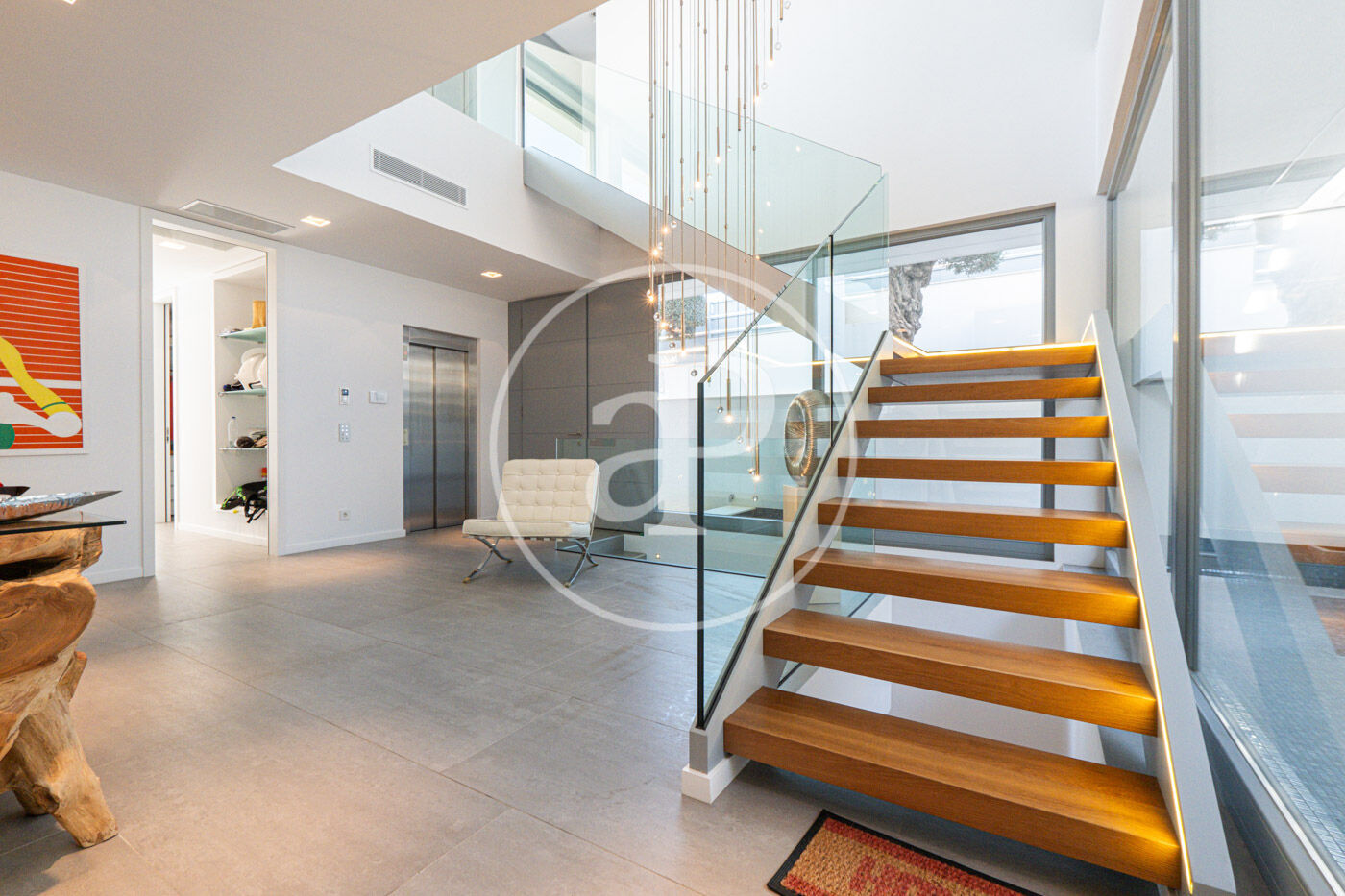 Gymnasium with sauna. On the ground floor there are four bedrooms, each with its own bathroom and direct access to the pool and garden. The first floor has a spacious living-dining room, high ceilings, a luxurious kitchen and an open floor plan. Next to it is a terrace with sea views, which offers a perfect connection to the second swimming pool. The staircase leads to the roof terrace with outdoor kitchen and a partly covered seating area with Jacuzzi. Convenience is paramount as the villa has a lift that allows access to the main floor from the underground garage, where there is space for two vehicles. Impressive entrance hall with a 2-storey designer chandelier.
