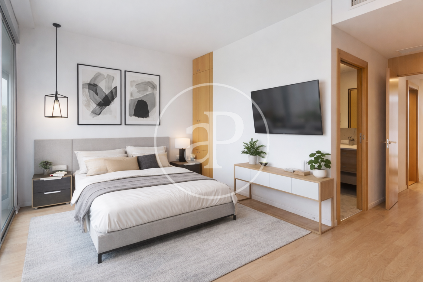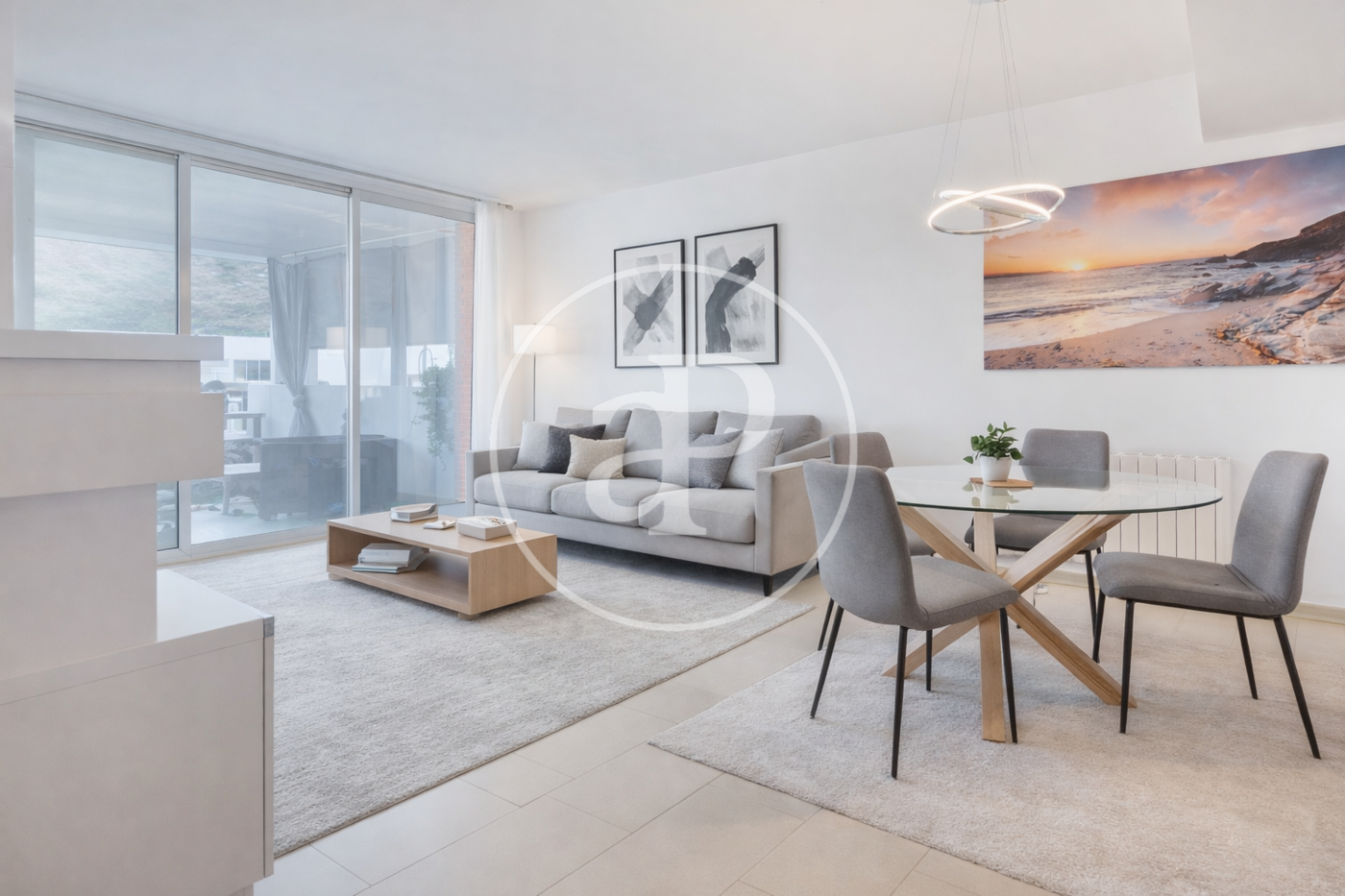 On the main floor, a spacious and bright living-dining room opens up to a large covered terrace with unobstructed views, creating the perfect setting for family gatherings or moments of relaxation outdoors throughout the year. The kitchen is independent, modern, and fully functional, separated from the living room by an elegant glass wall that enhances the sense of space and connects with an auxiliary terrace, ideal for laundry and storage. Also on this floor, there is a guest toilet and a practical built-in wardrobe at the entrance, contributing to organization.