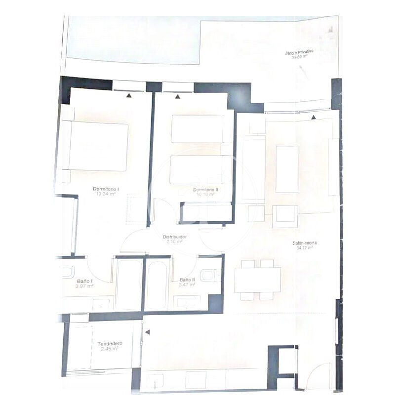 The apartment has two bedrooms, both with access to the garden, and two full bathrooms. Everything is in a pristine state, with very little use and excellent qualities, ready to move in.