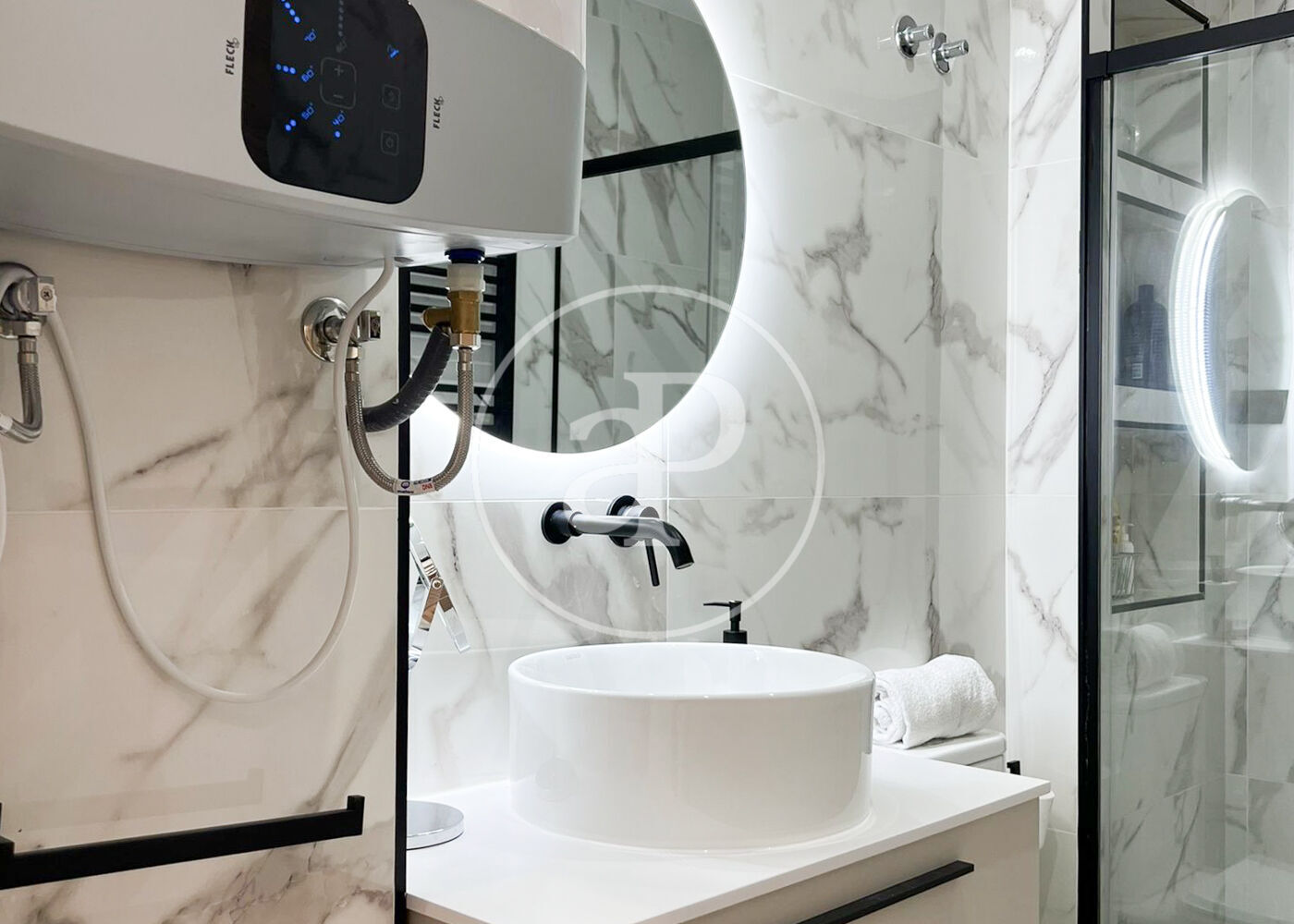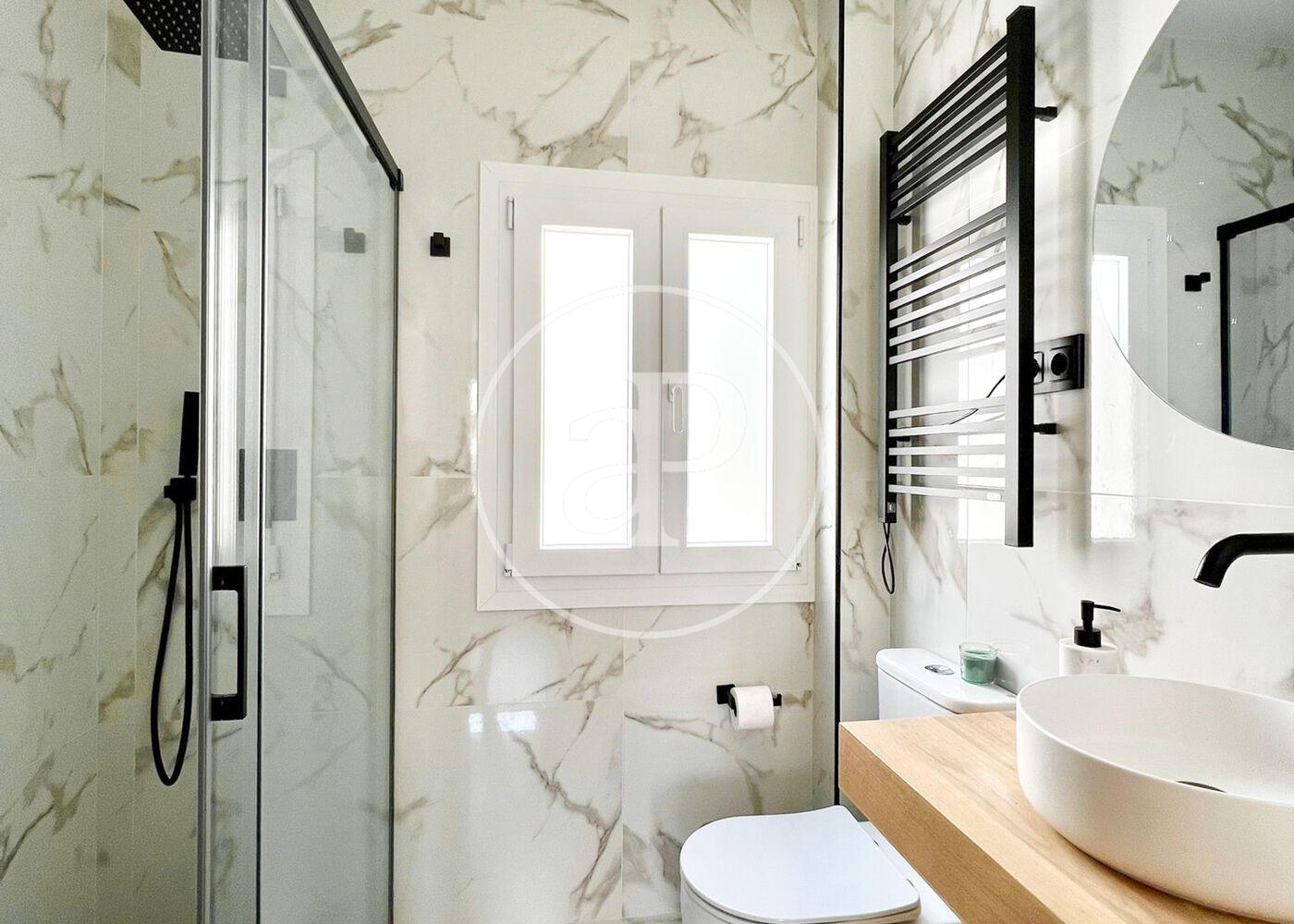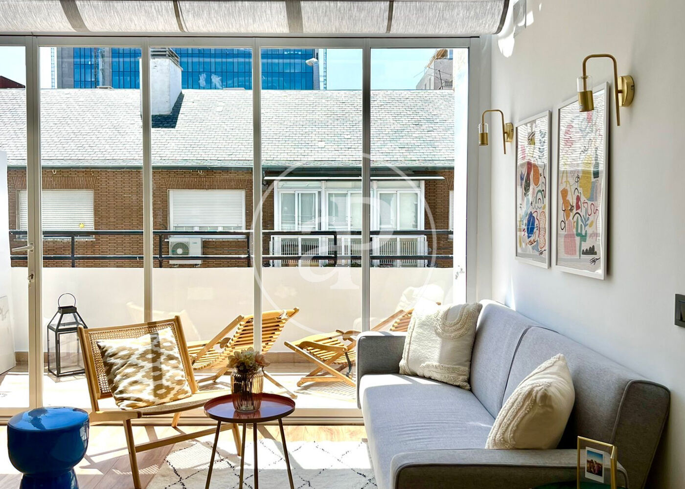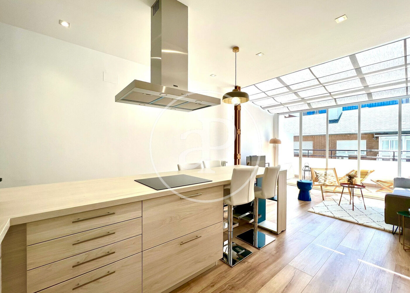 Newly refurbished and furnished flat of 130 m² with a large terrace in Chamberí. From the entrance we access to the open plan living room with direct access to the terrace through a large window where a lot of natural light enters. The terrace, of good size and with comfortable furniture to enjoy it. The kitchen, American style, fully equipped with all appliances and with a large island in the centre for cooking and sitting down to eat.
