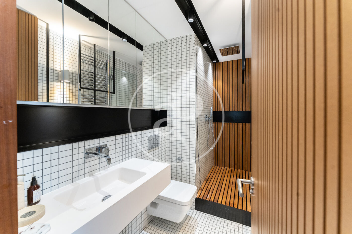 The entire apartment is very well designed with built-in wardrobes and features Iroko wood panels arranged in a cube shape in the center of the home. The bedroom and kitchen complete this Tetris-like arrangement, forming two additional cubes, this time in black, all connected by the living-dining room, creating a very cozy atmosphere.