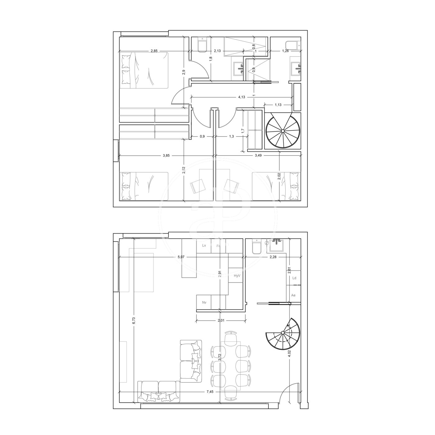 This is a two-story loft with 123 square meters of space, including the loft. It is accessed through a gated community with eight homes. On the ground floor, there is a living-dining room, kitchen, and guest bathroom with laundry facilities.