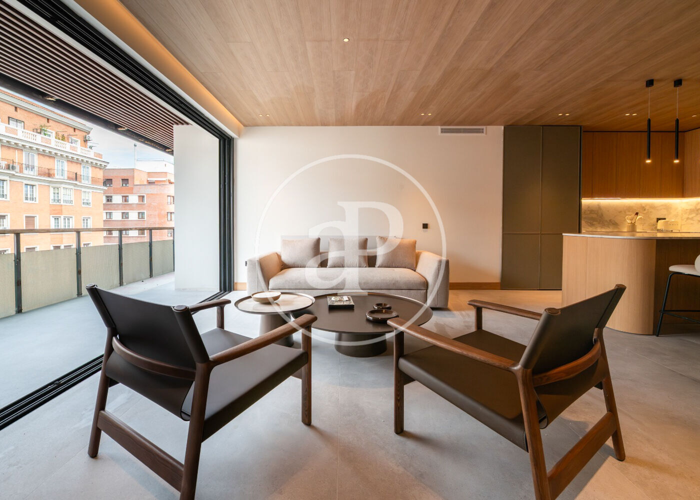 AProperties presents a fantastic and elegant penthouse with an incredible renovation and in a privileged location that stands out for its incredible views Exclusive luxury penthouse for sale in El Viso - Madrid, one of the most sought-after and elegant residential areas of the Chamartín district. A unique property for its location, height, orientation and high level comprehensive renovation, ideal for those looking to buy premium housing in Madrid with terrace and unobstructed views. The house has 166 m2 built with common areas, of which 149 m2 correspond to the house, located on the 8th and last exterior floor, which guarantees maximum privacy, luminosity and spectacular open views over the city with incomparable sunsets. It stands out for its magnificent terrace that can be used in all its spaces, with a south and east orientation, which provides abundant natural light throughout the day and excellent cross ventilation. All rooms have direct access to the terrace, creating a perfect connection between interior and exterior. Large, bright and contemporary social area The social area offers an elegant lounge with ethanol fireplace, seating area and work or reading space. The dining room is harmoniously integrated into the whole, creating a sophisticated and functional atmosphere.  The modern style kitchen opens onto the living room creating a contemporary and welcoming atmosphere. It is fully equipped, with large storage capacity, natural gas design stoves and a large peninsula that becomes the center of social life. In a separate room you will find the laundry room, with a small stack and a west-facing window. The house also has a guest toilet. Private area with two suites and premium finishes The more private area houses two double bedrooms en suite, both with direct access to the terrace. The master suite features a walk-in closet and a spectacular bathroom with spa shower, integrated seat and swan neck sprayer, designed to provide a unique wellness experience. Luxury renovation and high-end materials The property has been subject to a comprehensive luxury renovation, combining natural wood, polished cement and top quality materials in all spaces, achieving a contemporary, elegant and timeless aesthetic. An exceptional opportunity to acquire an exclusive penthouse in El Viso, Madrid, with terrace, views, maximum natural light and design reform. Ideal as a residence or investment in one of the most demanded areas of the high-end real estate market in Madrid. The attic has gas and community hot water with individual consumption. Furniture not included in the price. The building has a concierge service and natural gas. Community expenses: 169 APROPERTIES invites you to discover this unique real estate jewel in height. Definitely a unique property, cheerful and excellently located. Can you imagine living here?
