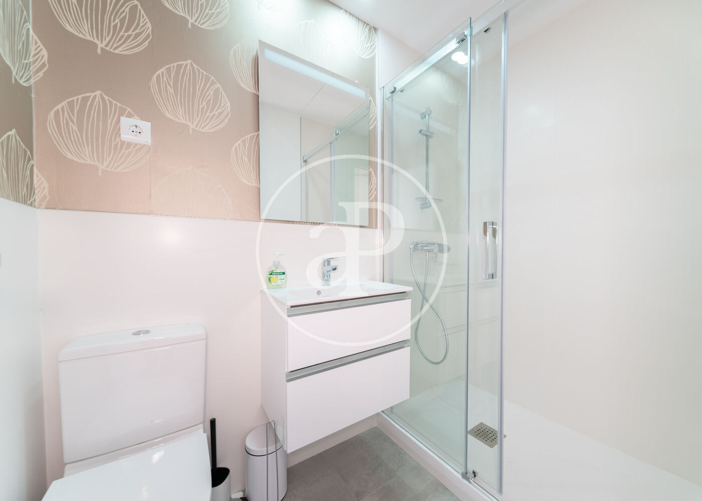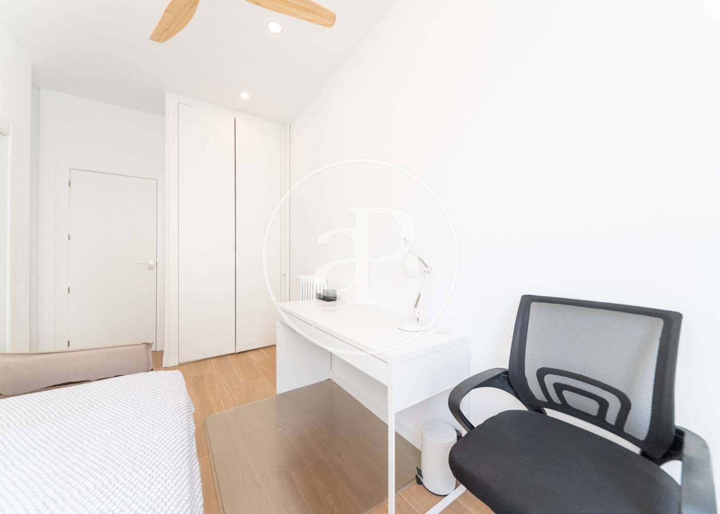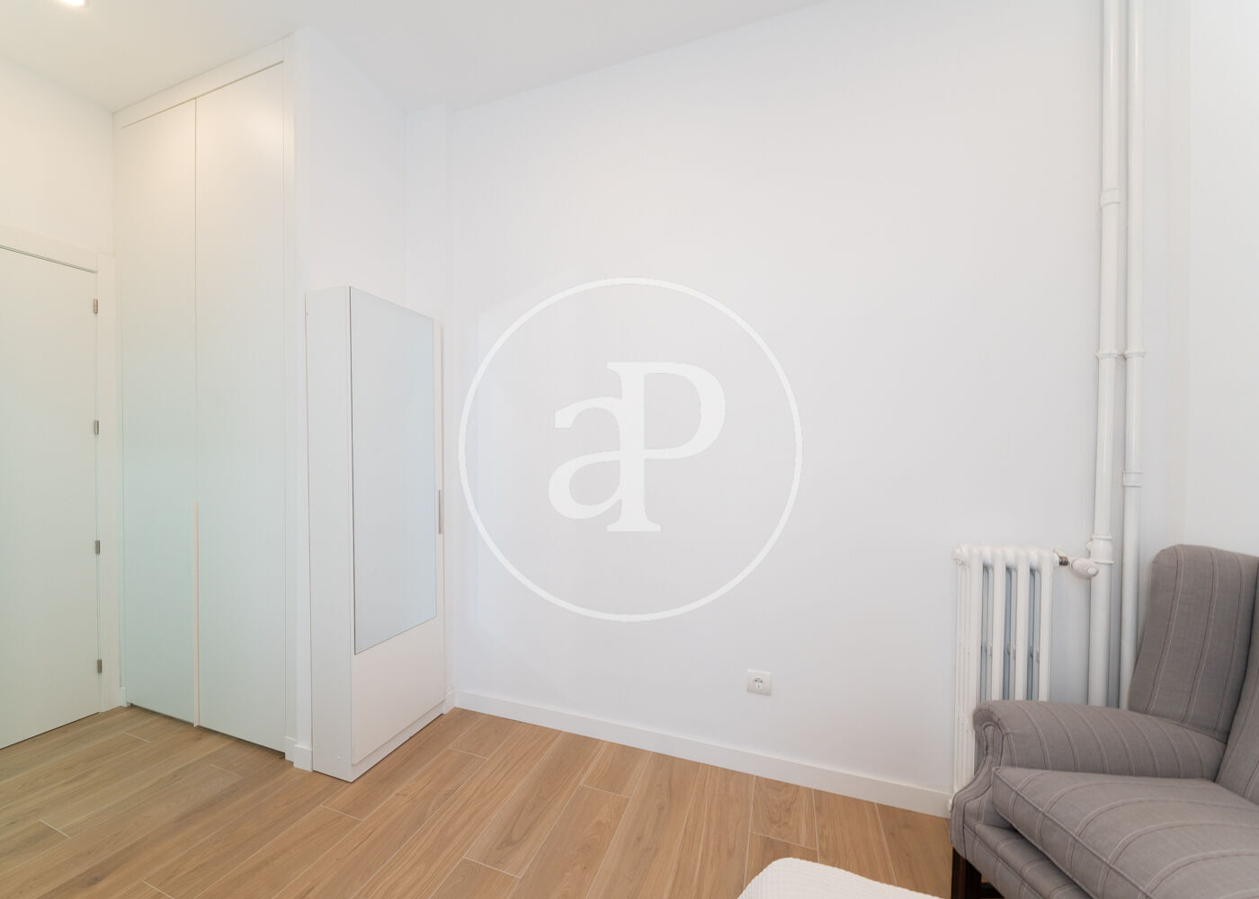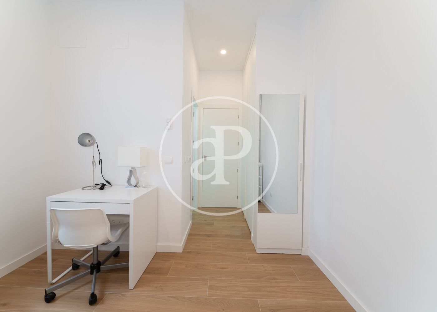 Available june1st perfect for sharing. It has 145 m2 on a 6th floor of a building with classic facade, renovated and modern with very good qualities. Very spacious living room with large windows to the outside, semi-integrated kitchen 4 bedrooms en suite each with bathroom, bedrooms have desk and chair, fully equipped kitchen with oven, refrigerator, washing machine, dishwasher, microwave. Individual heating with distributor (individual meter). Air conditioning. Internet included in the rent.