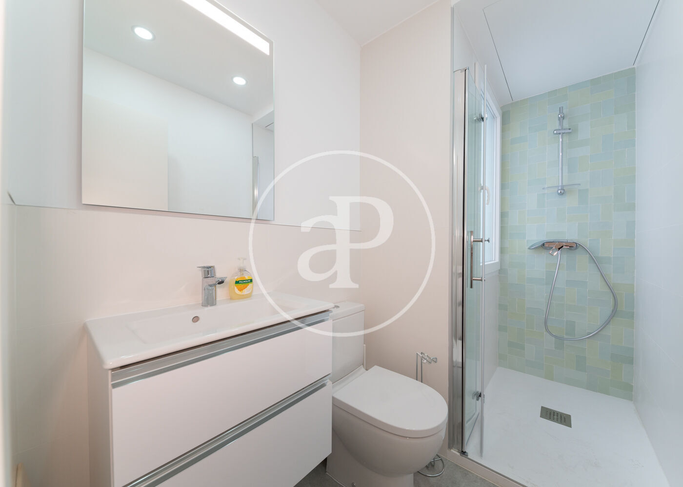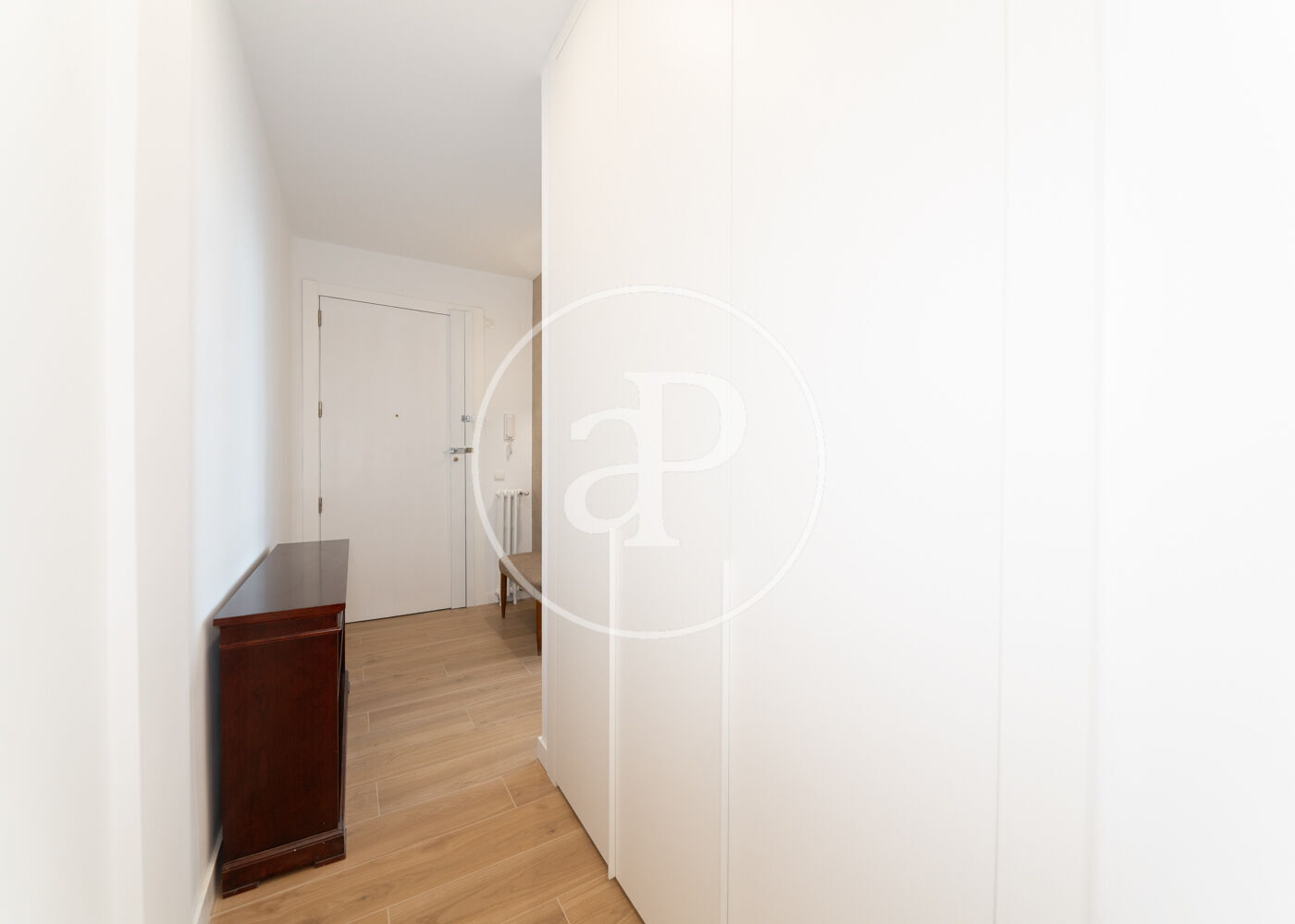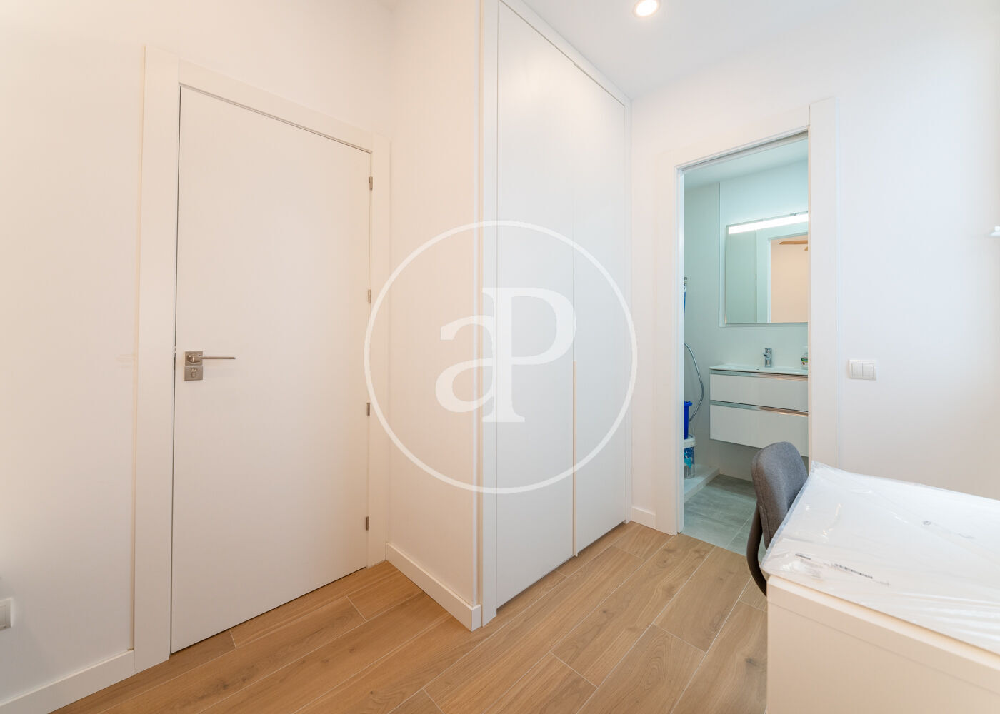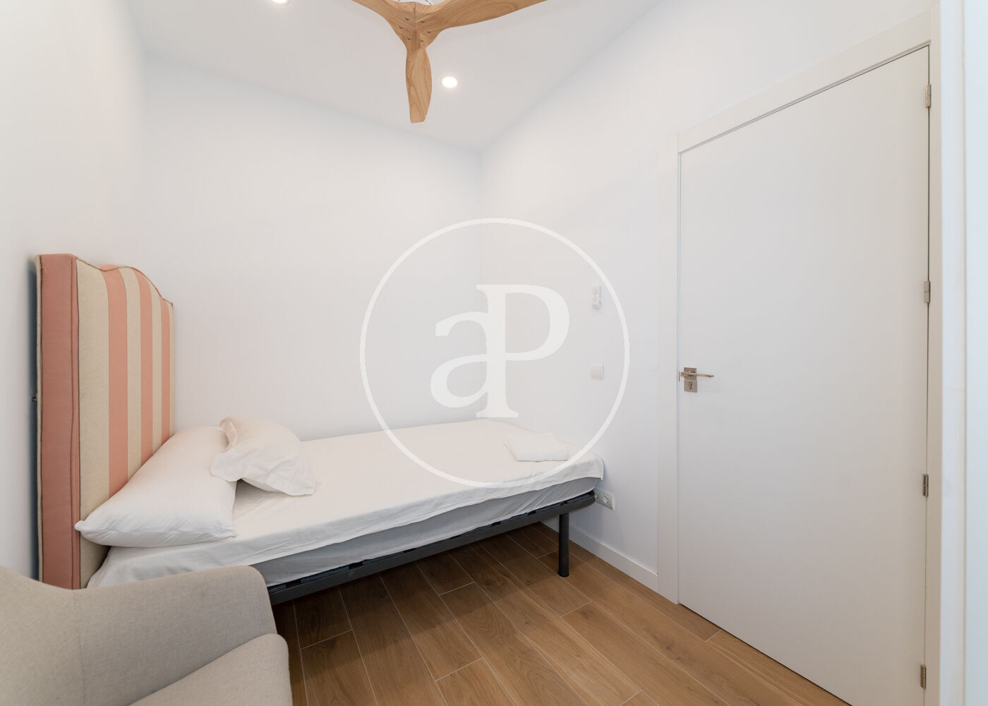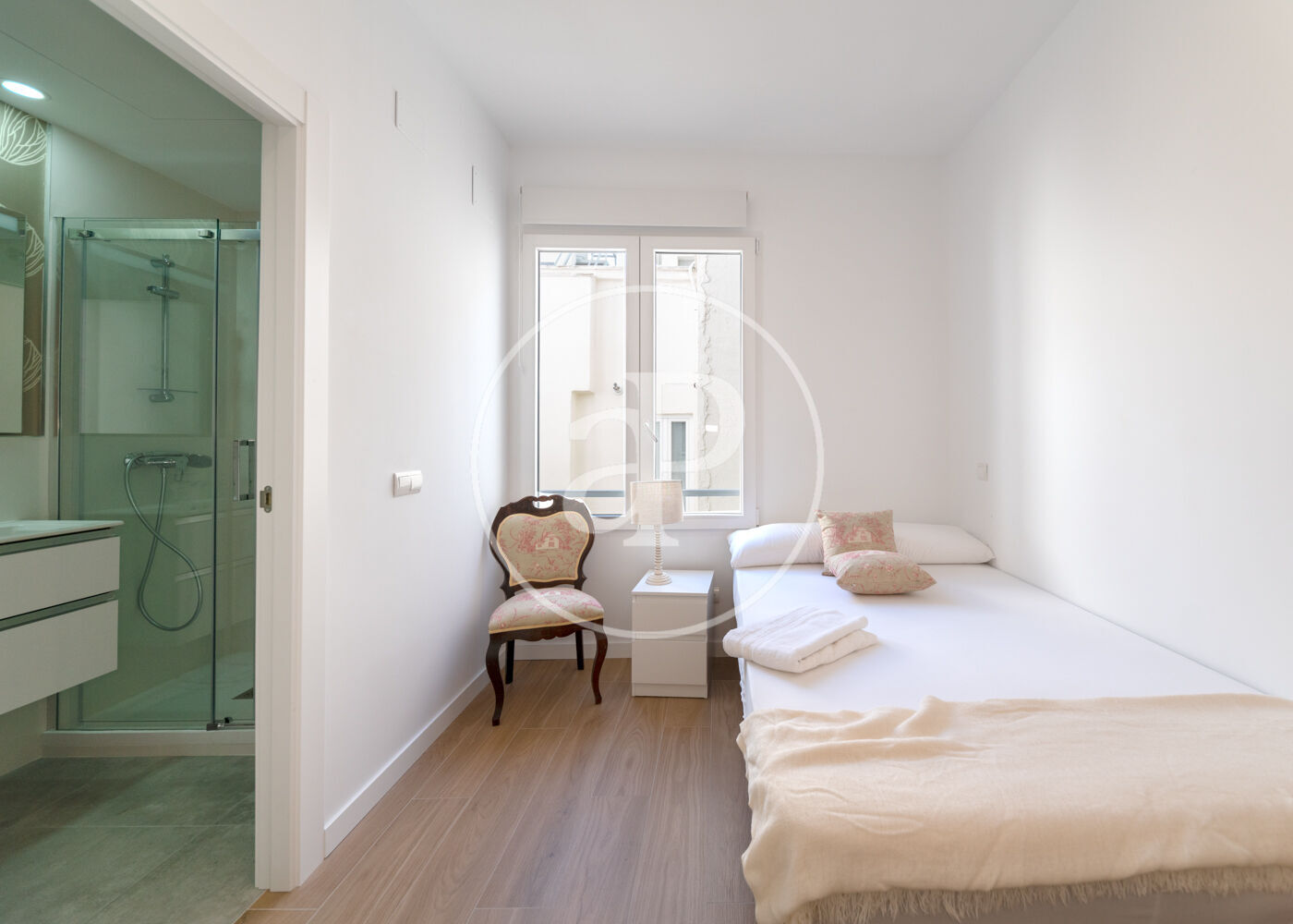 Available june1st perfect for sharing. It has 145 m2 on a 6th floor of a building with classic facade, renovated and modern with very good qualities. Very spacious living room with large windows to the outside, semi-integrated kitchen 4 bedrooms en suite each with bathroom, bedrooms have desk and chair, fully equipped kitchen with oven, refrigerator, washing machine, dishwasher, microwave. Individual heating with distributor (individual meter). Air conditioning. Internet included in the rent.
