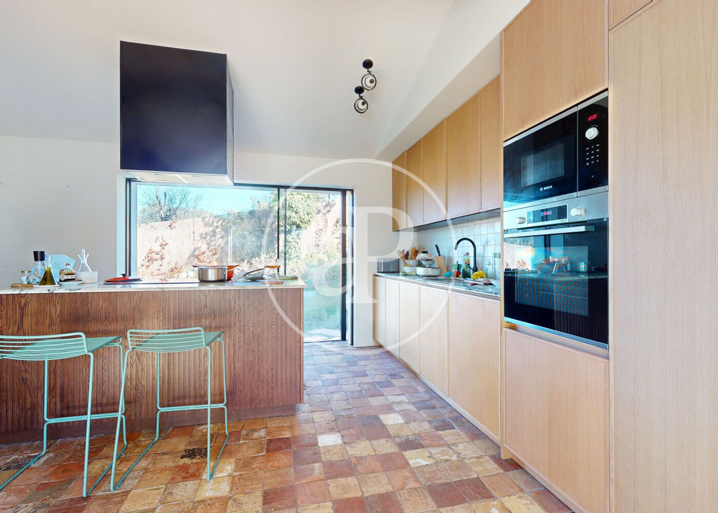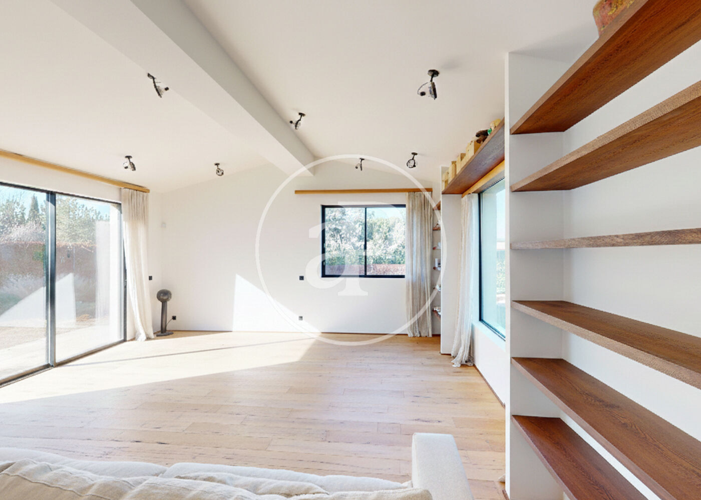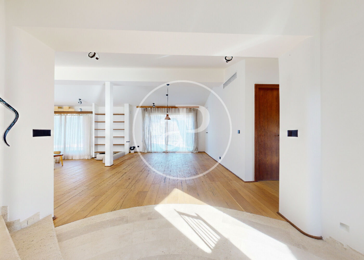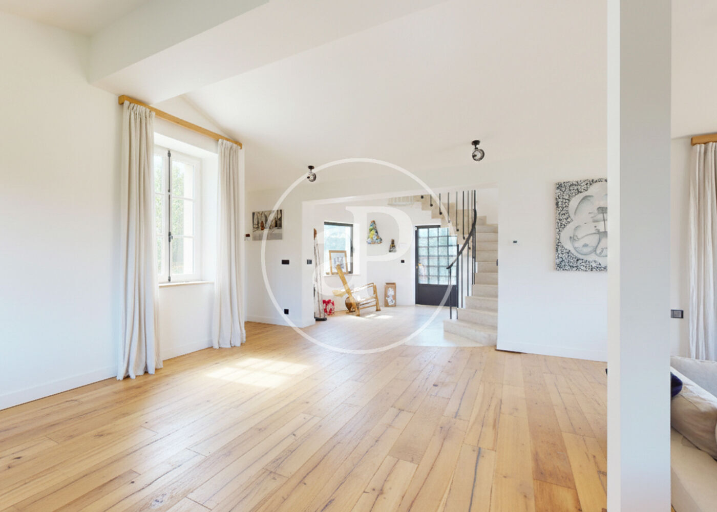 The property is completed with a private swimming pool, two inviting porches, a magnificent 120 m² terrace on the upper floor, and a spectacular central staircase that connects the entire house and reinforces its architectural character.