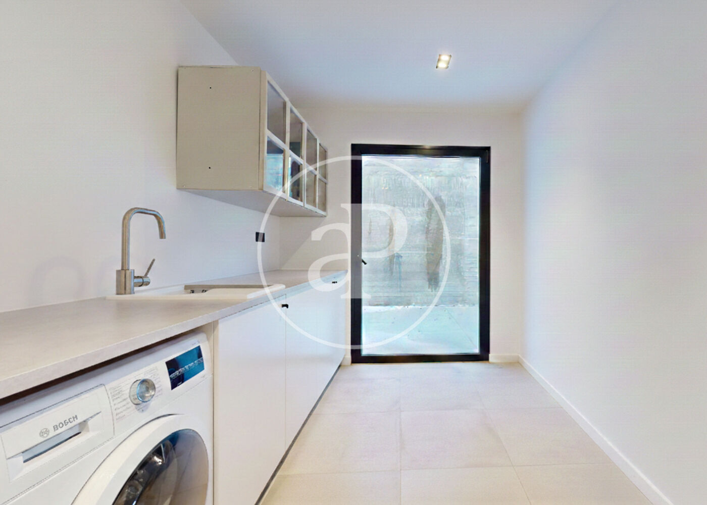 With large windows that flood the space with natural light, this level houses a staff bedroom, a full bathroom, and a laundry area.