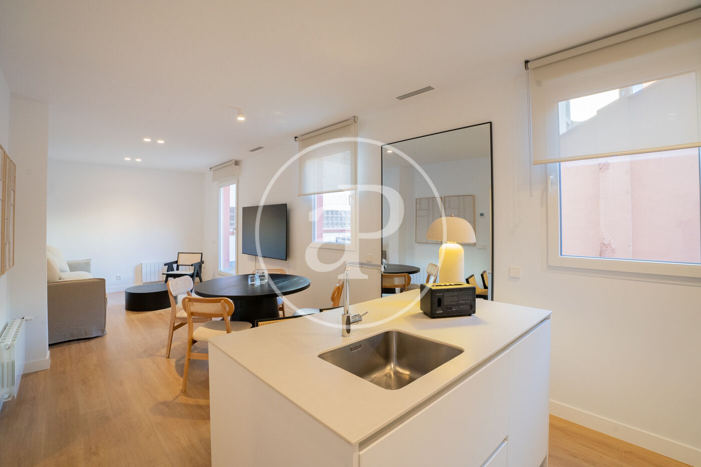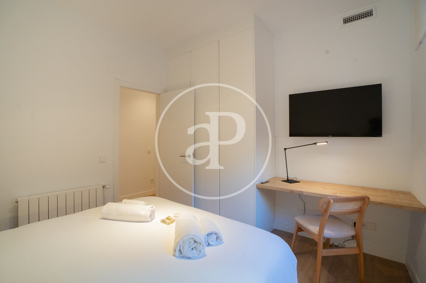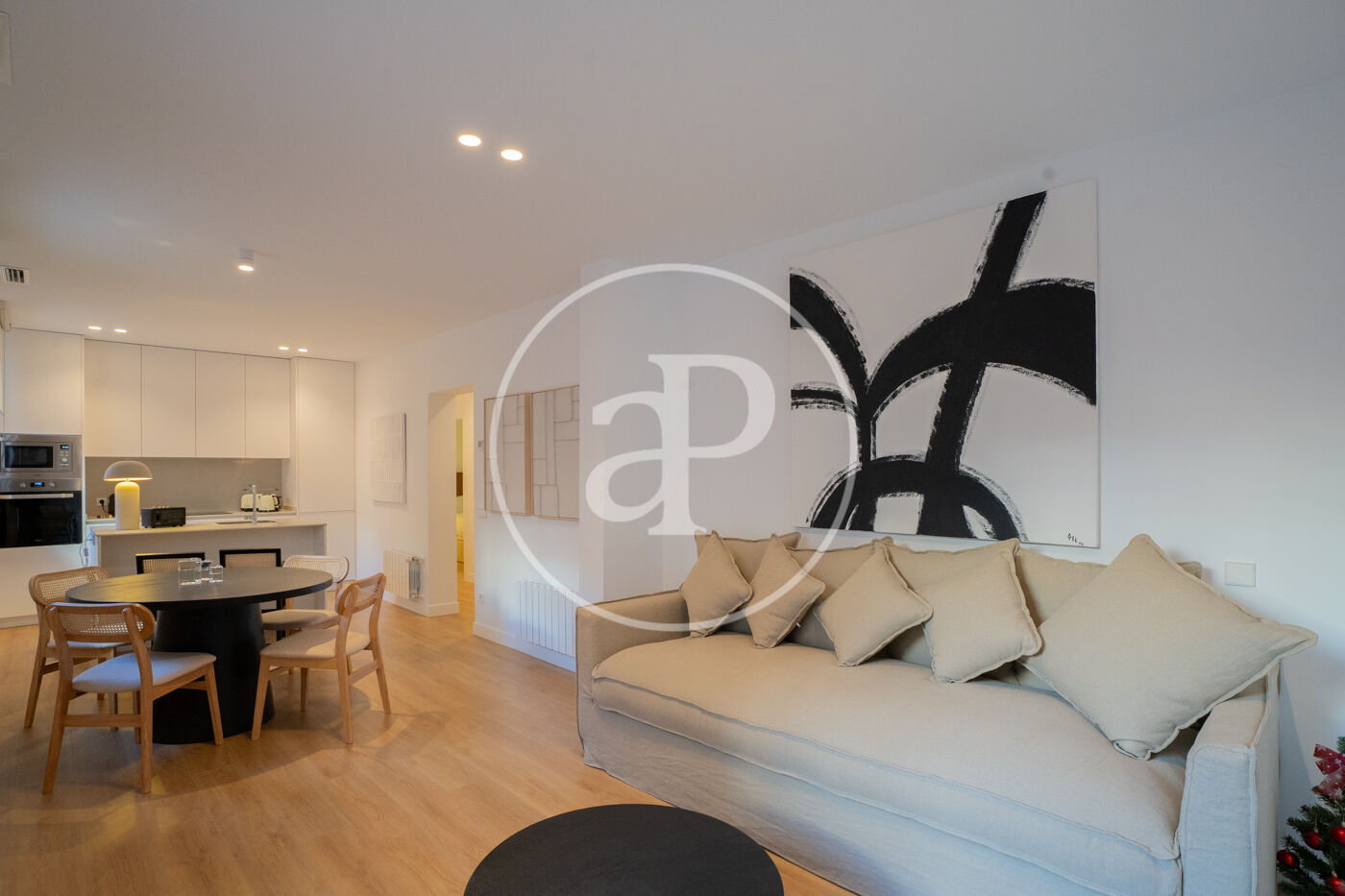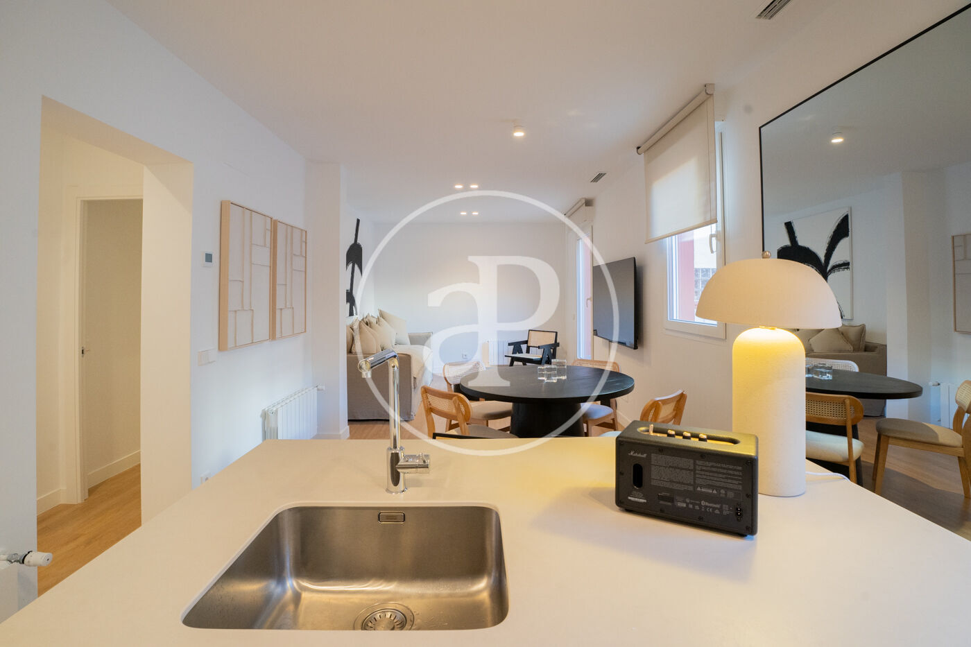Beautiful renovated and furnished apartment on Monte Esquinza Street. The apartment is located in the Almagro neighborhood on one of the city's most prestigious streets, just a few meters from Plaza de la Villa de París and Plaza de Colón. This is a fifth-floor exterior apartment with two balconies overlooking the street in a classic 1926 building. The property has been recently renovated with exceptional attention to detail and the highest quality finishes and materials. It features a beautiful and welcoming living room-kitchen, two bedrooms, one en suite, and a full bathroom. The living room-kitchen blends classic elements typical of the building with modern and luxurious decor. The kitchen has plenty of storage space and is equipped with top-brand appliances. This east-facing space receives magnificent morning light thanks to a bay window and a balcony. A hallway leads to the sleeping area, where there is a comfortable en-suite bedroom and another double bedroom. A bathroom in the hallway serves the second bedroom and also serves as a guest toilet. The property has 104 m², of which 94 m² are residential and 10 m² are common areas. The home features ducted hot/cold air conditioning, underfloor heating, a fully equipped paneled kitchen, and designer furniture. Its high ceilings add spaciousness, and its east/west orientation provides optimal cross-ventilation. The property has a concierge and reasonable fees: community fees of €134 and property taxes of €715. This is an exceptional opportunity to live or invest in one of the most sought-after areas of the capital, not only for its undeniable beauty and distinction, but also for all its amenities, including leisure and cultural amenities, prestigious schools, and museums. Almagro is one of the capital's most elegant and noble areas, with stately, classically styled palatial buildings and pleasant parks and avenues that make it a unique neighborhood. It is located just a few meters from the Salamanca and Justicia neighborhoods. Its central location provides easy access to other neighborhoods. Can you imagine living here?
