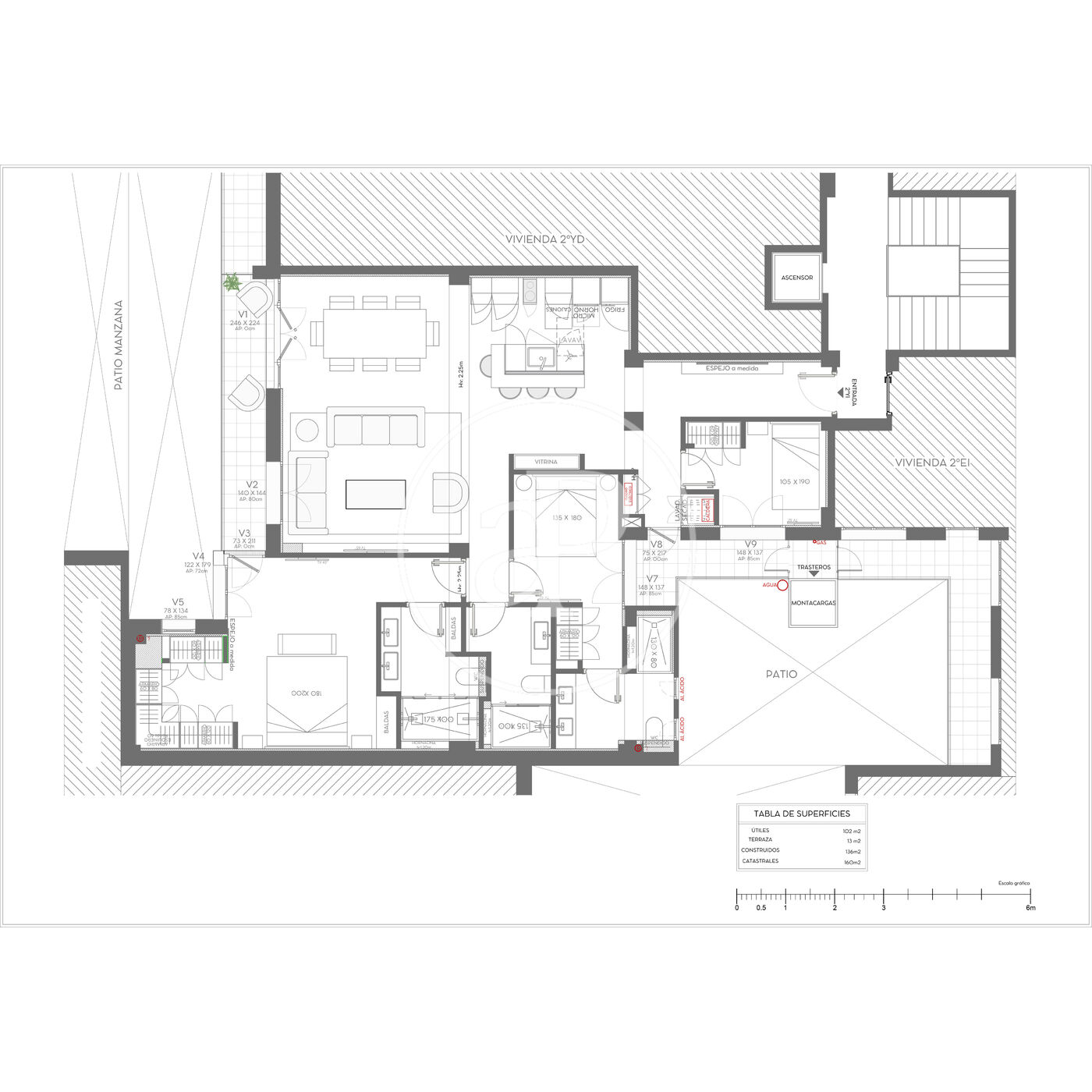 Located in a 1960 building with a lift and concierge service, this 160 sqm cadastral property has been renovated to offer a perfect balance between elegance and functionality. Its interior position facing a block courtyard ensures tranquility and a quiet atmosphere in the heart of the Goya district.