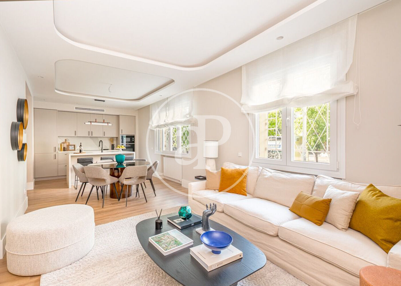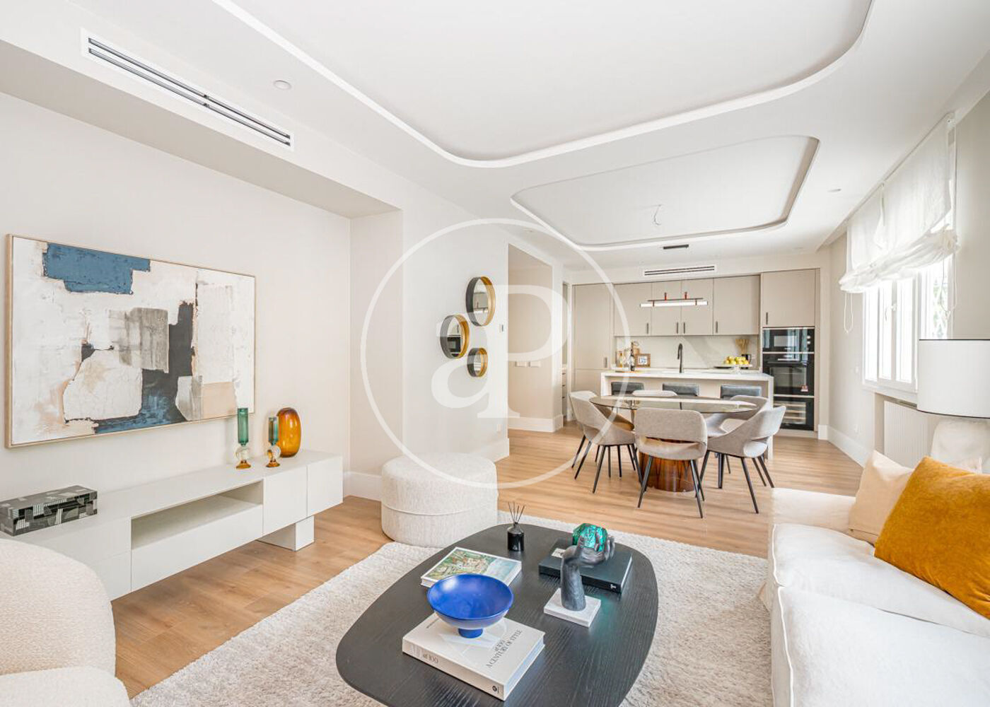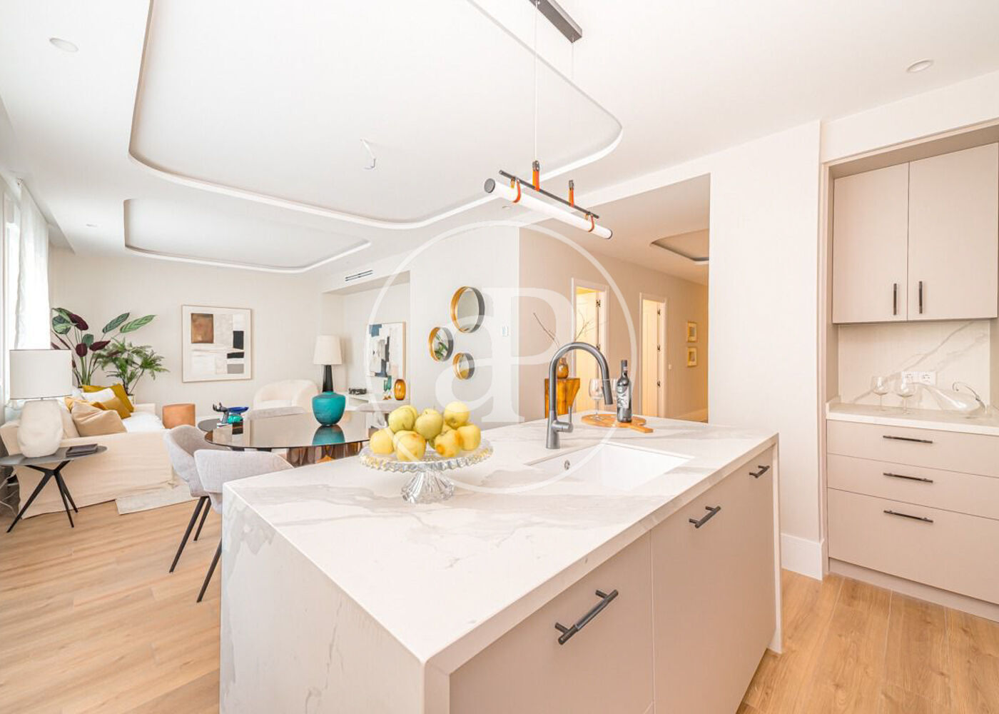 Aproperties presents a beautiful, newly renovated apartment on Calle Antonio Mercé, in the Goya district. It is a bright mezzanine with a surface area of 173 m2 according to the land registry. The living area consists of a spacious living-dining room with an open-plan kitchen and large windows. It also has a separate laundry area and a guest toilet.