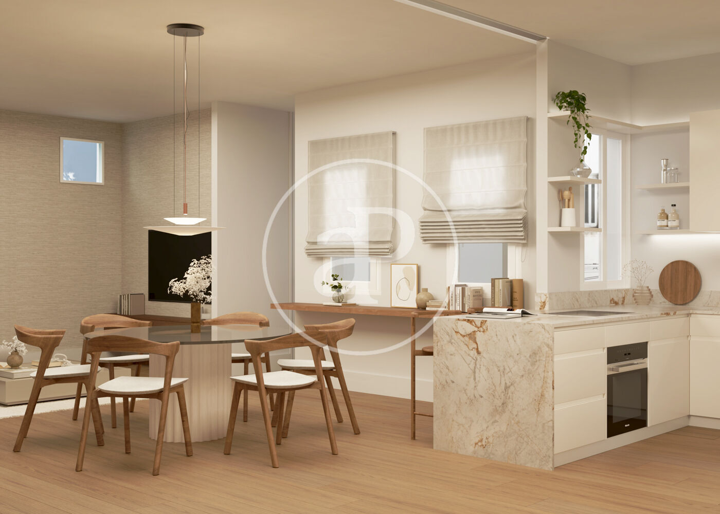 It is located on the sixth floor of a classical façade and portal building. The house has 83 m2 built according to cadastre and has been renovated with premium qualities, attention to detail and good taste. The day area has a bright and spacious living room and semi-integrated kitchen with high-end appliances and with an approximate surface of 37 m2. The night area consists of two bedrooms and two full bathrooms, one en suite, both with practical fitted wardrobes. The beautiful custom-made carpentry and floor to ceiling doors stand out.