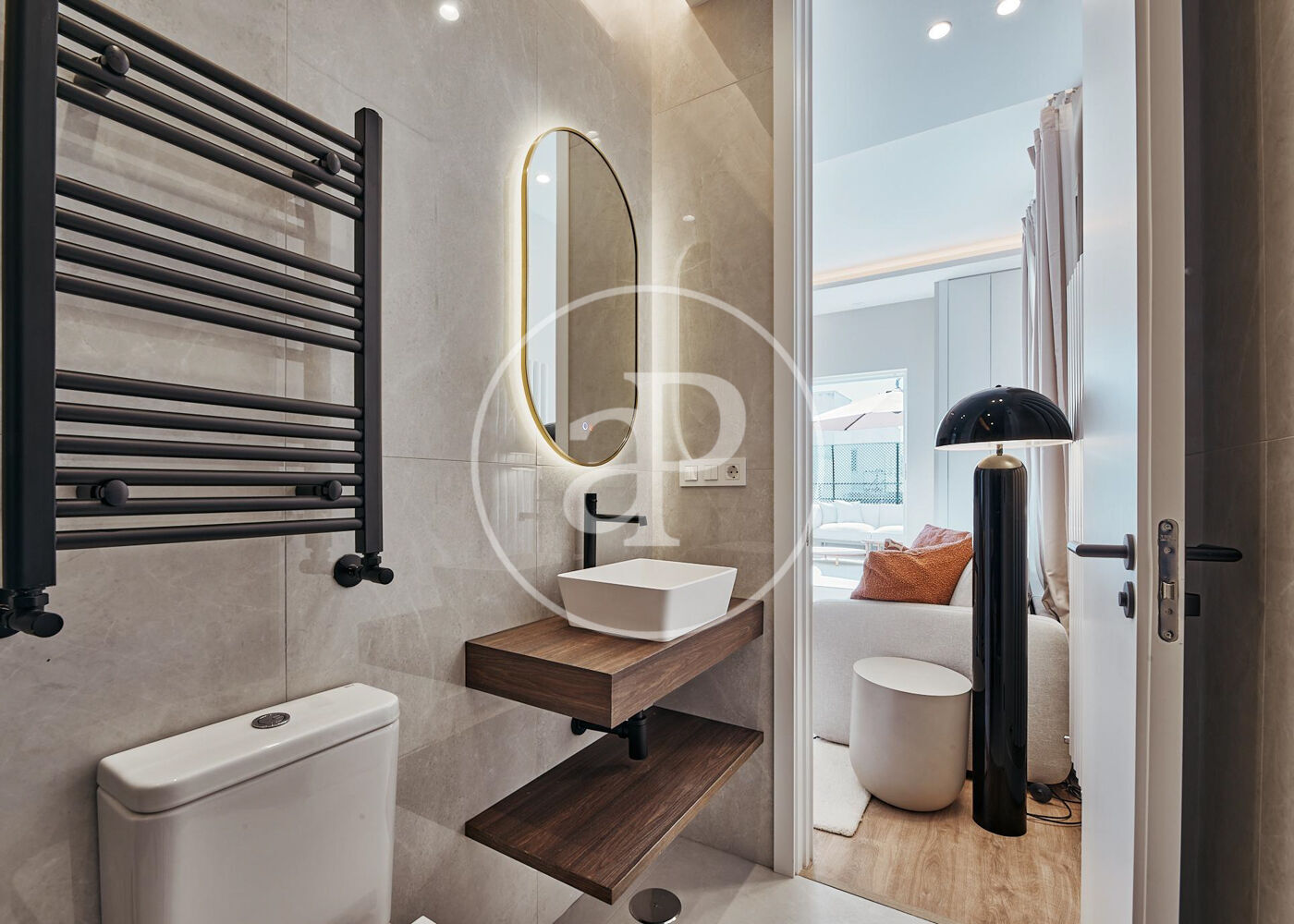 aProperties presents this exclusive 130m2 (1,500 sq ft) apartment, recently built and boasting fantastic quality finishes. This bright and airy apartment features three bedrooms, all with built-in wardrobes. The master bedroom has an en-suite bathroom with both a bathtub and shower, and double sinks. The sleeping area includes a second full bathroom serving the other two bedrooms and a guest toilet at the entrance. A spacious linen closet is also located in the sleeping area. The living area features a coat closet in the entrance hall, a separate and fully equipped kitchen with a particularly large oven and induction hob. The kitchen offers ample space for a table and chairs, as well as access to the outdoor drying area, which includes a washing machine, dryer, and a storage cupboard. The large living room, adjacent to the kitchen, features a large window. The property features aerothermal heating with underfloor heating and cooling, supplemented by a heat pump in the living room. It includes two spacious parking spaces, an installed electric vehicle charger, and a storage room. The complex offers communal areas such as a gym, gastrobar, children's play area, paddle tennis court, and a swimming pool for adults and children. There is a 24/7 concierge service and a video surveillance system. The surrounding area offers all kinds of amenities, including international schools, public transportation, sports facilities, shopping centers and supermarkets, as well as green spaces, leisure areas, and restaurants. Can you imagine living here?