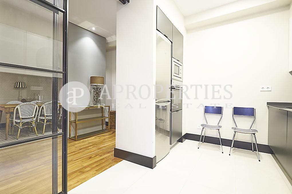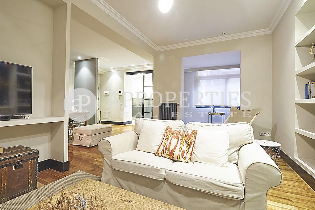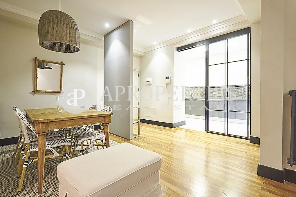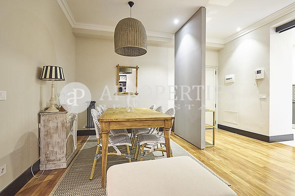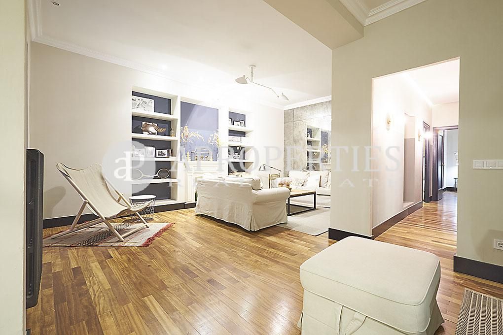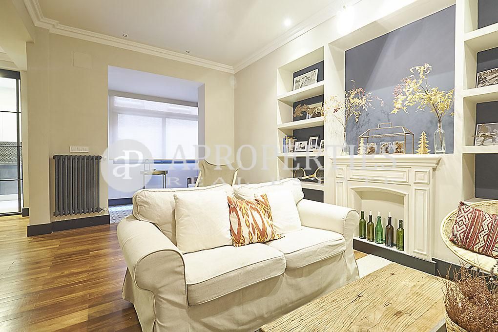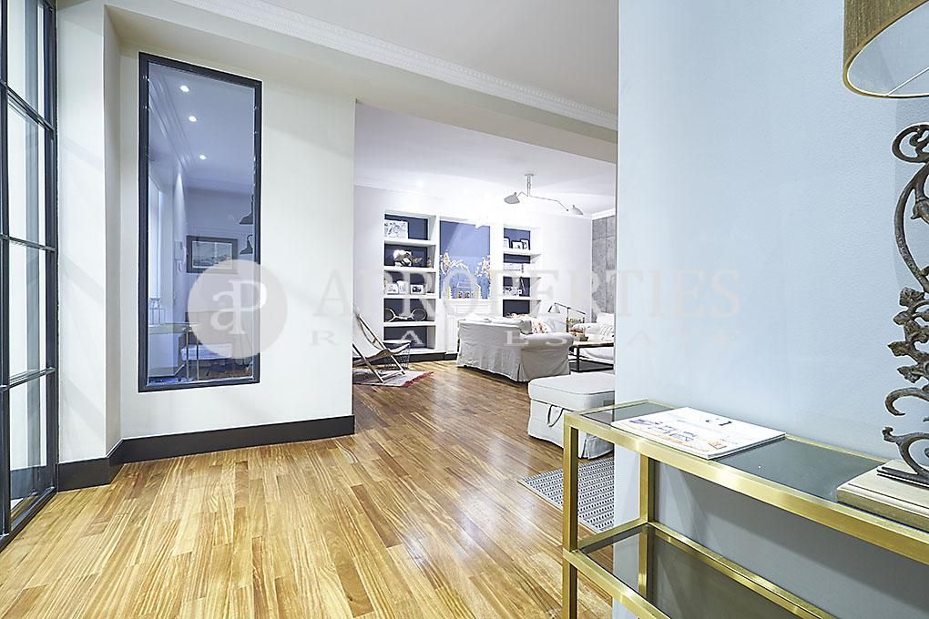 Located in a stately building on the Calle Alcalá, at the height of Manuel Becerra, we find this 116sqm house to which they have recently made a comprehensive reform (2016), with lots of charm and design. It has a large living room that has been incorporated into a terrace, fully equipped kitchen, with the best qualities of reform and independent laundry area. The house has two bedrooms, both with dressing room, and one of them with bathroom en suite. In the corridor we find another complete bathroom, with two sinks, which serves both one of the bedrooms and the guests. It has central heating and hot water, doorman every day of the week and has the possibility of renting parking spaces in the same building with direct access to the elevator. It has climalit windows, parquet floors, smooth paint, security door and the best qualities of reform.