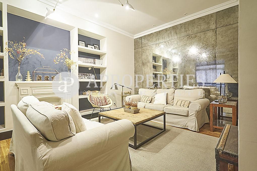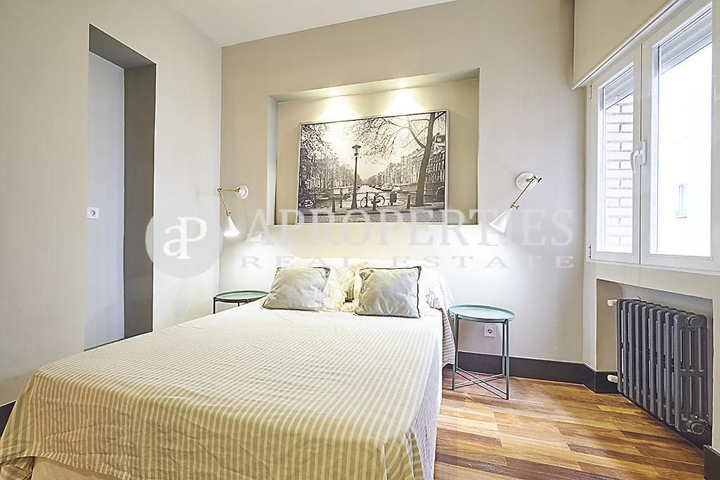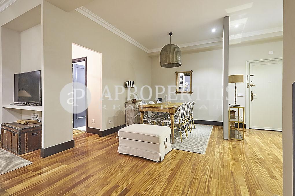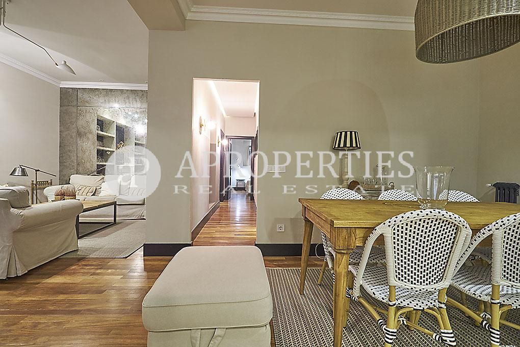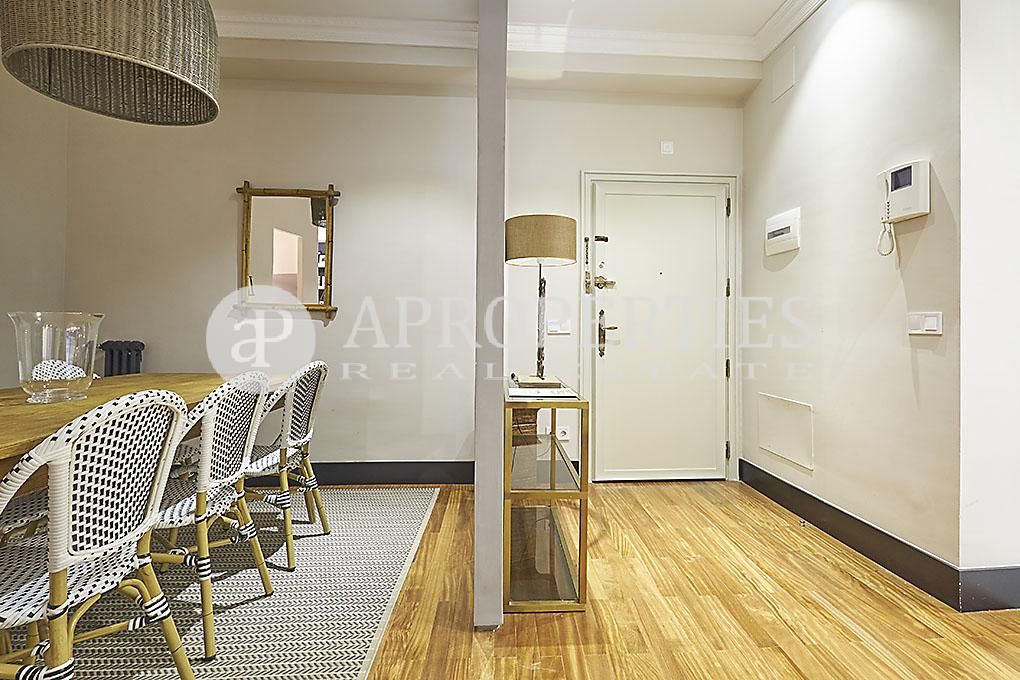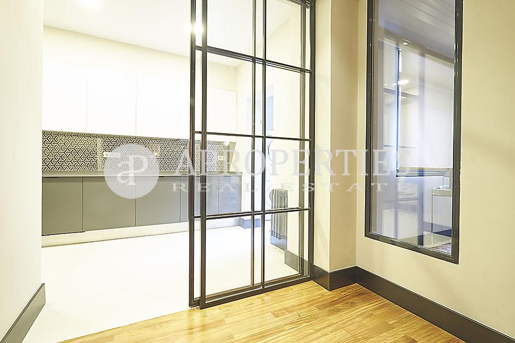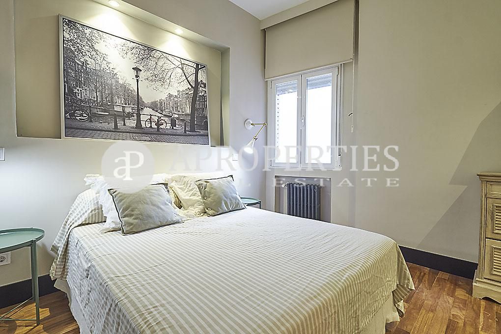 Located in a stately building on the Calle Alcalá, at the height of Manuel Becerra, we find this 116sqm house to which they have recently made a comprehensive reform (2016), with lots of charm and design. It has a large living room that has been incorporated into a terrace, fully equipped kitchen, with the best qualities of reform and independent laundry area. The house has two bedrooms, both with dressing room, and one of them with bathroom en suite. In the corridor we find another complete bathroom, with two sinks, which serves both one of the bedrooms and the guests. It has central heating and hot water, doorman every day of the week and has the possibility of renting parking spaces in the same building with direct access to the elevator. It has climalit windows, parquet floors, smooth paint, security door and the best qualities of reform.