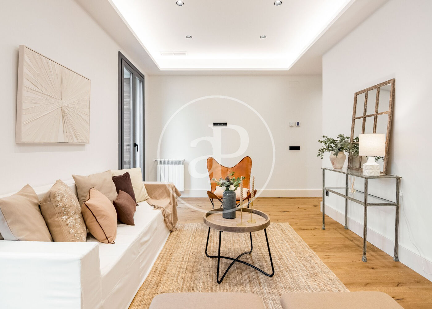 Aproperties Real Estate offers for sale this exclusive house located in a historic building with theatrical past, Calle Corredera Baja de San Pablo Located in an emblematic building with history in the heart of Malasaña, this unique property is located in what was the former National Hall and later the Cervantes Cinema. The building retains in its large portal the original period ornaments, silent witnesses of the cultural splendor of Madrid of the early twentieth century. The house has been completely renovated with high quality materials and finishes, perfectly combining the character of the historic property with a contemporary interior design, elegant and functional. Highlight its high ceilings of 2.80 m, which enhance the feeling of spaciousness and luminosity in all spaces. Distribution and spaces The layout has been carefully designed to offer comfort and style in every room: We receive an entrance hall with built-in wardrobe from floor to ceiling, ideal as gabanero or discreet storage space. Linear kitchen with two walls, organized in two environments: An open and social area, perfect for cooking and sharing. Another laundry area, type laundry fully integrated, with custom cabinets that house washing machine, dryer and additional space. The heart of the house is a spacious and bright living room, with two windows to the street, which flood the space with natural light. Distributed in two rooms: Living room area. Dining room area. Discreetly separated, we enter the rest area: Master bedroom en suite, with integrated bathroom, built-in wardrobe of large capacity (fully dressed), and access to a charming balcony overlooking the street, ideal for enjoying the neighborhood atmosphere from the intimacy of home. Secondary bedroom, and also double, with built-in wardrobe from floor to ceiling (dress), and views of a nice private patio. In front of this room we have a large bathroom. Private courtyard with dual use This outdoor space, truly unusual in the center of Madrid, functions as a natural extension of the house. Summer chill-out area, perfect for reading, relaxing or meeting friends You will have custom-designed perimeter seats and integrated storage areas, it has been conceived as a small secret garden for private use, which brings freshness. At the bottom, a structure covered and clad in wood, ideal as winter shed, storage or additional storage area. Qualities and finishes Wood-effect porcelain floors in large format slats. Home automation lighting Kitchen and bathrooms in natural stone, which bring solidity, elegance and durability. Central heating. Air conditioning by low profile ducts, fully integrated and discreet. Sectorized air conditioning system (three independent zones) The house is furnished.  With pieces of furniture created in collaboration with prestigious artists and designers.  Enclosures, carpentry and decorative details selected with aesthetic and technical criteria, providing character and distinction. Location Located in one of the most desirable streets of downtown Madrid, with immediate access to theaters, markets, small shops, local gastronomy and cultural life. Malasaña is synonymous with authenticity, dynamism and charm, and this apartment is in the heart of the neighborhood, perfectly connected by public transport. In summary: An exclusive house with soul, where history, design and comfort coexist. Ideal for those looking for a unique home in a building with protected heritage value, without sacrificing modern amenities, good taste and quality of life in the center of Madrid. Can you imagine living here?
