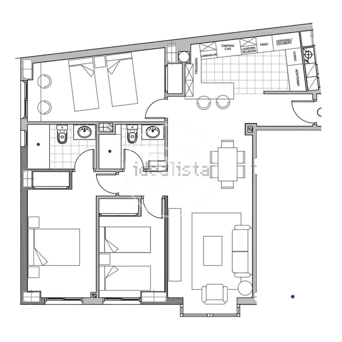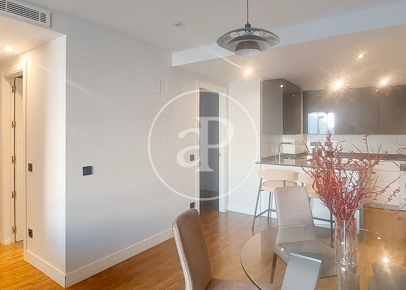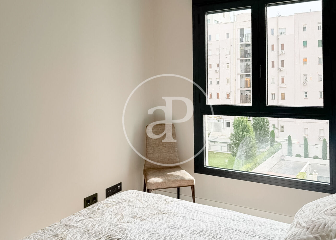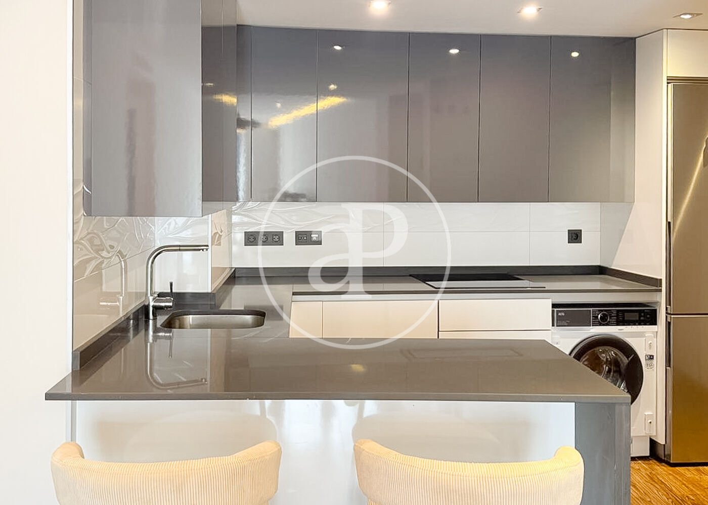 New building. Immediate availability. This 4th-floor, exterior apartment measures 120m2 and features 24-hour security. Located in the heart of Madrid, next to Retiro Park, it boasts a swimming pool, gym, and garden views. An additional parking space is available for a large car. Very bright, with functional and elegant furnishings. The living-dining room is bright and airy. The fully equipped kitchen is semi-integrated into the living area, creating a single open space. There are three bedrooms, one of which is en suite; two have double beds and the third has a single bed. Two modern bathrooms with showers complete the picture. Built-in wardrobes offer ample storage. Low-consumption aerothermal heating and cooling system. Prime location just steps from the metro.