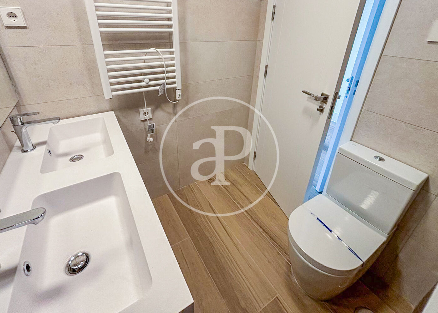 SEASONAL RENTAL 3-11 MONTHS - AVAILABLE FEBRUARY 1 - UTILITIES INCLUDED We present this stylish 49 m² apartment, bright and airy, with designer finishes. Located in one of Madrid's most traditional, vibrant, and well-connected neighborhoods. The apartment is situated on a mezzanine level and boasts excellent natural light. It has been tastefully renovated and decorated with high-quality finishes, including 3.10 m high ceilings, hardwood floors, and carefully considered lighting. It features a comfortable living room with a designer sofa and a desk ideal for studying or working from home. The integrated kitchen is fully equipped with appliances (refrigerator, oven, washing machine, microwave, and dishwasher), cookware, and a dining table. The bathroom is separate and has a shower. The bedroom, decorated in neutral tones, features a double bed, two bedside tables, and a pleasant space with windows overlooking the street. Built-in mirrored wardrobes complete the room. The Trafalgar neighborhood, in the Chamberí district, offers the best of the city: excellent connectivity, a wide range of shops on the main streets, and tranquility in the more residential areas. Its diverse culinary scene, along with parks and plazas, makes it one of the most attractive neighborhoods to live in for a while in Madrid. The apartment is delivered fully furnished and with all utilities included in the price. Can you imagine living here?