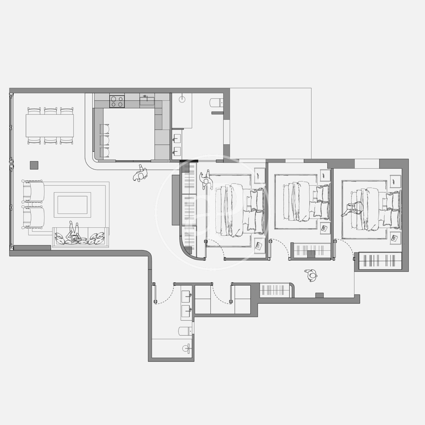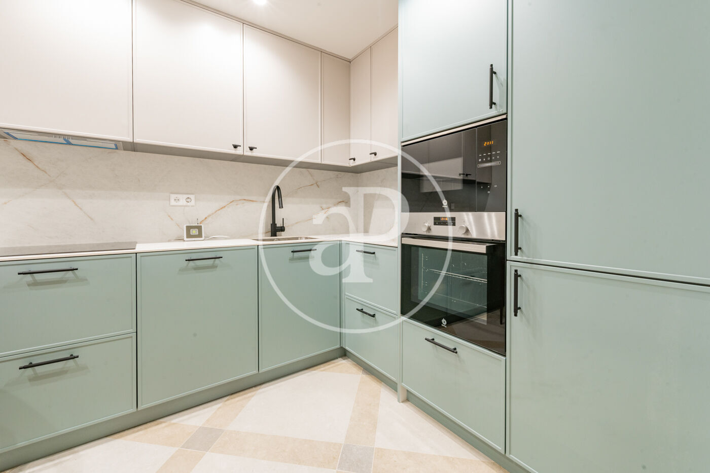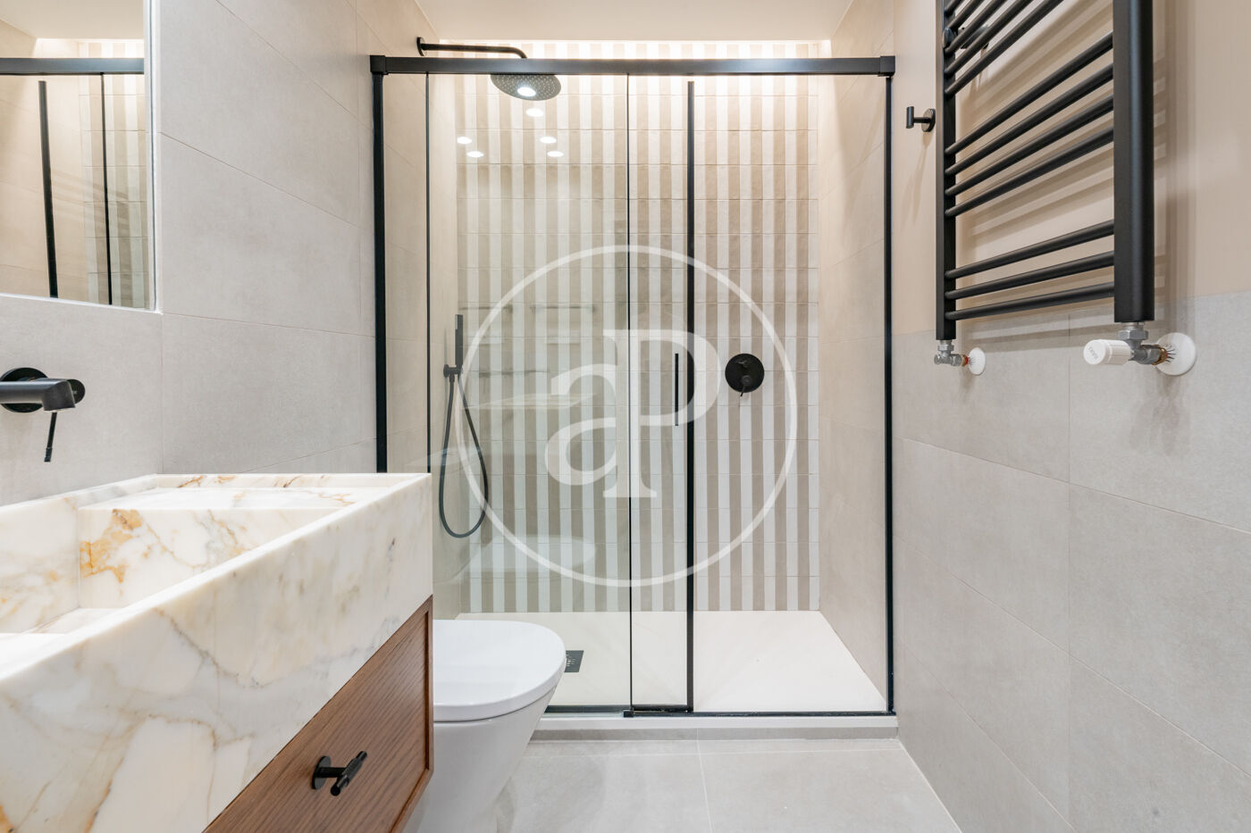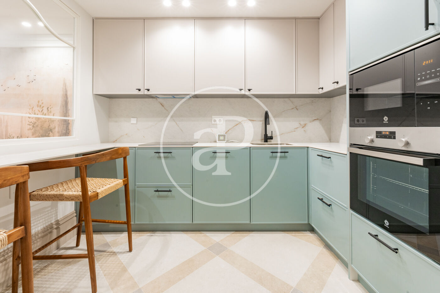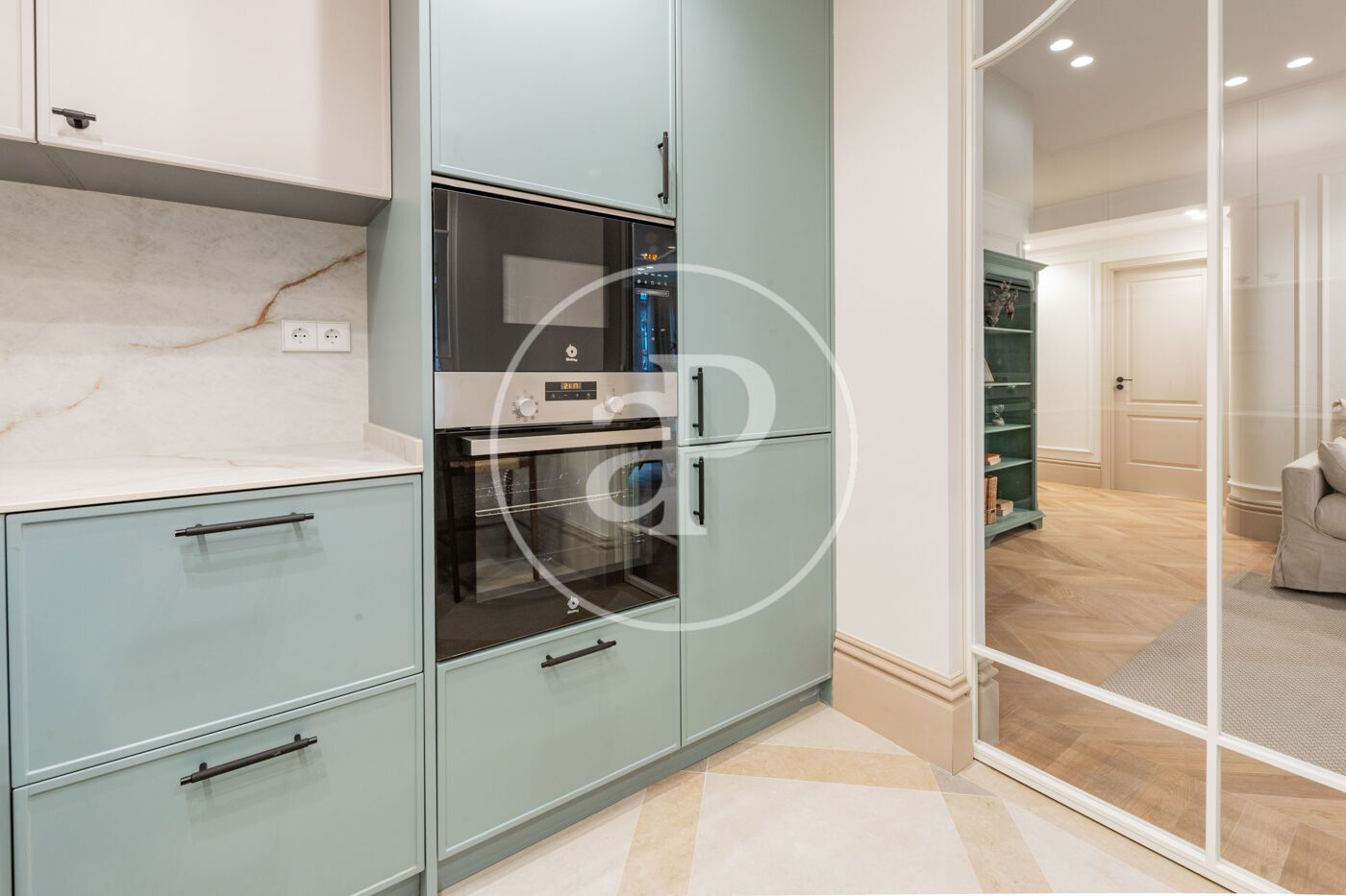 The living area consists of a spacious living-dining room with huge windows that flood the room with light, and an elegant and sophisticated design. The kitchen is semi-integrated through a beautiful wrought iron sliding door and is fully equipped with paneled appliances and a pleasant breakfast area.