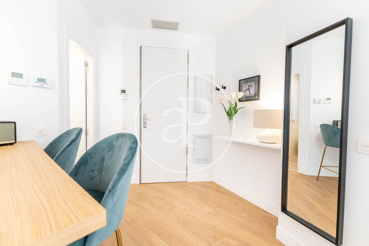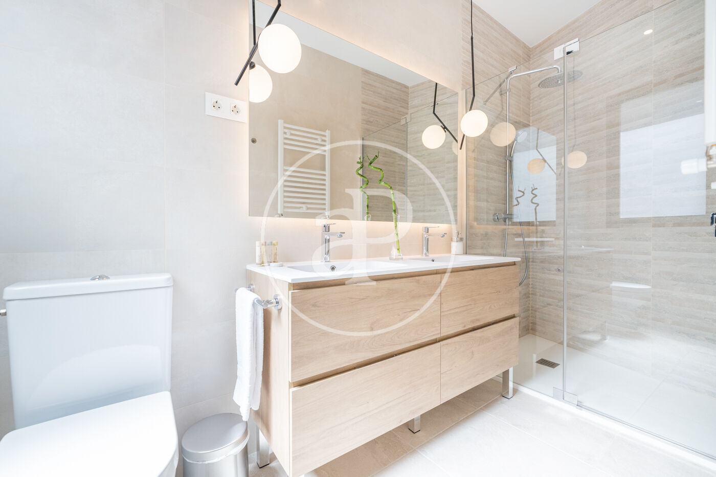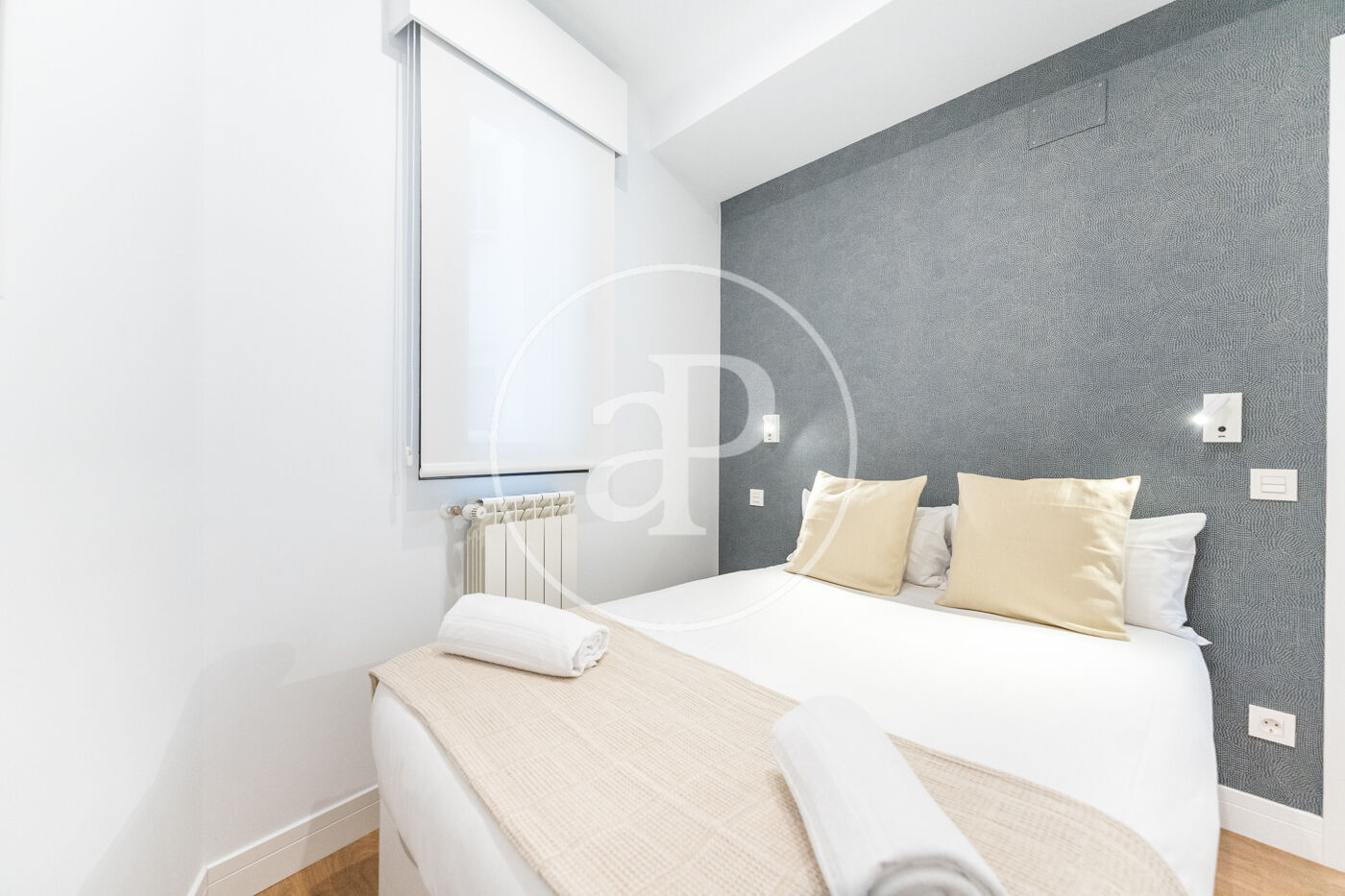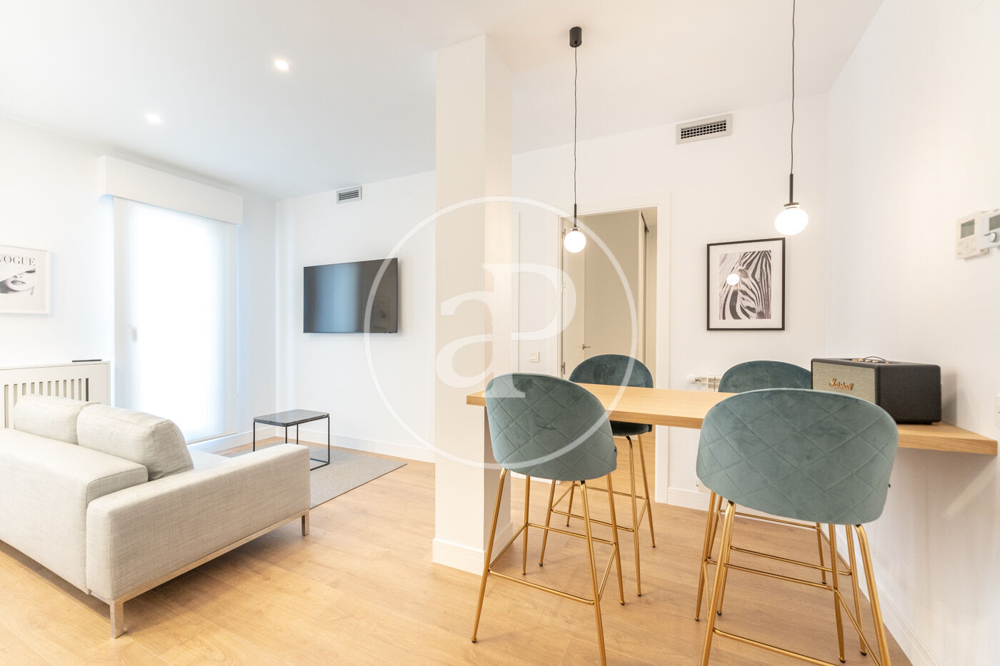 Bright apartment, furnished, in Barrio de Salamanca, brand new, two bedrooms and two bathrooms, one of them en suite. It has elevator, iron, safe, internet access (wifi), hairdryer, heating, electric radiators, air conditioning ducts, TV, radio Marshall. The building is new construction, has elevator and doorman. The open kitchen, with ceramic hob, is equipped with refrigerator, microwave, oven, freezer, washer-dryer, dishwasher, dishes/cutlery, kitchen utensils, coffee maker, toaster, kettle and juicer.