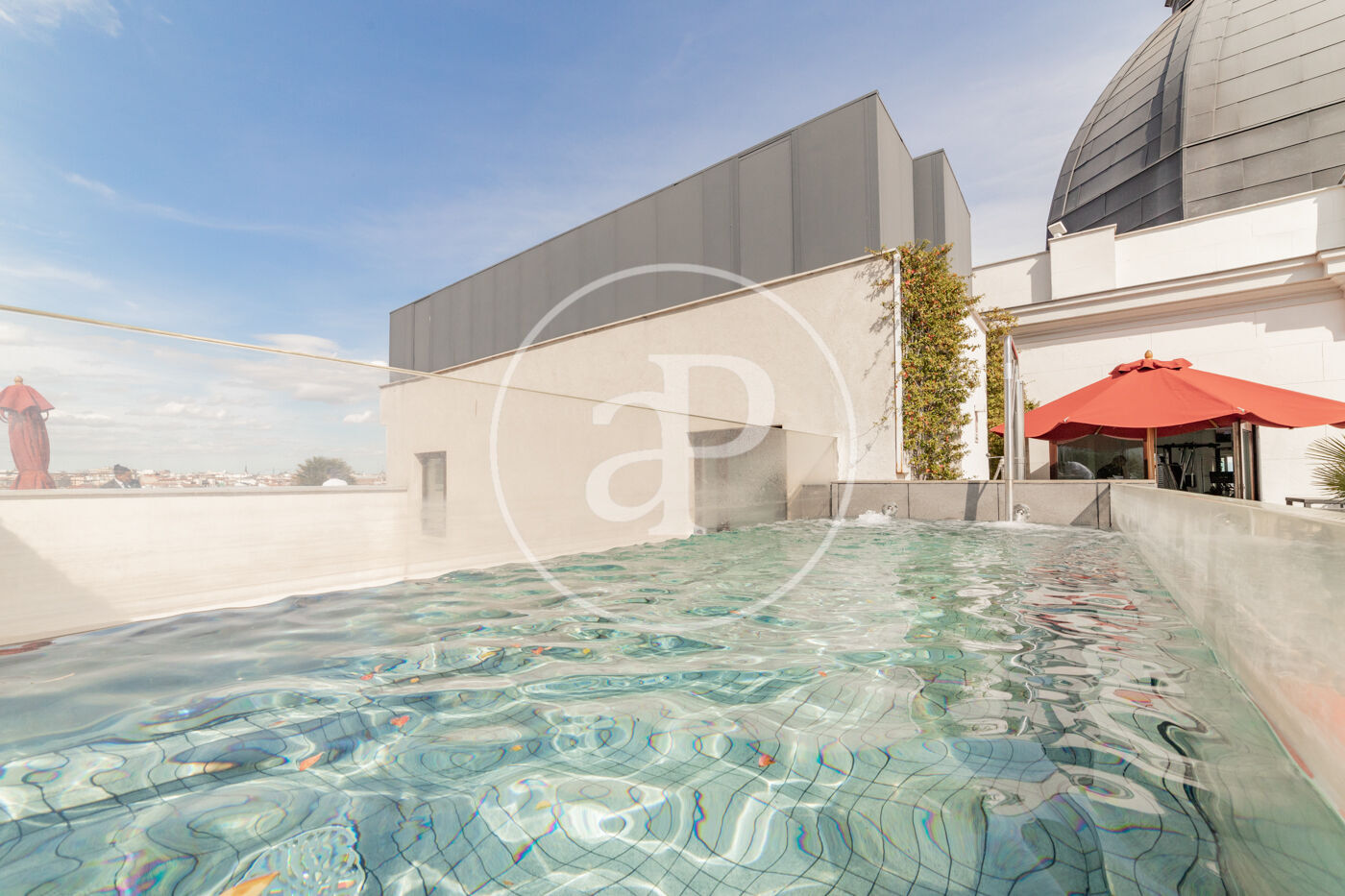 The property is located on a high floor in a historic building recently renovated as luxury housing. The property also includes gym, terrace and swimming pool on the rooftop, with privileged views of the Gran Via, the Royal Palace and the mountains of Madrid, among other attractions.