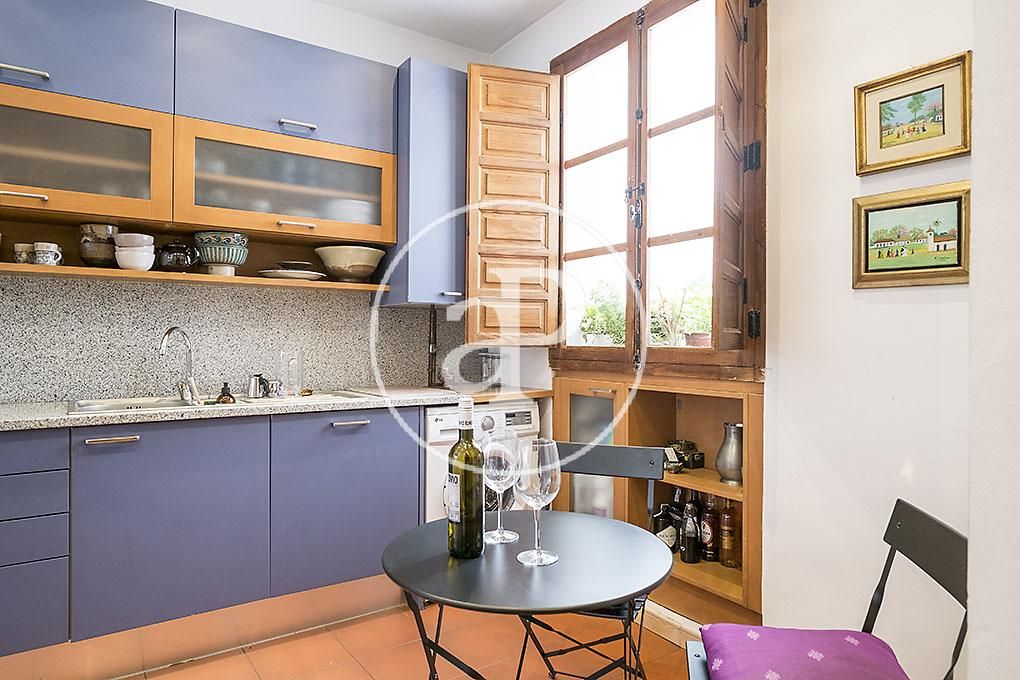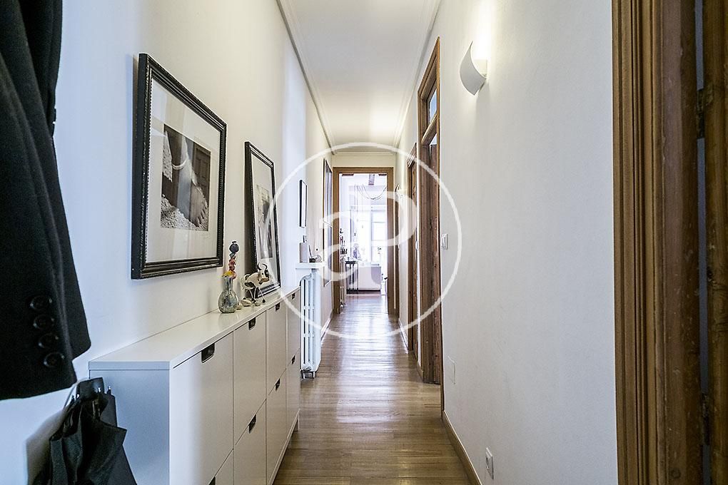 Located in a quiet street, the house is located on a farm dating back to 1900, very well preserved, and has an elevator. It is located on a second floor, with 112 m² built. The house is accessed through a corridor, from which all the rooms are accessed. The first room is a room, currently used as a dressing room, followed by the second room, the main one, adjacent to this we found a bathroom in very good condition and very spacious. The last room before entering the room is a large kitchen. All rooms have large windows, which makes them all very bright. Finally we find the living-dining area, which has three balconies to the main street and a fireplace. This space is wonderful, thanks to the south light it has, the original wooden structure and view that has been maintained and the height of ceilings. Next to this large room we have a third room that is currently a room / office, which ventilates through the large balconies of the room. The location is great, as it has a wide variety of restaurants and bars, schools, schools, shops, supermarkets and three minutes walk from the Metro stop. The house has a special charm for the light it has, the original elements preserved and the tranquility of the street.