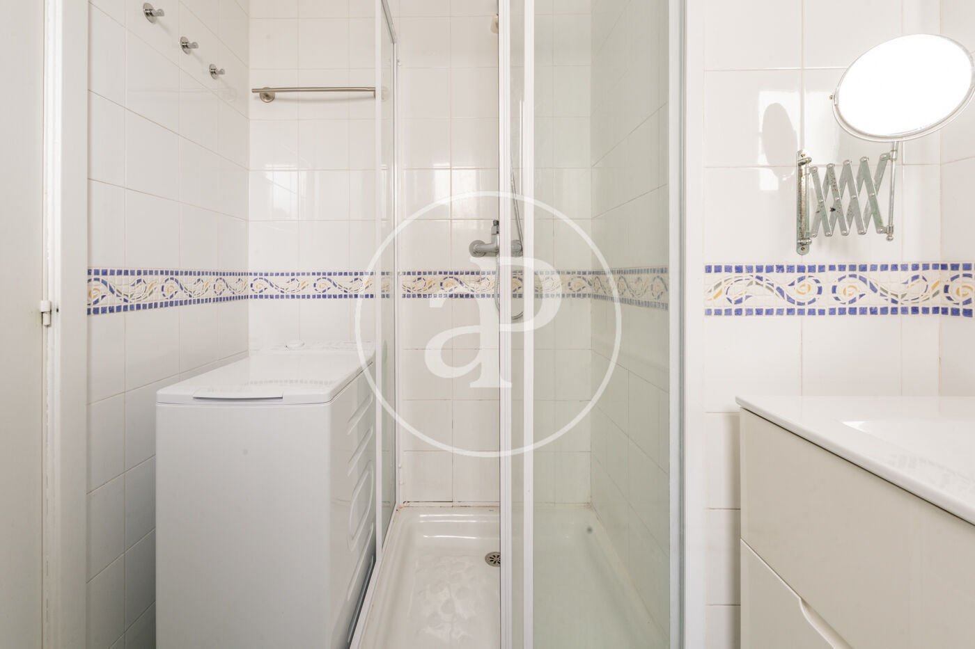 AVAILABLE FOR ALL-INCLUSIVE SEASONAL CONTRACT. STAYS FROM 1 MONTH. CAPACITY FOR 4 PEOPLE Exclusive exterior housing, newly renovated, 2 bedrooms and 2 bathrooms en suite. It consists of entrance hall, fully equipped kitchen with appliances of the highest quality, living room, 2 separate bedrooms and 2 bathrooms en suite. One of the bedrooms has a double bed, while the other has a stackable bed that transforms into a double bed or two single beds, as shown in the photos.  The apartment has wooden floors, underfloor heating, double glazed windows, ample storage space, automatic blinds, SmartTV 65'‘ in the living room and 43’' in the master bedroom, safe.  All furnishings are brand new. All utilities are included in the price such as water, electricity, heating, air conditioning, 1GB fiber optic internet. The property is located on a high floor in a historic building recently renovated as luxury housing. The property also includes gym, terrace and swimming pool on the rooftop, with privileged views of the Gran Via, the Royal Palace and the mountains of Madrid, among other attractions. Located on Madrid's most famous street, just a few meters from Plaza de España and with an unlimited supply of restaurants, shopping and entertainment in the area, it is perfect for those who value the convenience of having everything at their fingertips and enjoy a dynamic lifestyle. Can you imagine living here?