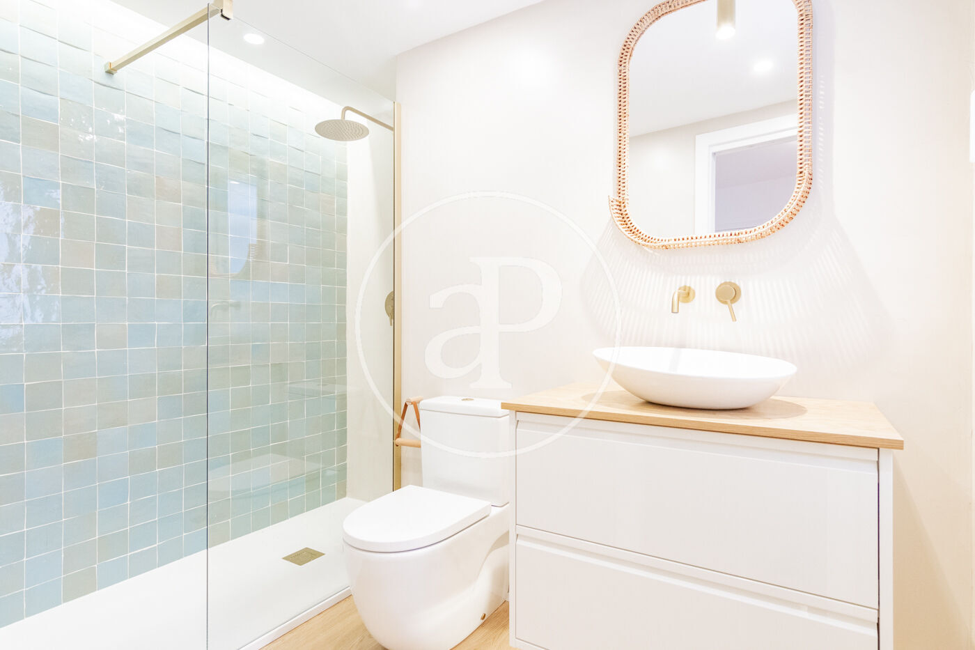 Upon entering, you will be greeted by a spacious and bright living room that offers a cozy space to relax and spend time with family and friends. The modern and fully equipped kitchen integrated in the living room is perfect for food lovers, with high-end appliances and a large central island. Next to the kitchen is a guest toilet for convenience and separate laundry room. From the living room there is access to the private terrace, ideal for enjoying moments outdoors and relaxing with views of the urban environment.