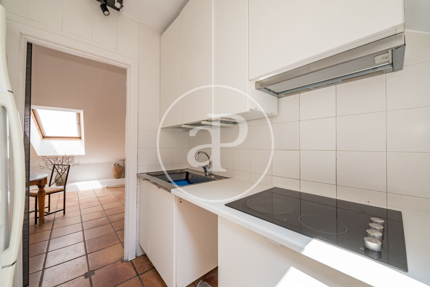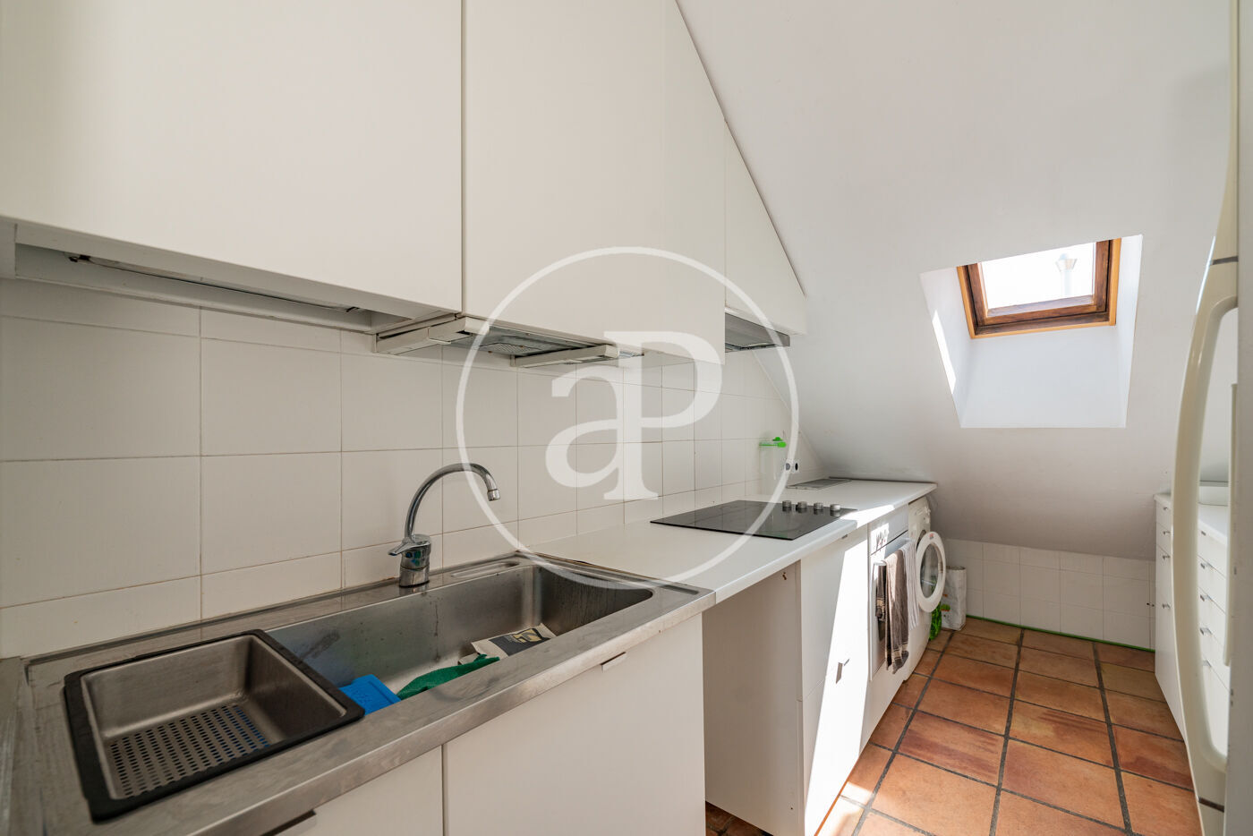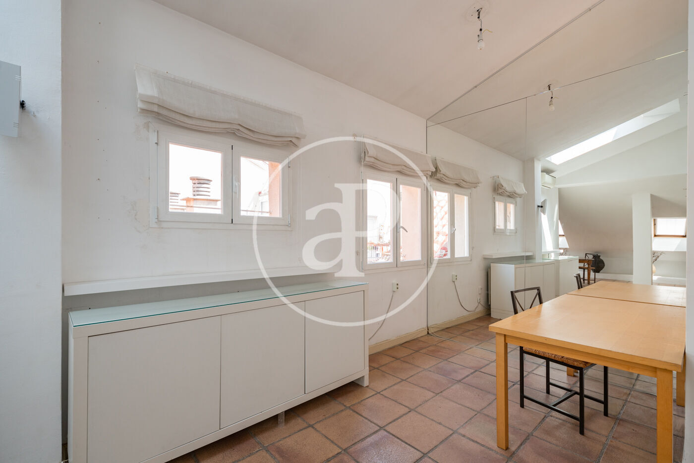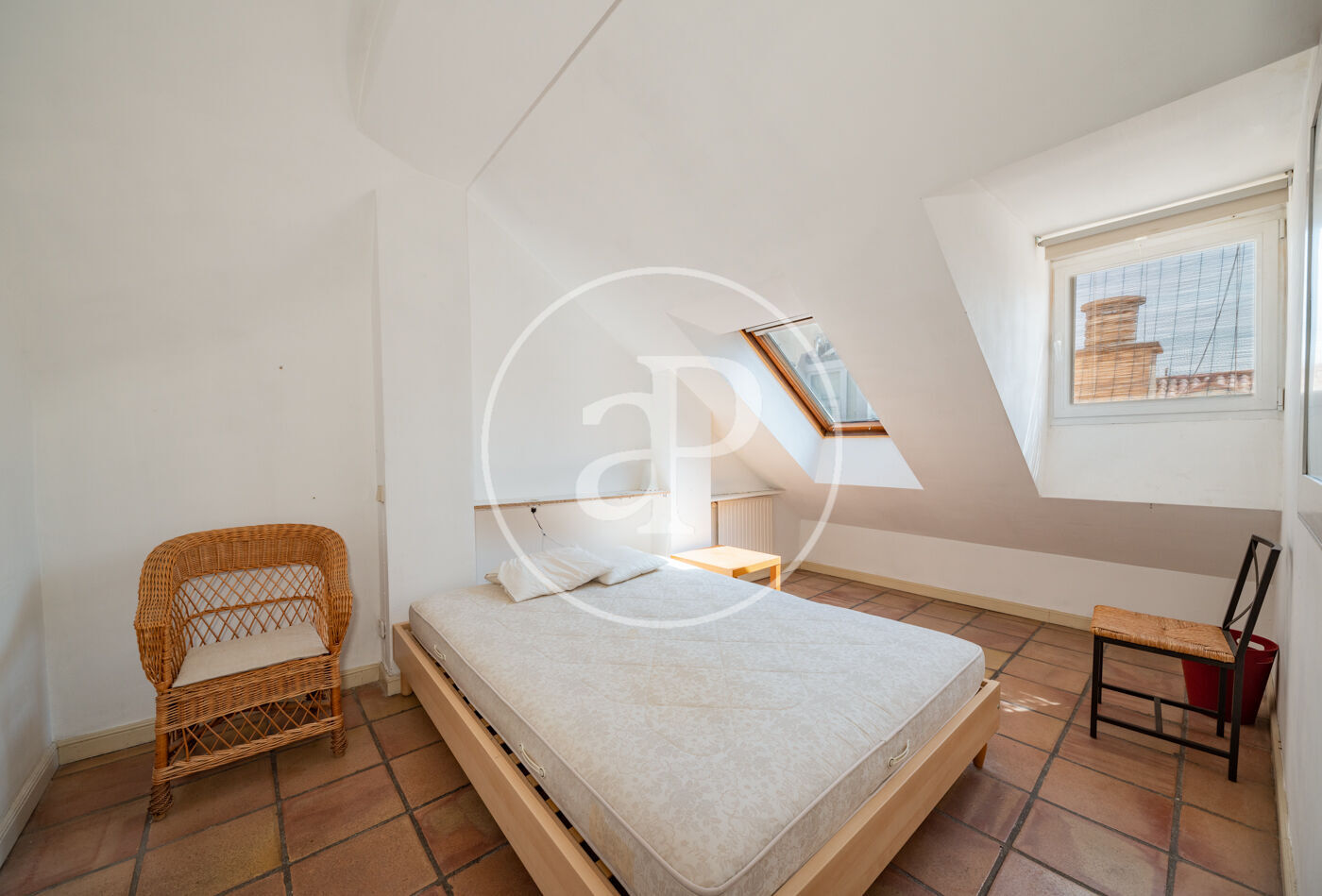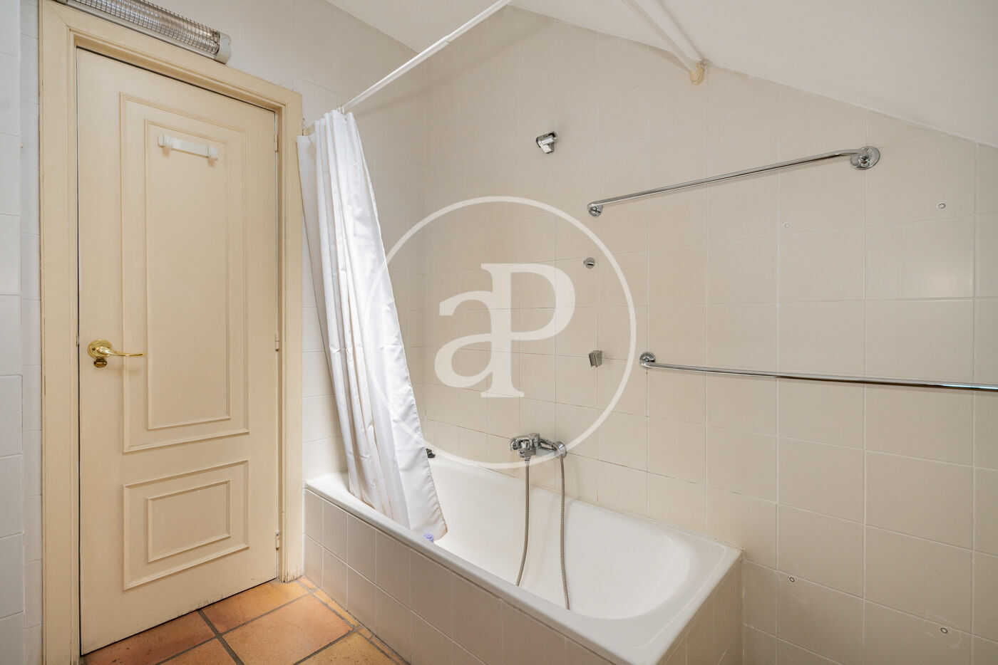 The house is accessed through a beautiful portal representative of the area. Inside, the building has a spectacular landscaped courtyard. The property, located on the fourth floor, is currently distributed in a very spacious living-dining room with high ceilings and lots of light. In the interior, it has been opted for large and uncluttered spaces, and for this reason it is currently distributed in a bedroom, kitchen and a bathroom, but due to its height and size, the house could easily be converted into a loft, with many possibilities to modernise and even convert it into a flat with 2 bedrooms and 2 bathrooms, or even 3, given its square metres.