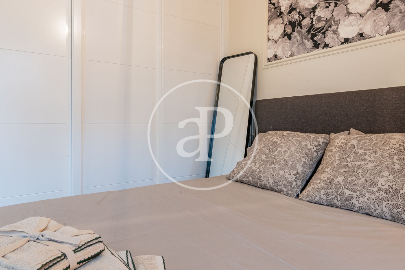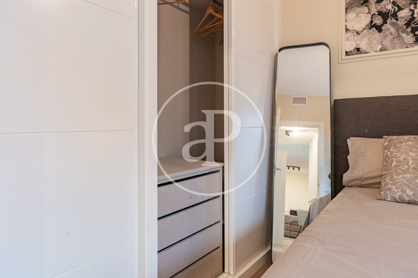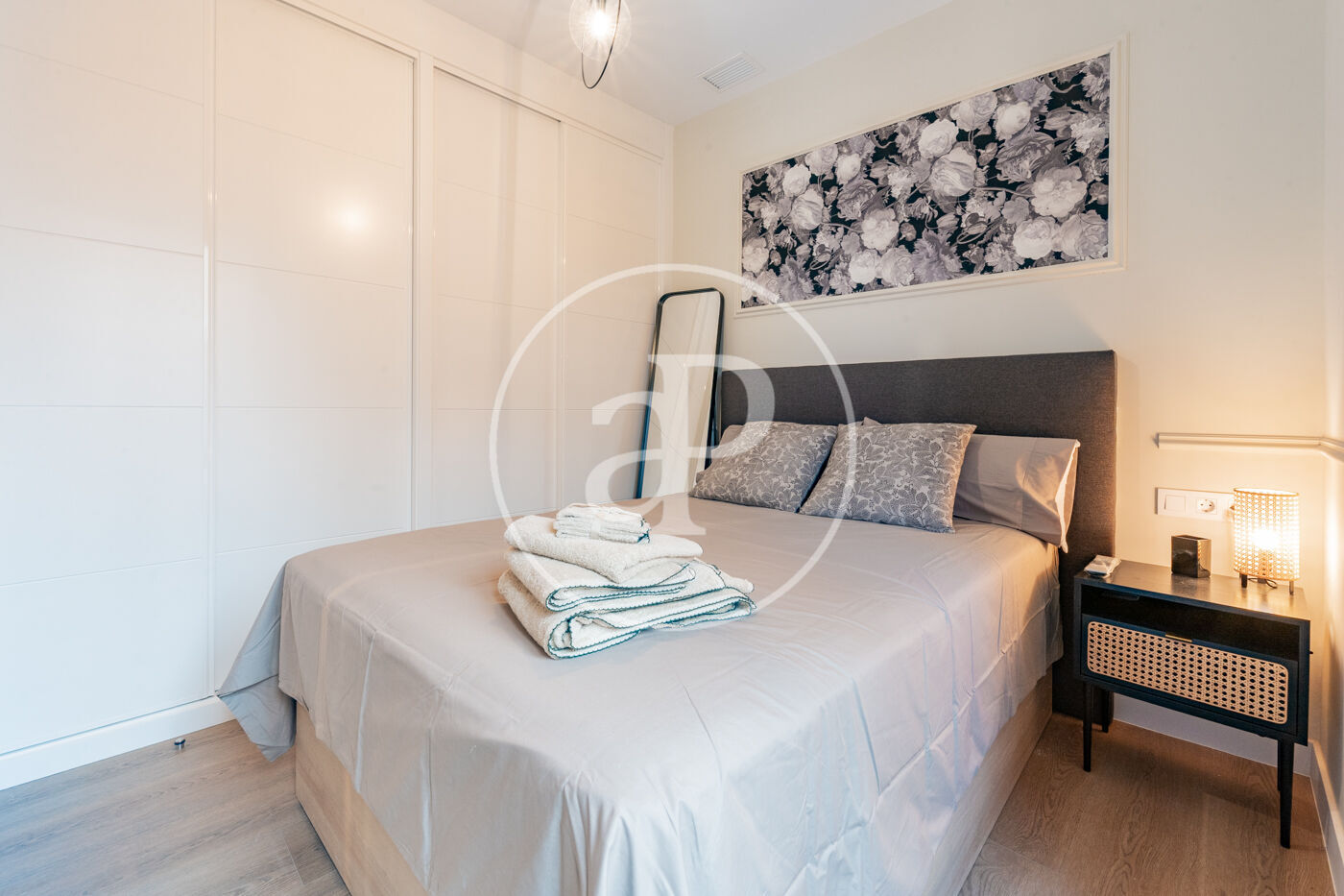 The hallway leads to the sleeping area, which consists of a full bathroom and a double bedroom with a balcony, spacious built-in wardrobes, and a Smart TV.
