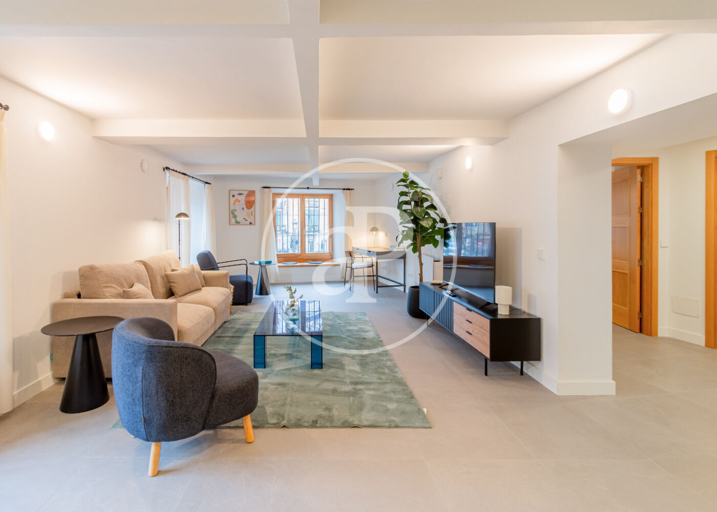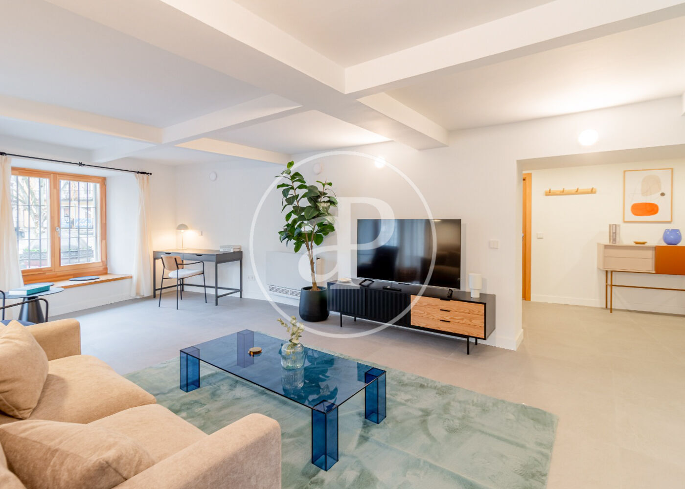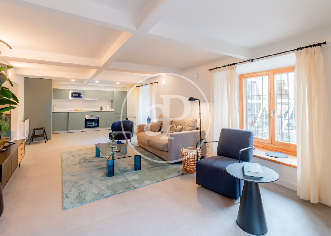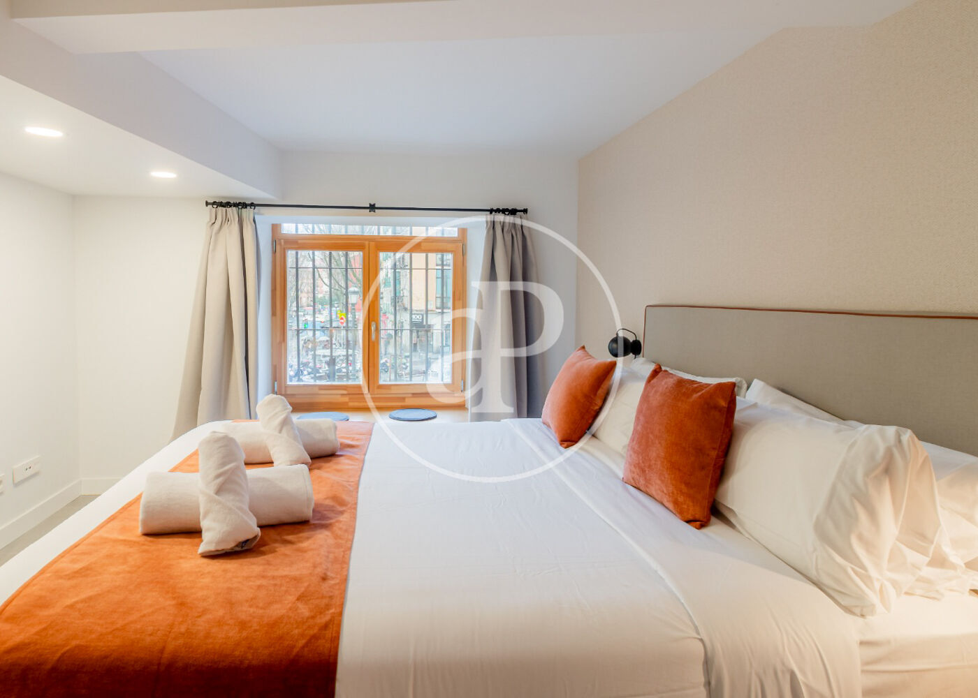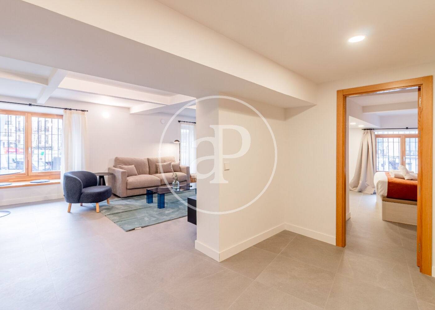 MINIMUM STAY OF 1 YEAR. IMMEDIATE ENTRY. Cozy duplex penthouse with 1 bedroom and 1 bathroom, located in a historic building in the heart of Madrid de los Austrias. The property has 70 m² of constructed area, distributed on two floors. On the main floor, there is a spacious living room with windows facing south, which offer great luminosity, high sloping ceilings and original wooden beams that provide a rustic and elegant touch. On this same floor is the kitchen, fully equipped with all appliances and with a window to the outside, which ensures good ventilation and natural lighting. The upper floor houses the bedroom, which has a railing and views of the living room, creating a modern space. The bathroom, en suite, has a shower and bathtub. The penthouse comes fully equipped and furnished, including kitchenware. It also has air conditioning, electric heating and a charming fireplace that brings warmth and character to the house. Water consumption is included in the rental price. Its privileged location allows you to enjoy a wide cultural and entertainment offer, just a few steps from the Plaza de la Paja, the Almudena Cathedral and green areas such as Campo del Moro. In the surroundings, there are several stores, bars, supermarkets and garages, as well as excellent connections with public transport that facilitate access to any part of Madrid. Can you imagine living here?