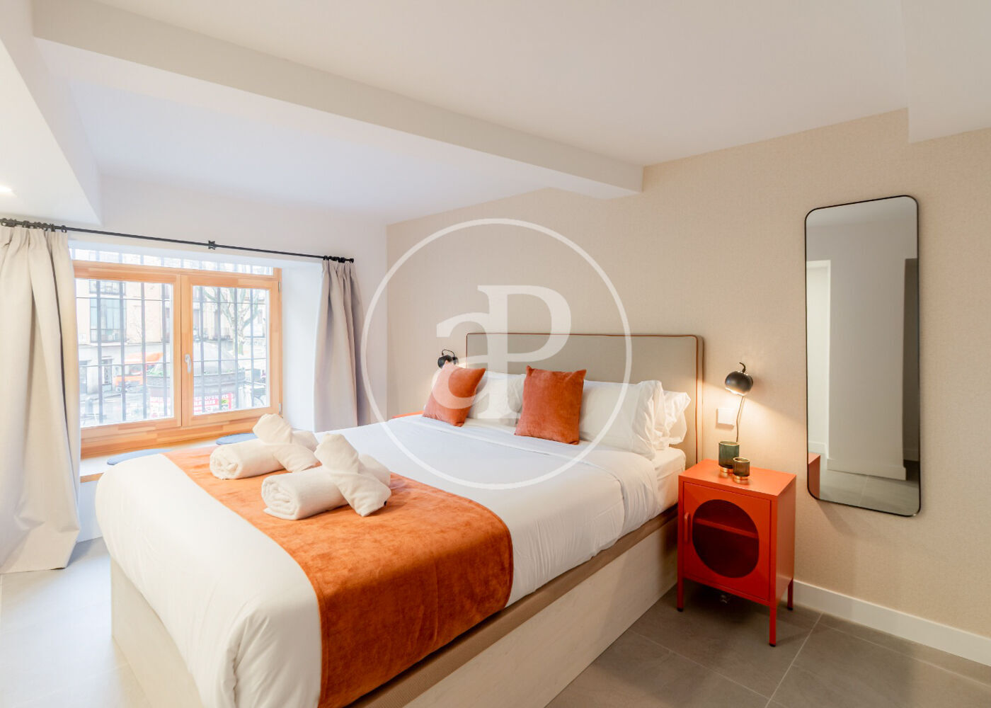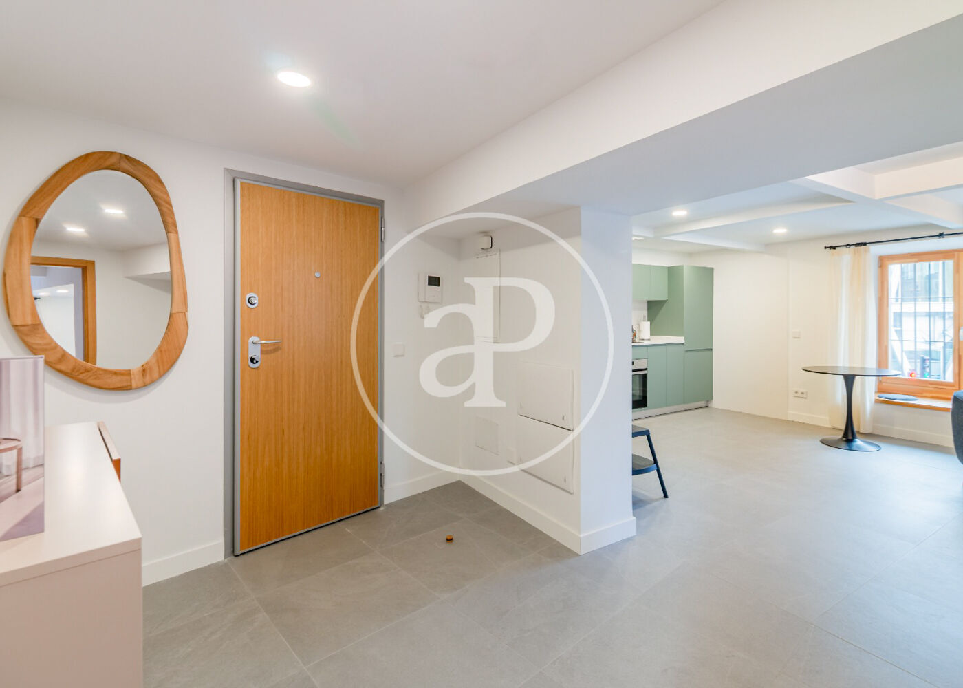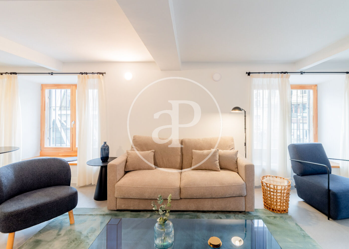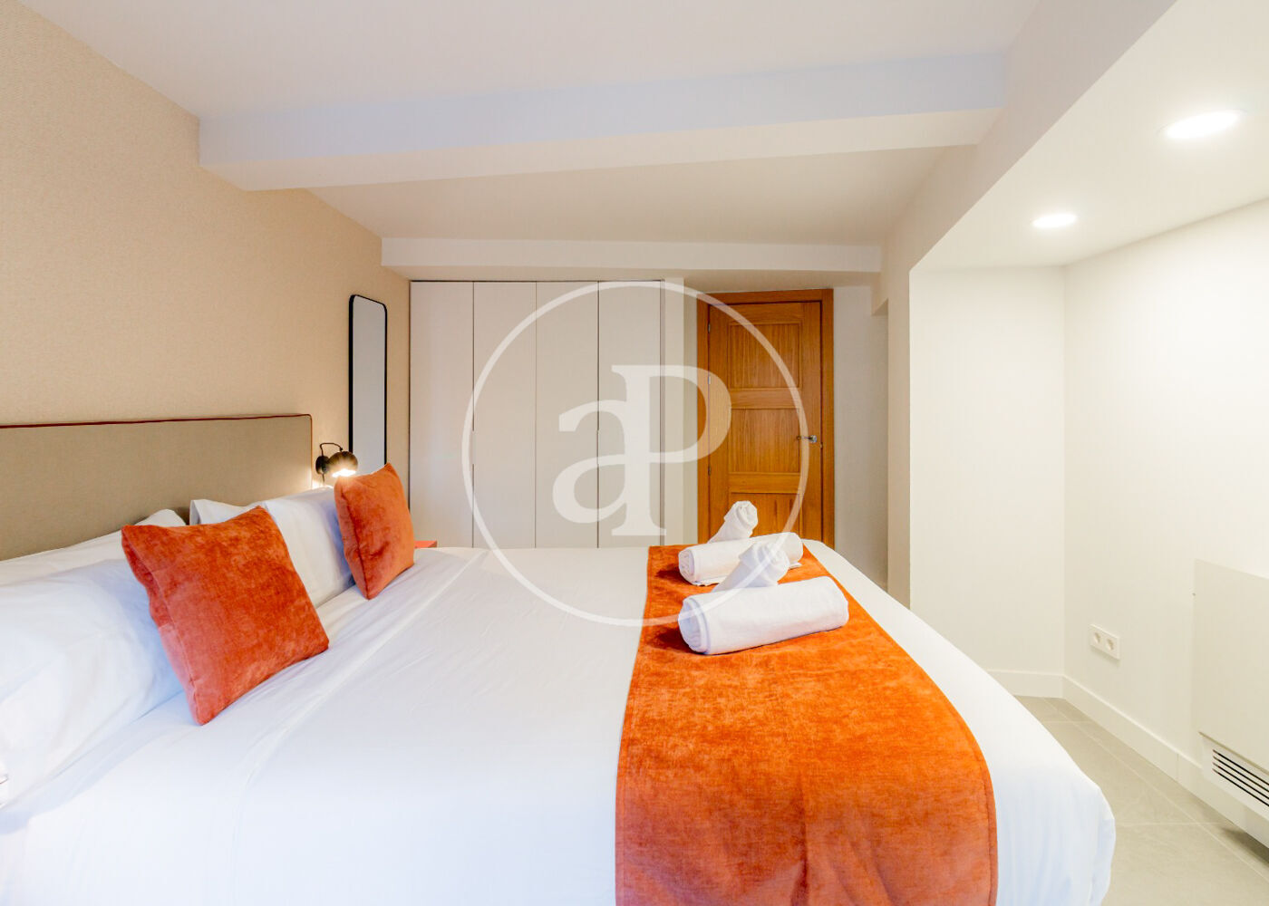 MINIMUM STAY OF 1 YEAR. IMMEDIATE ENTRY. Cozy duplex penthouse with 1 bedroom and 1 bathroom, located in a historic building in the heart of Madrid de los Austrias. The property has 70 m² of constructed area, distributed on two floors. On the main floor, there is a spacious living room with windows facing south, which offer great luminosity, high sloping ceilings and original wooden beams that provide a rustic and elegant touch. On this same floor is the kitchen, fully equipped with all appliances and with a window to the outside, which ensures good ventilation and natural lighting. The upper floor houses the bedroom, which has a railing and views of the living room, creating a modern space. The bathroom, en suite, has a shower and bathtub. The penthouse comes fully equipped and furnished, including kitchenware. It also has air conditioning, electric heating and a charming fireplace that brings warmth and character to the house. Water consumption is included in the rental price. Its privileged location allows you to enjoy a wide cultural and entertainment offer, just a few steps from the Plaza de la Paja, the Almudena Cathedral and green areas such as Campo del Moro. In the surroundings, there are several stores, bars, supermarkets and garages, as well as excellent connections with public transport that facilitate access to any part of Madrid. Can you imagine living here?
