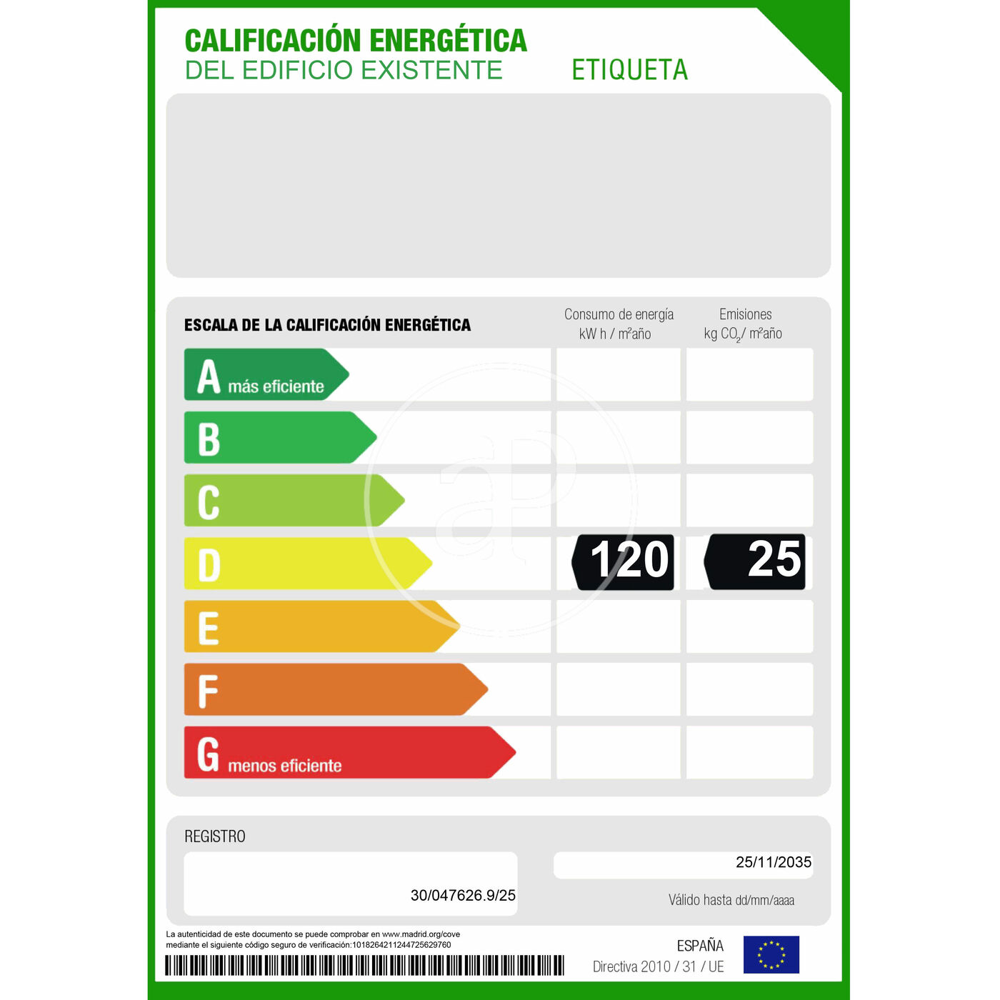 More efficient Less efficient Energy efficiency rating Energy consumption Kw h/m² year Emissions Co/m² year 120.00 25.00