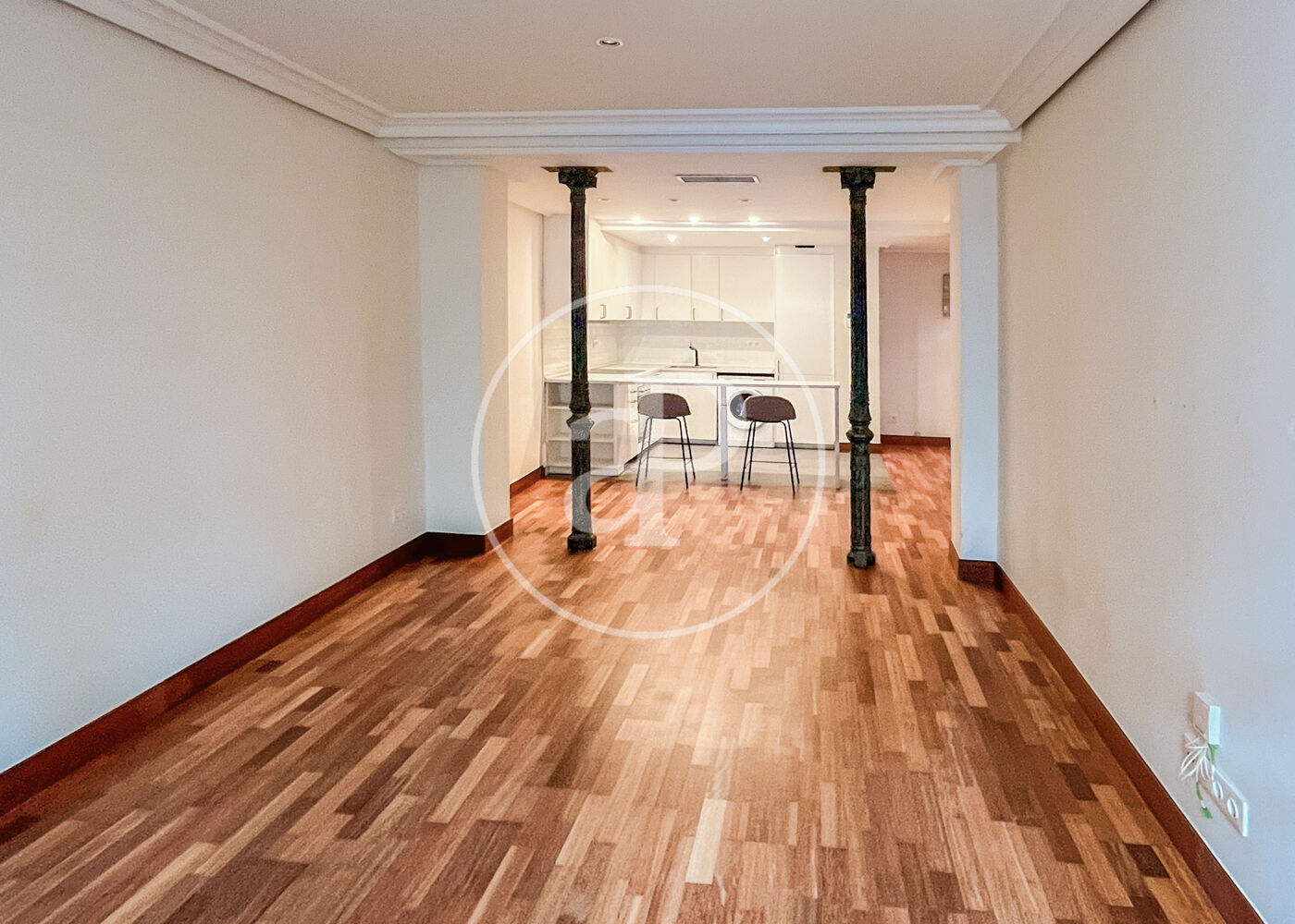 The apartment features a spacious living-dining room, full of character, with parquet floors, original columns, and excellent natural light, creating a warm and elegant atmosphere.