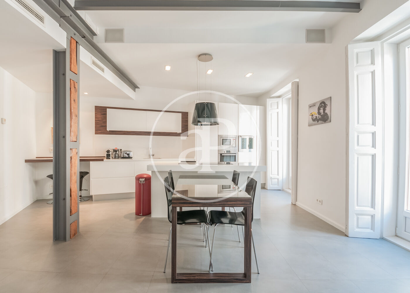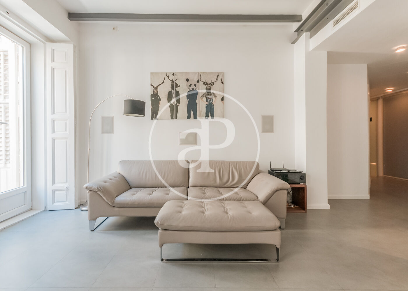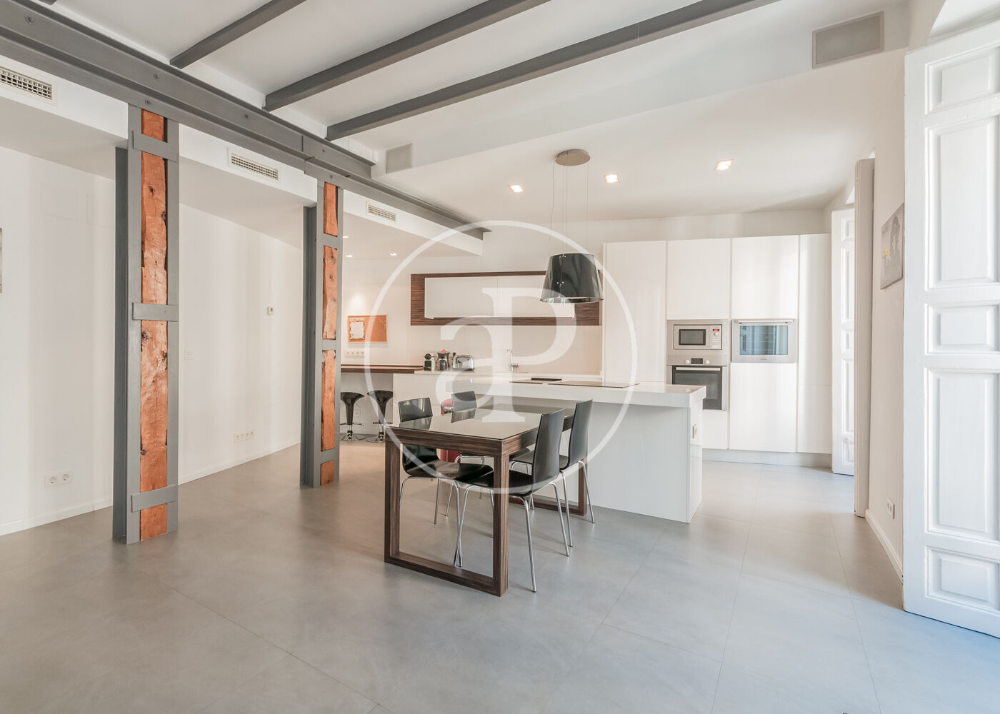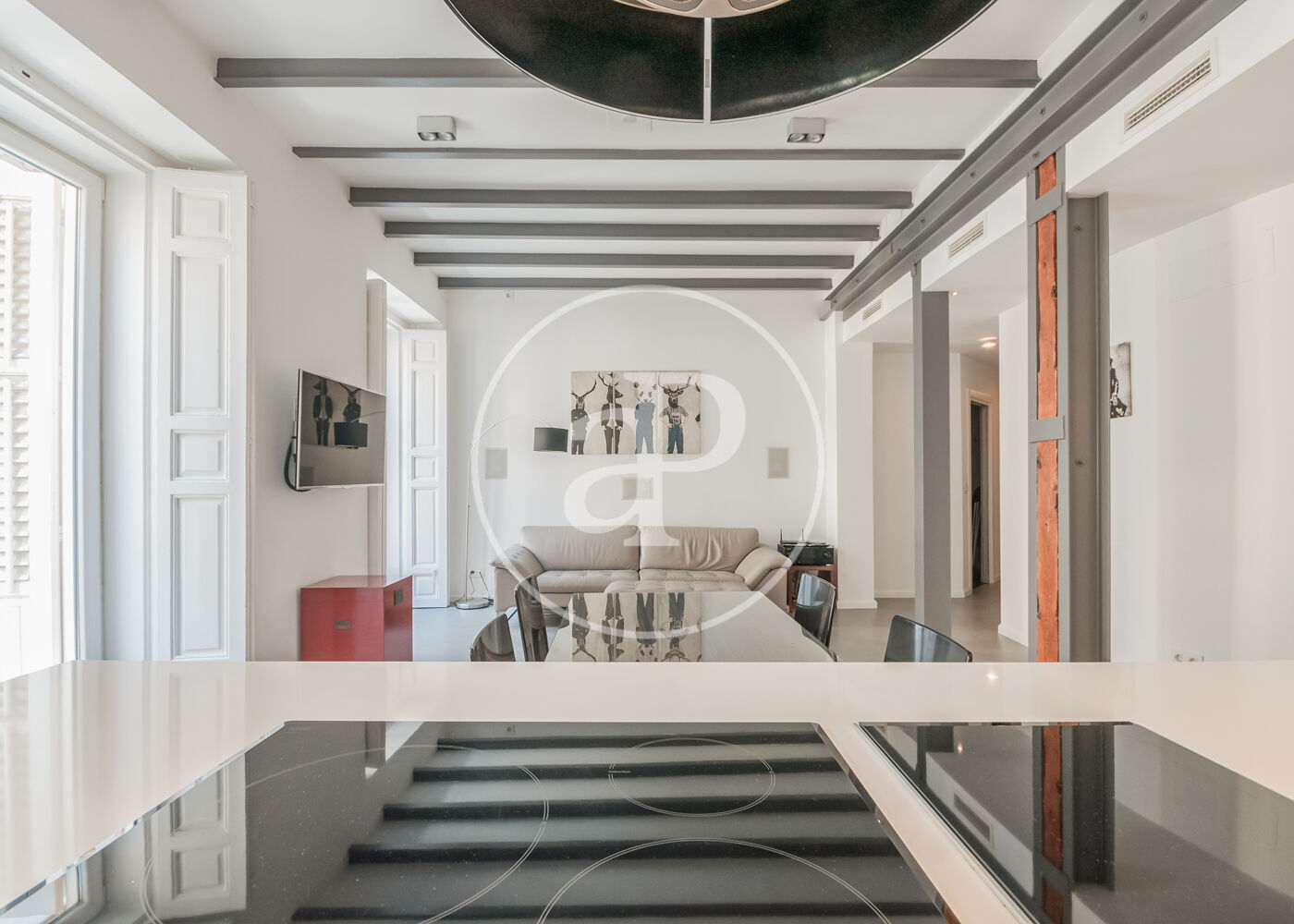 Loft-style apartment of 68m2. The bright living room features exposed iron and wood beams, 3.5-meter-high ceilings, and three classic balconies overlooking the street. The open-plan kitchen, by the Italian brand Banni, comes fully equipped with Bosch appliances: refrigerator, freezer, dishwasher, oven, microwave, wine cooler, induction hob, grill, etc. The apartment has two bedrooms with sliding glass doors. One has a queen-size bed, and the other has a 135cm bed. The second bedroom has two built-in wardrobes, one for shoes and one for clothes. Both bedrooms are very quiet and located on the interior side of the apartment.