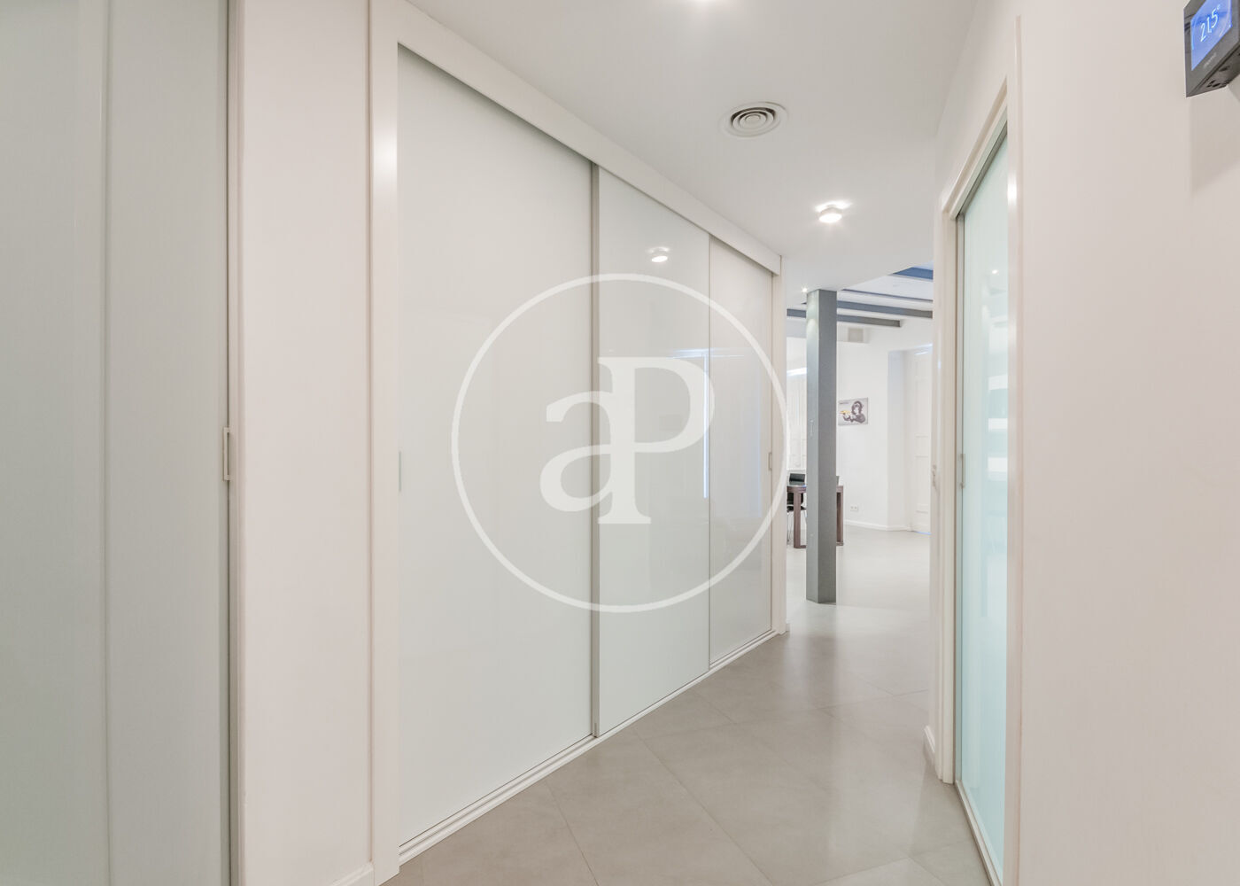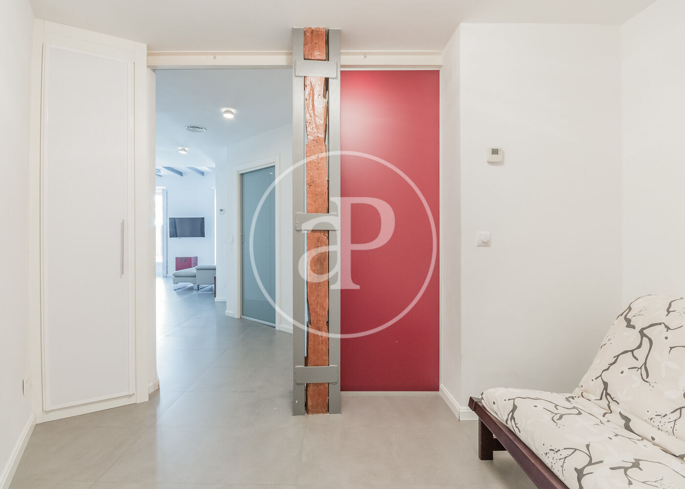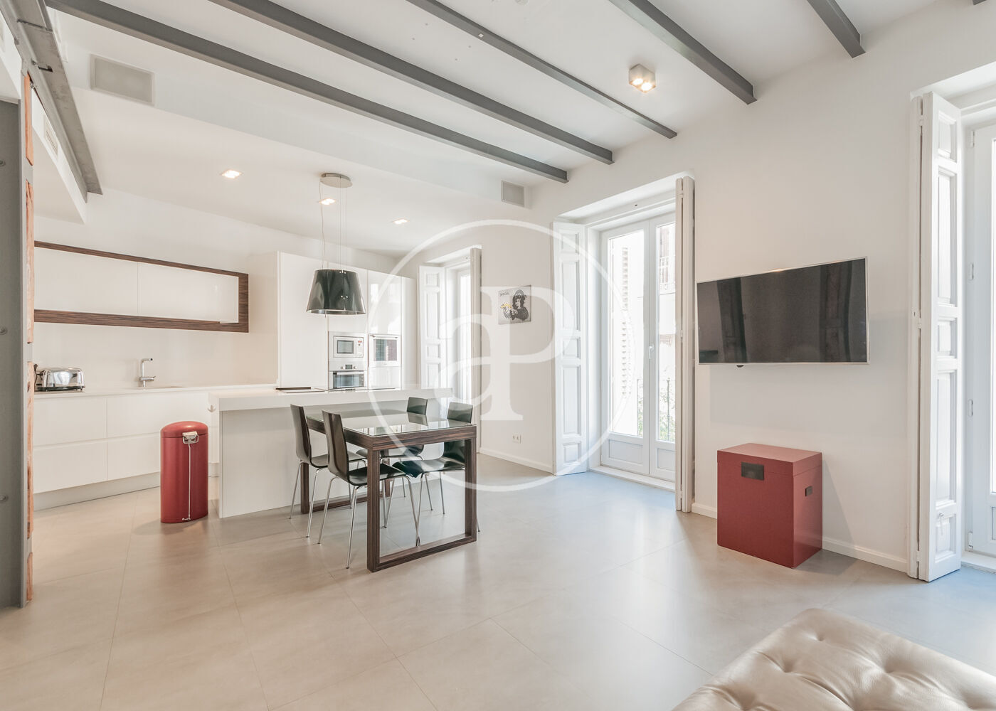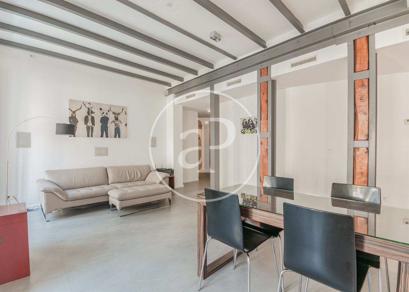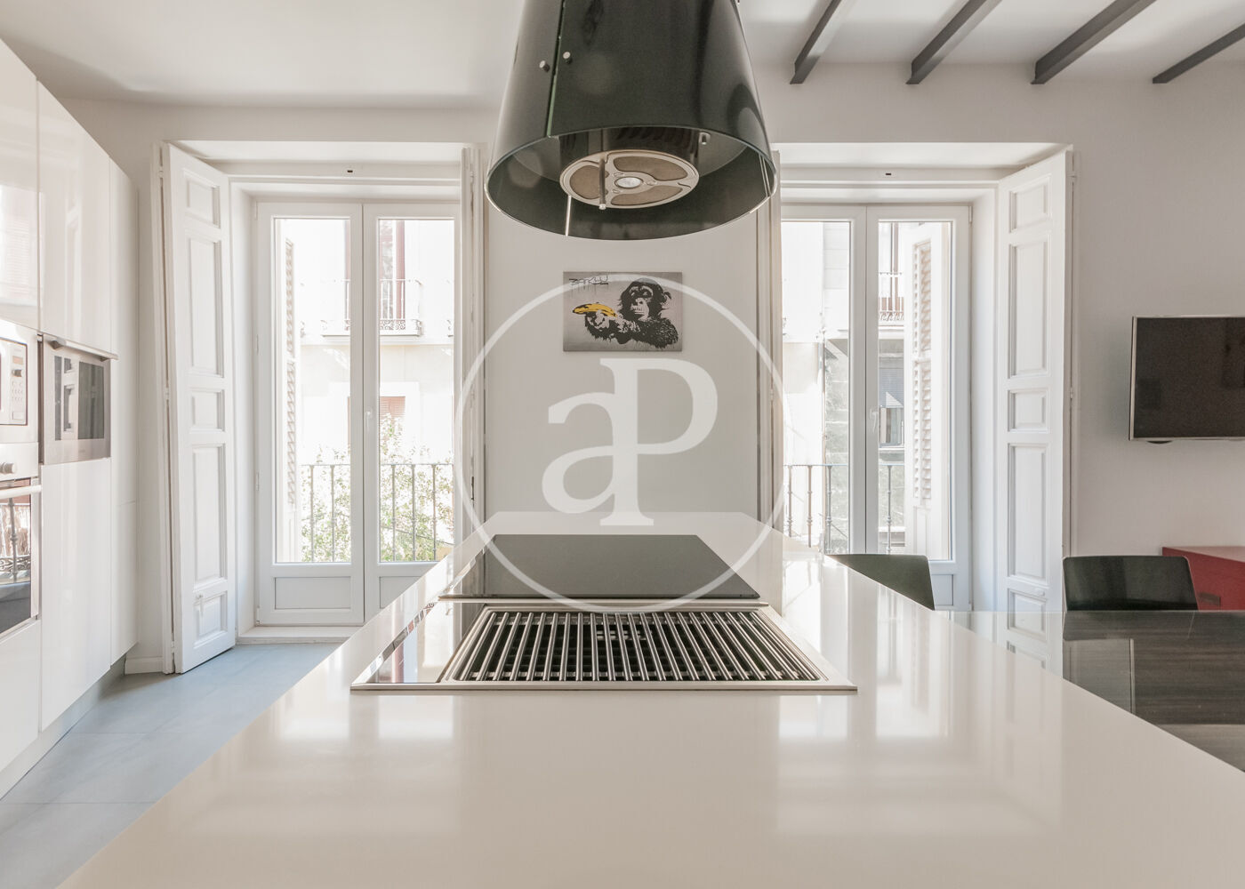 Loft-style apartment of 68m2. The bright living room features exposed iron and wood beams, 3.5-meter-high ceilings, and three classic balconies overlooking the street. The open-plan kitchen, by the Italian brand Banni, comes fully equipped with Bosch appliances: refrigerator, freezer, dishwasher, oven, microwave, wine cooler, induction hob, grill, etc. The apartment has two bedrooms with sliding glass doors. One has a queen-size bed, and the other has a 135cm bed. The second bedroom has two built-in wardrobes, one for shoes and one for clothes. Both bedrooms are very quiet and located on the interior side of the apartment.
