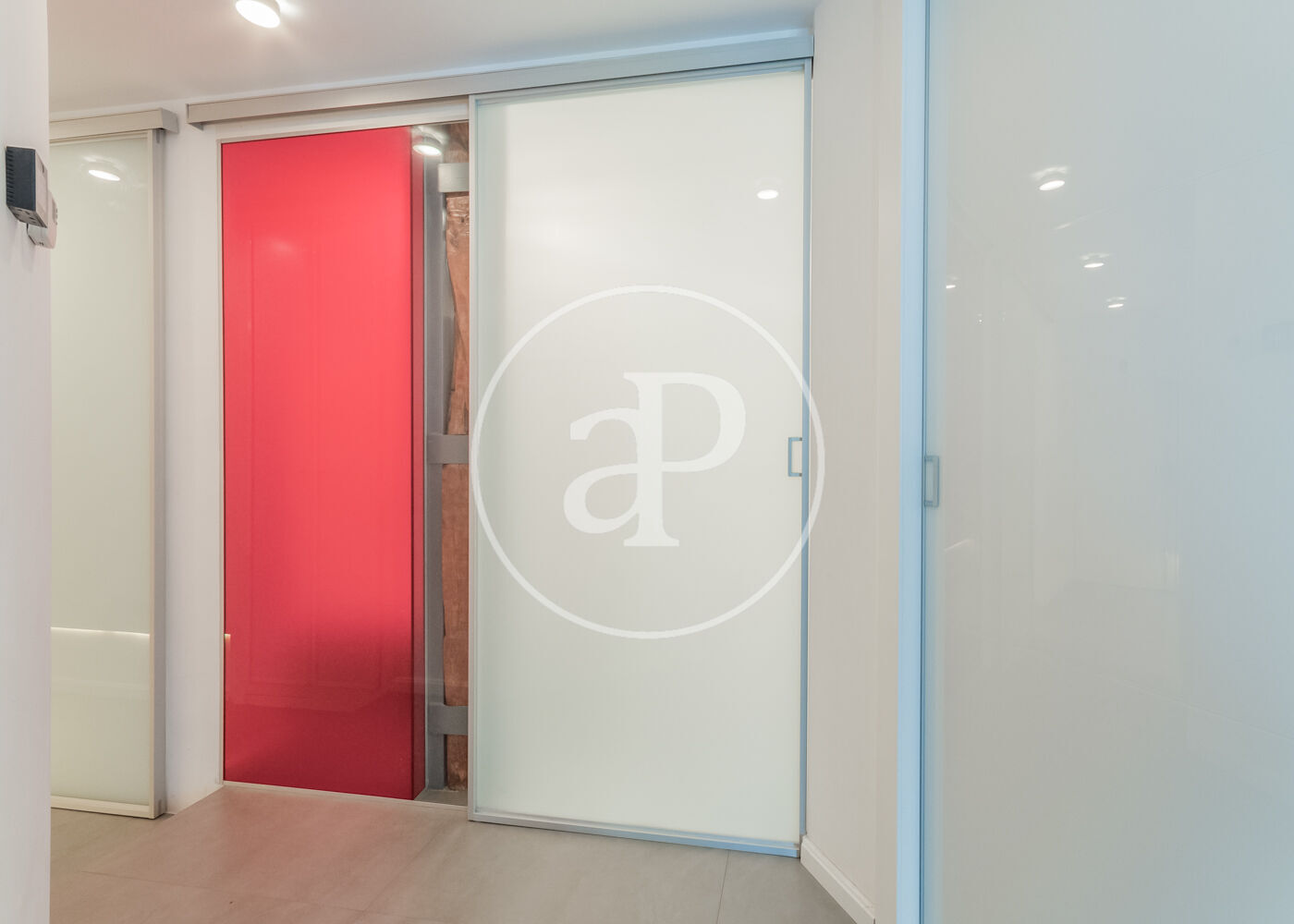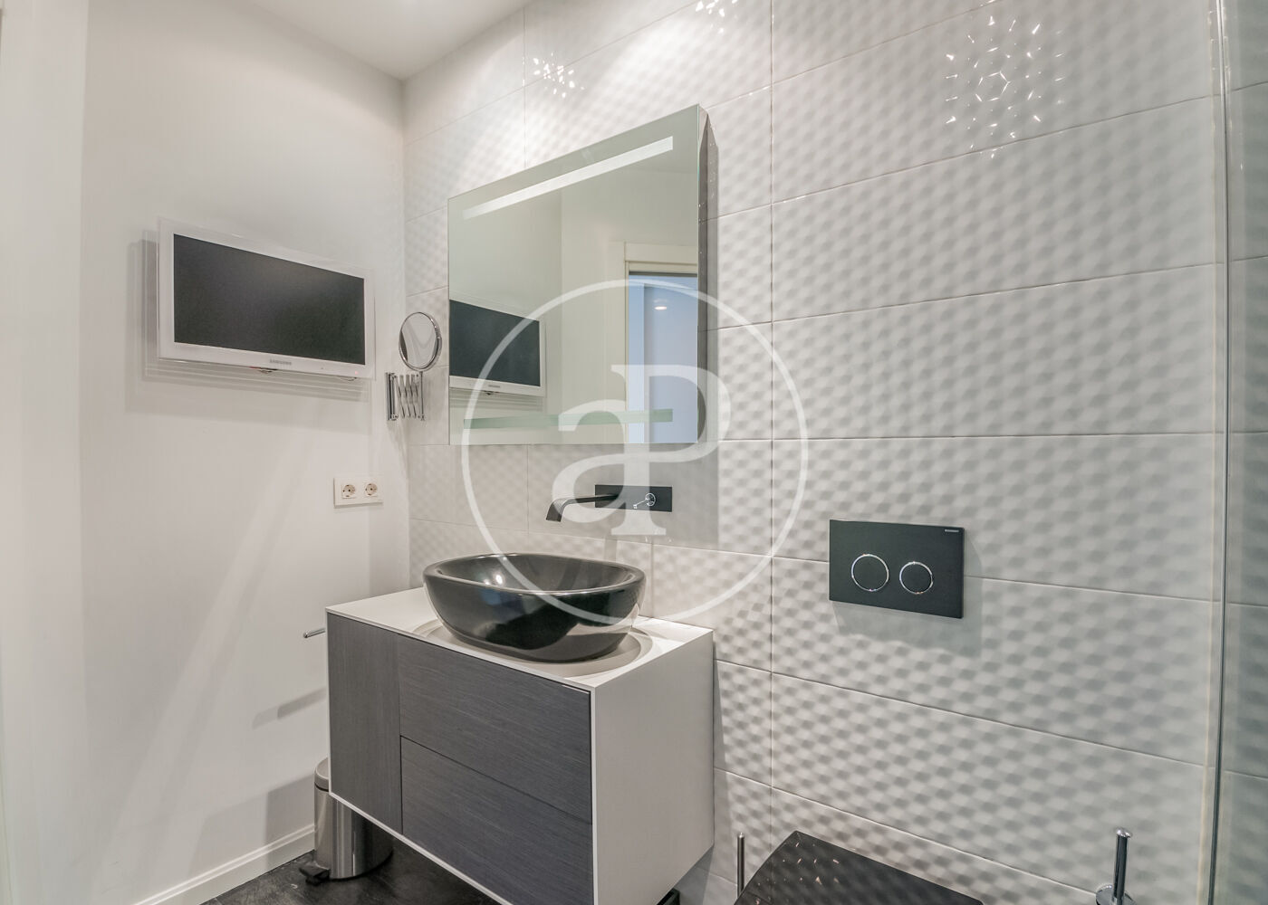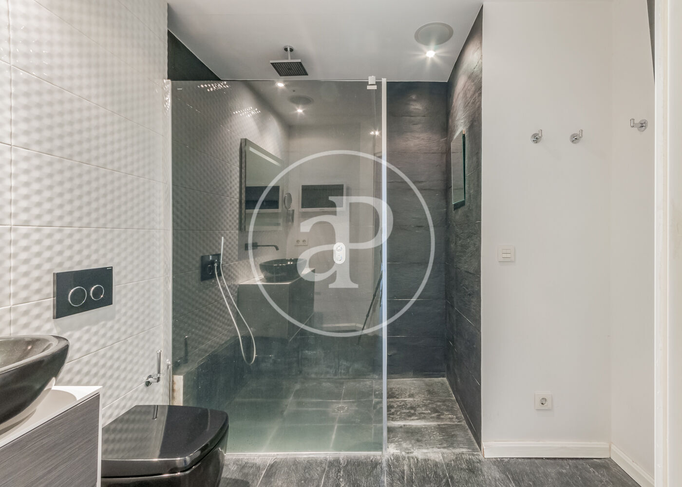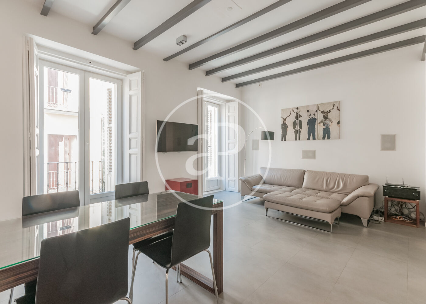 Loft-style apartment of 68m2. The bright living room features exposed iron and wood beams, 3.5-meter-high ceilings, and three classic balconies overlooking the street. The open-plan kitchen, by the Italian brand Banni, comes fully equipped with Bosch appliances: refrigerator, freezer, dishwasher, oven, microwave, wine cooler, induction hob, grill, etc. The apartment has two bedrooms with sliding glass doors. One has a queen-size bed, and the other has a 135cm bed. The second bedroom has two built-in wardrobes, one for shoes and one for clothes. Both bedrooms are very quiet and located on the interior side of the apartment.